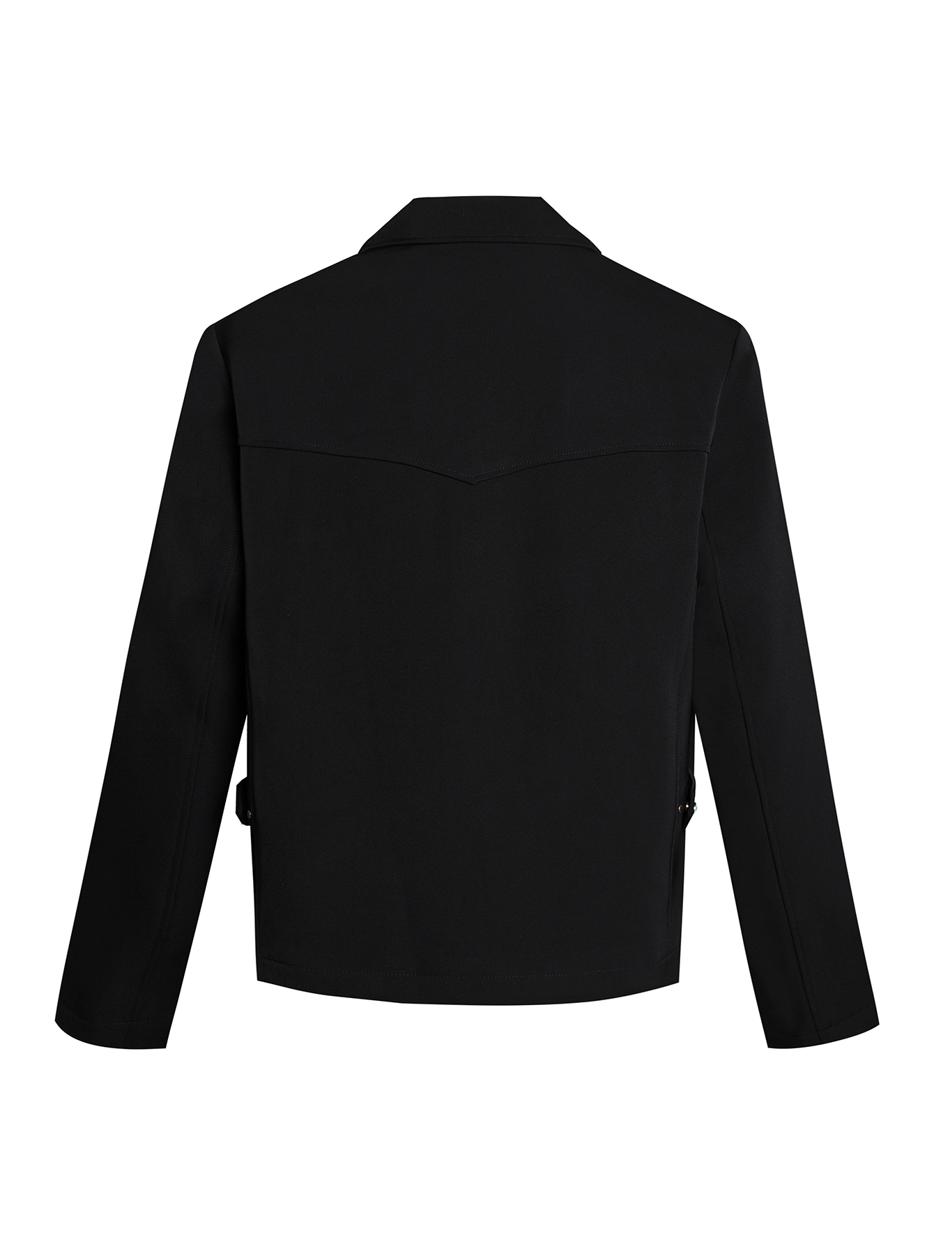 Tags: Designer Casual Jacket, Relaxed Fit Blazer, Solid Black Outerwear, Turquoise Button Jacket, Wool Blend Jacket
