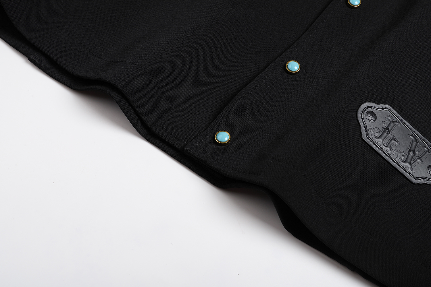 Elevate your style with this Louis Vuitton wool blend jacket. Features a relaxed fit, solid black color, and unique turquoise button accents.