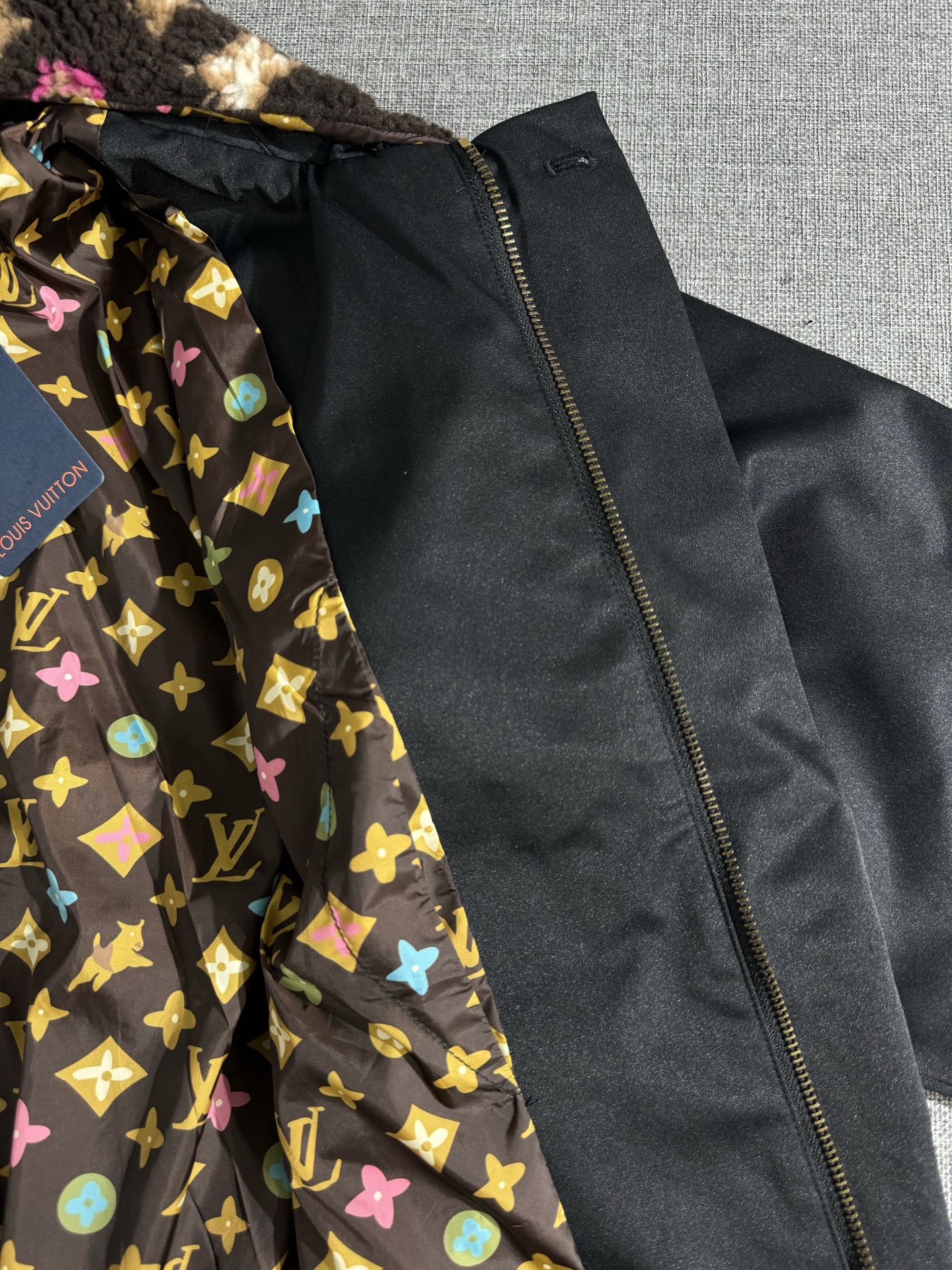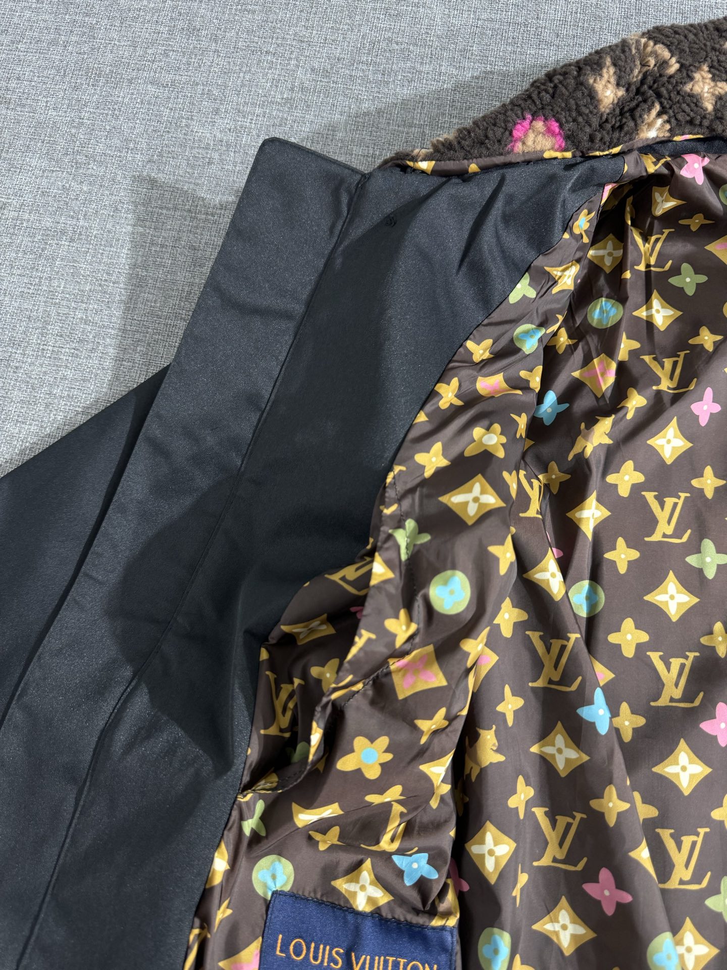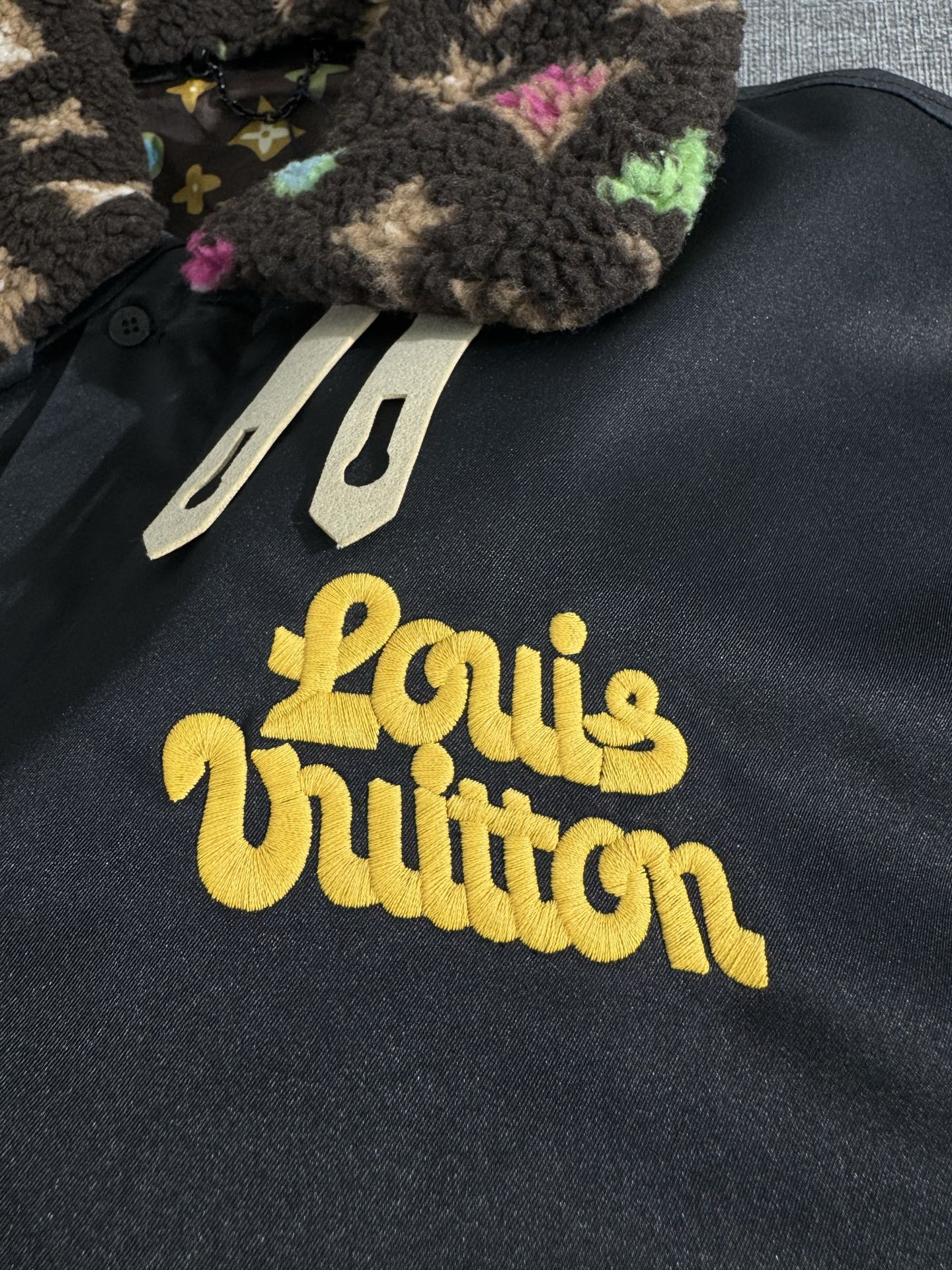 Elevate your style with this jacket featuring a unique LV monogram and a plush, detachable fur collar. Perfect for a statement look.