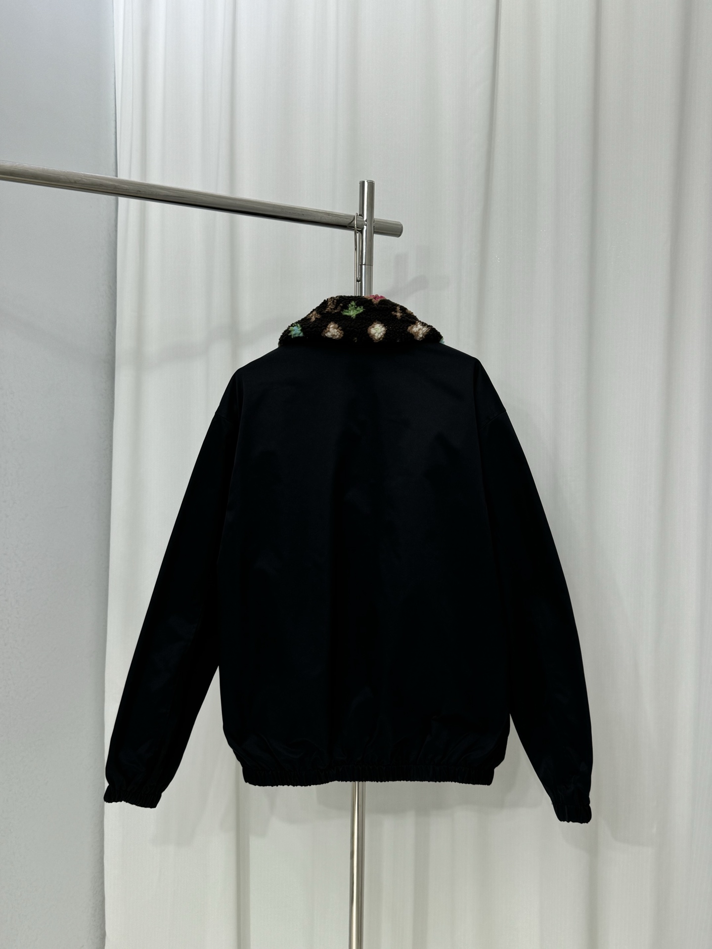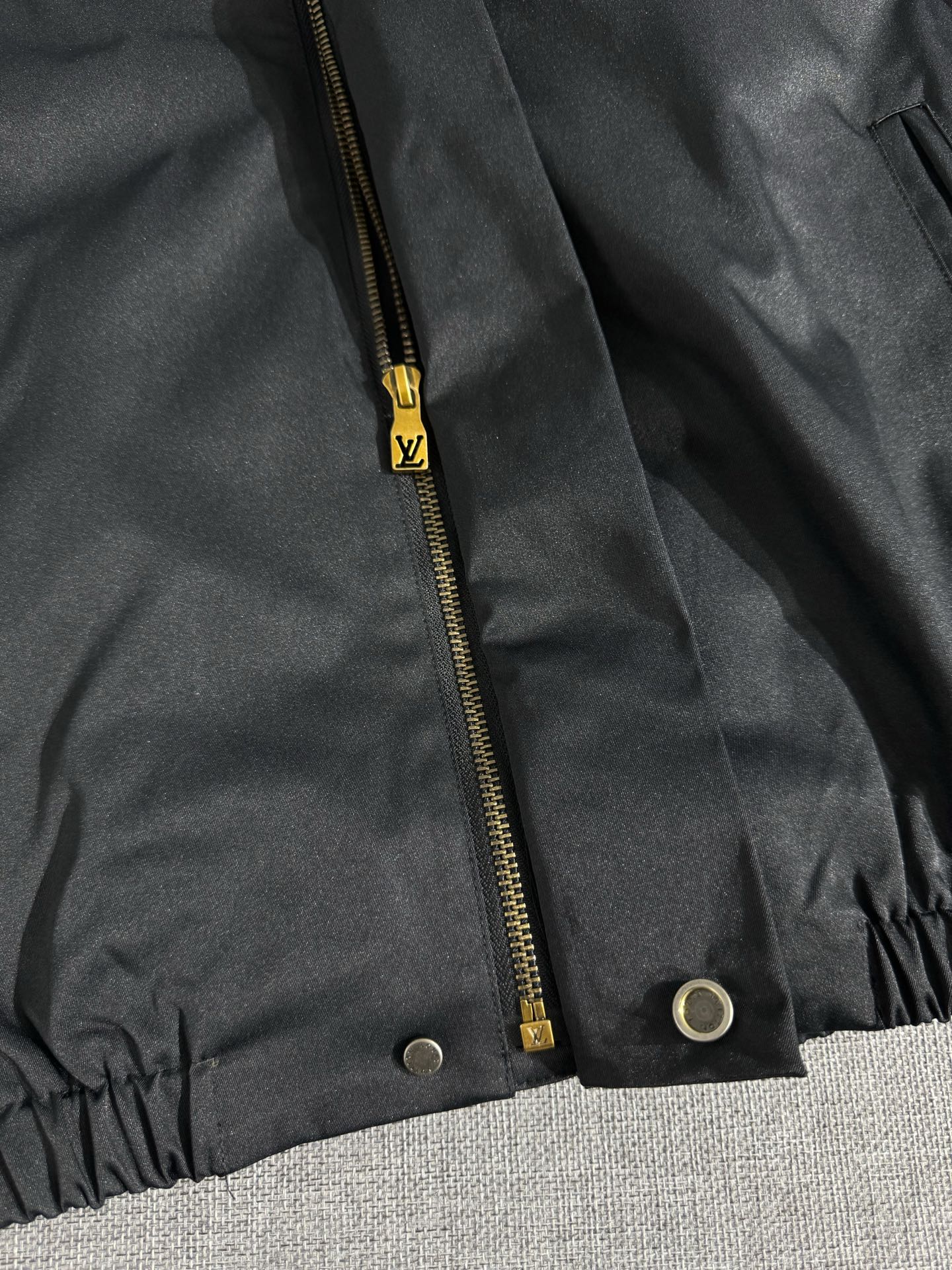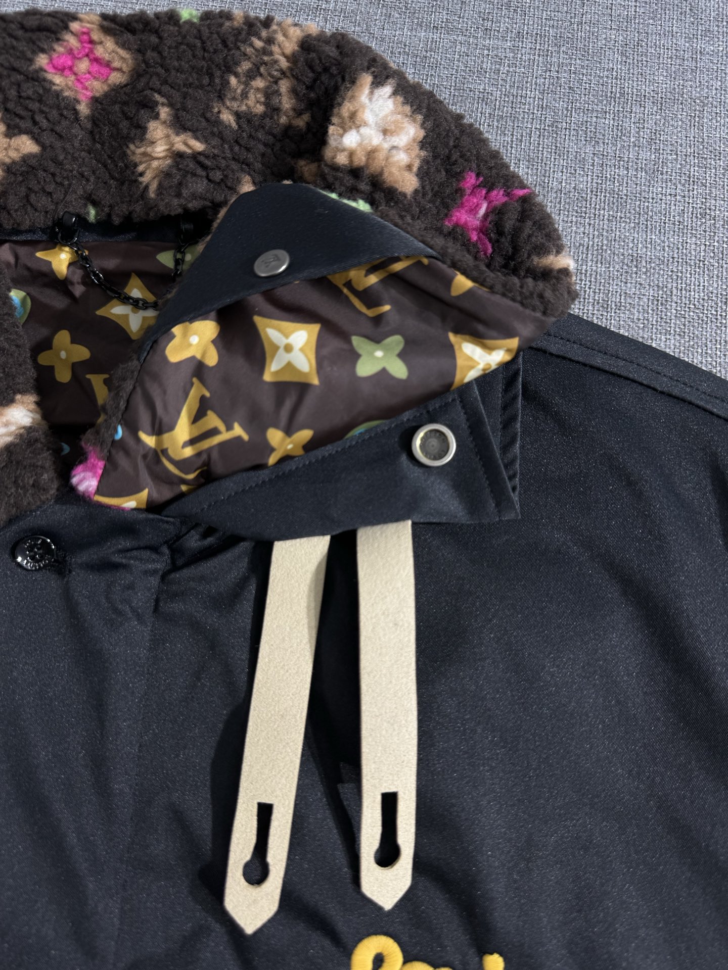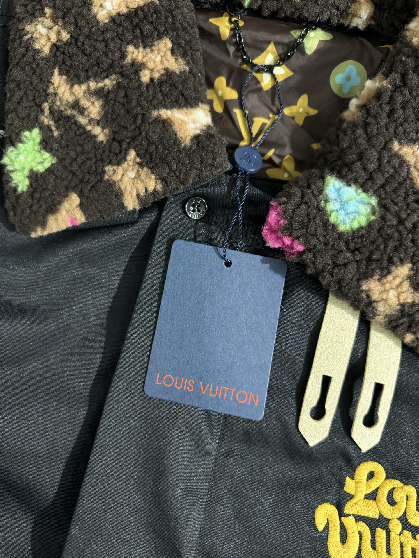 Elevate your style with this jacket featuring a unique LV monogram and a plush, detachable fur collar. Perfect for a statement look.