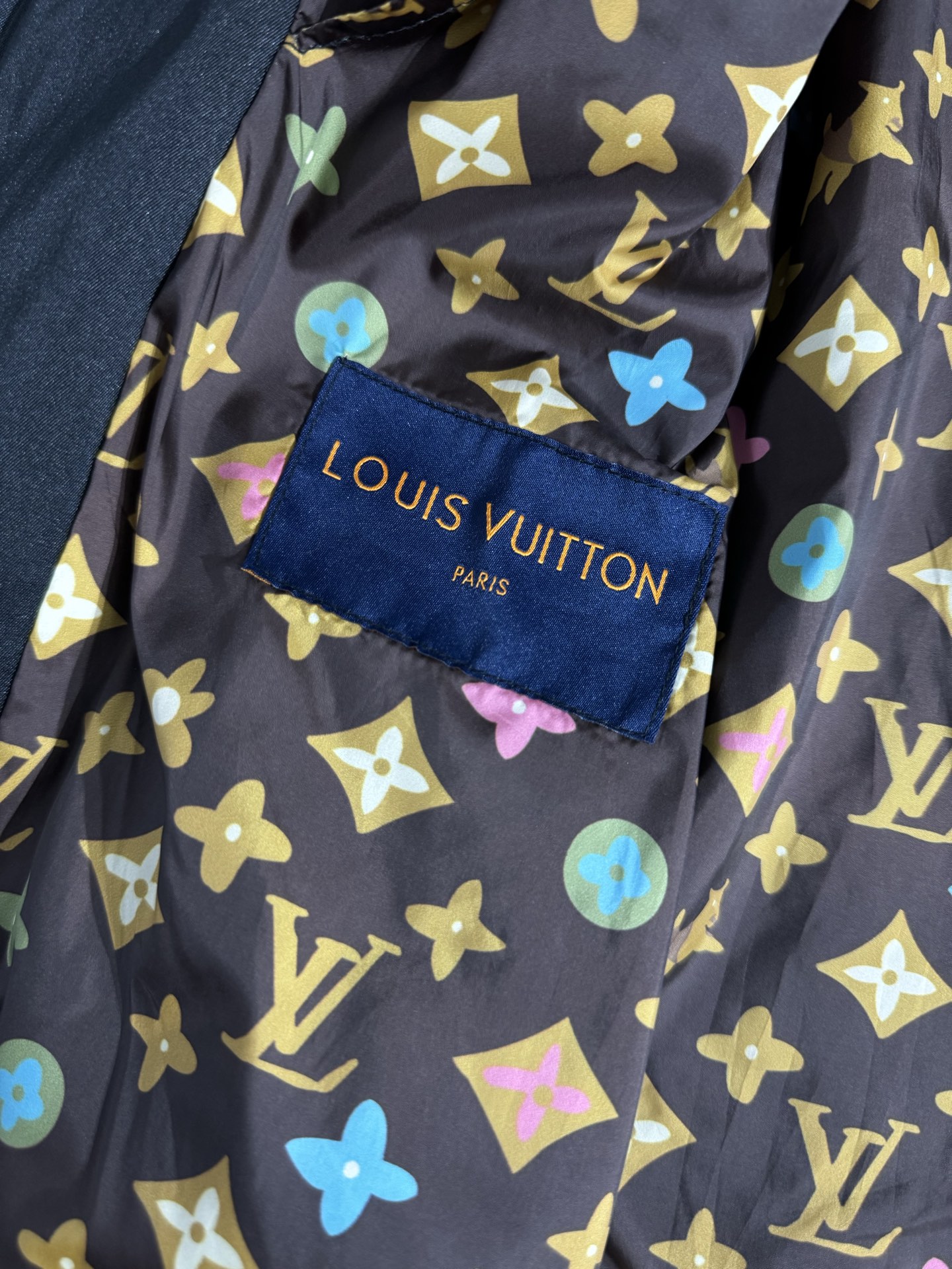 This Louis Vuitton x Tyler The Creator jacket is a statement piece that blends high fashion with streetwear sensibilities. Featuring the iconic Louis Vuitton monogram and a plush, removable fur collar, this jacket offers both style and versatility.