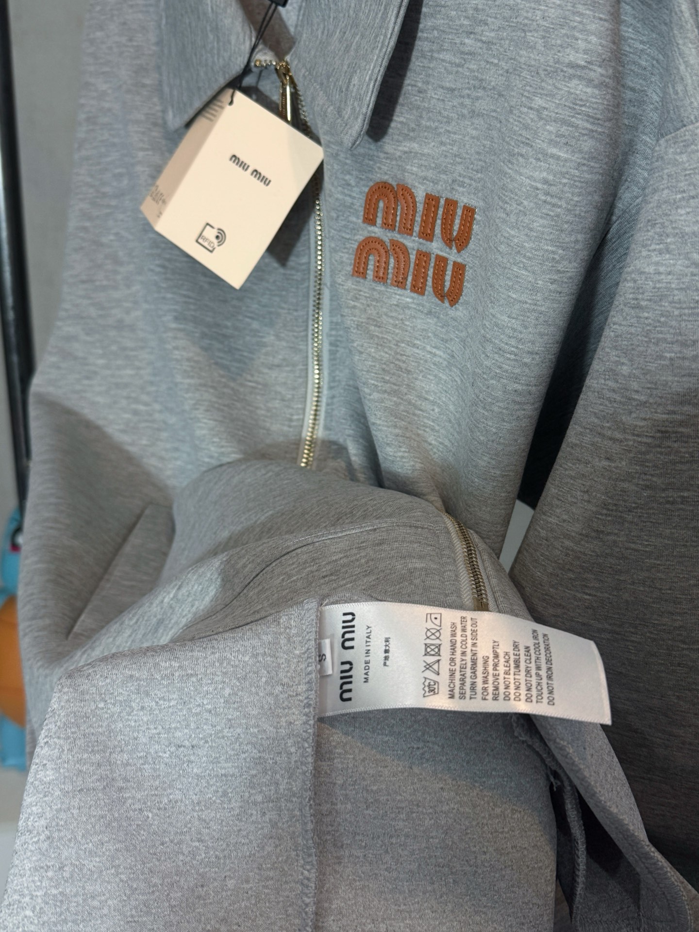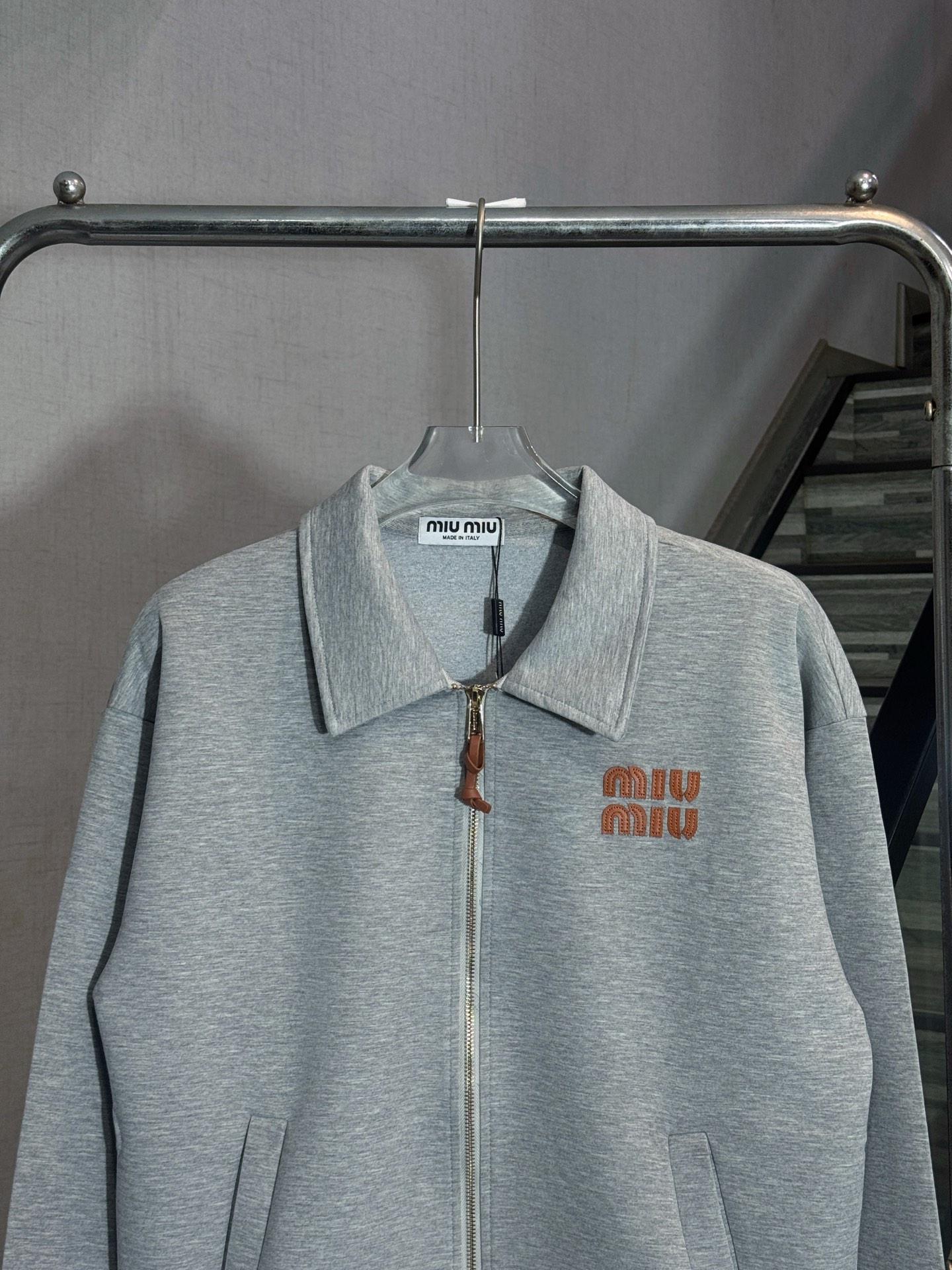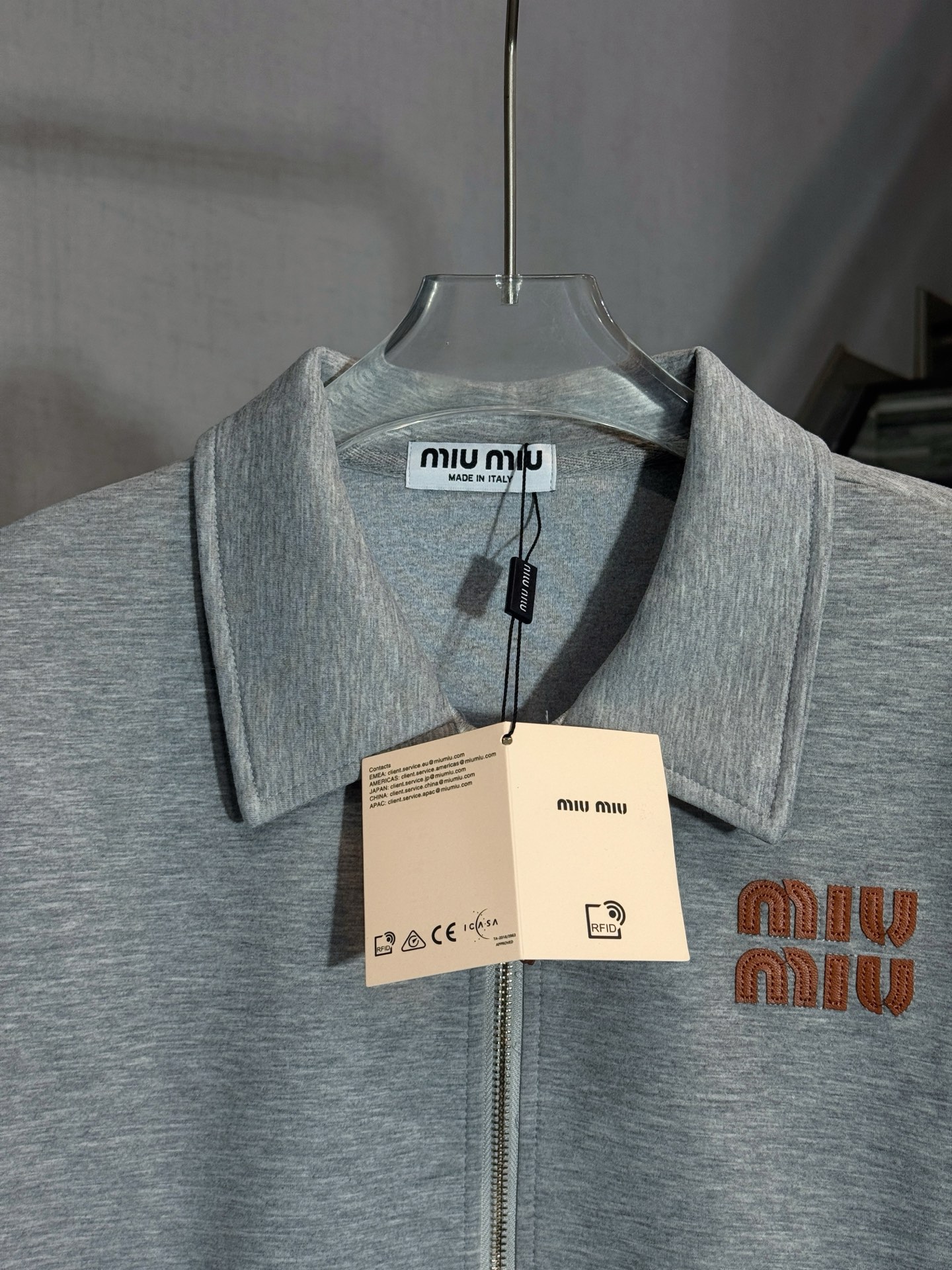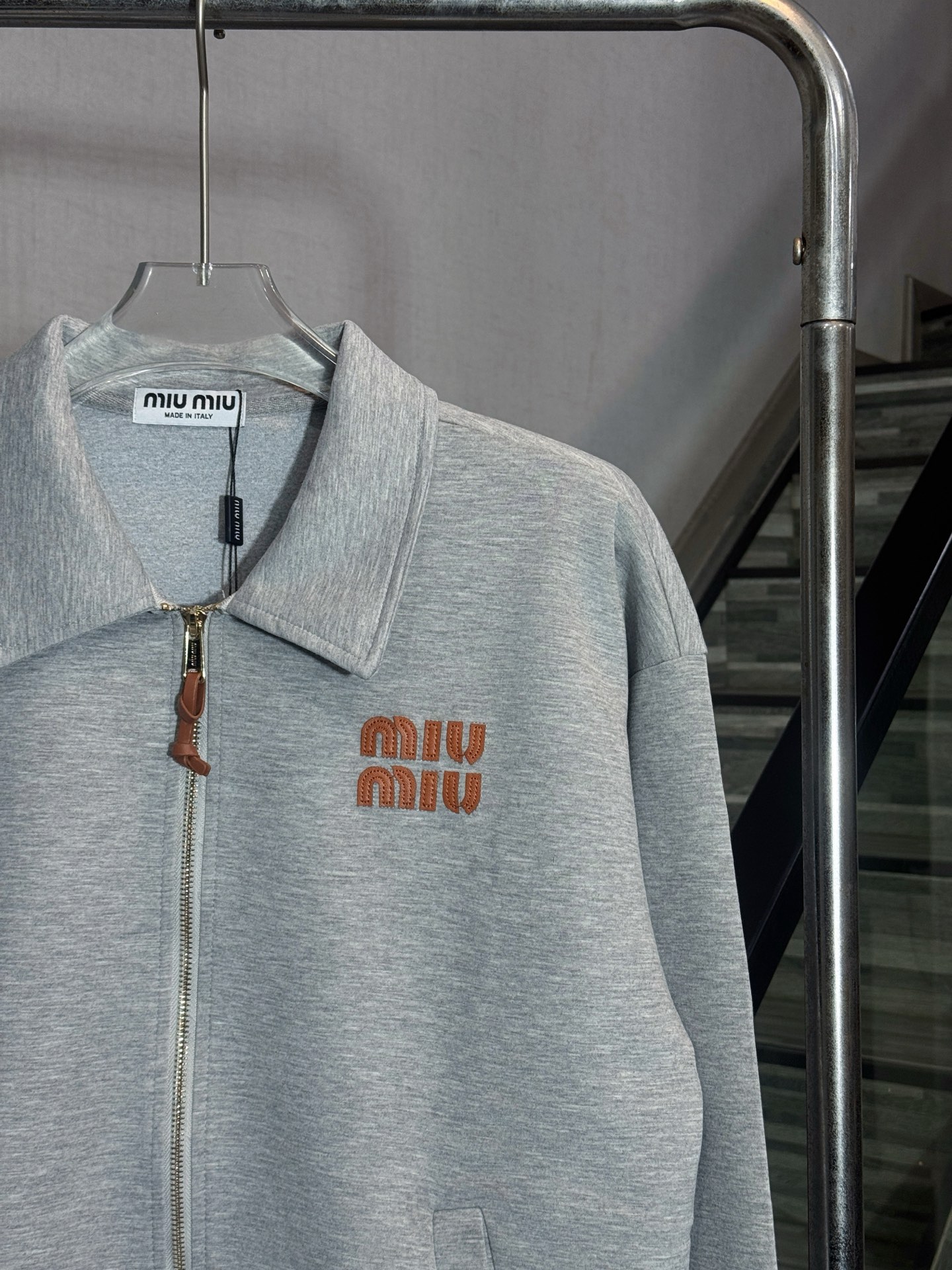 Tags: Cotton Blend Jacket, Designer Outerwear, Embroidered Logo Jacket, Luxury Casual Wear, Miu Miu Jacket, Zip Up Jacket