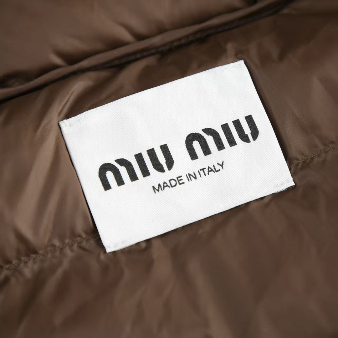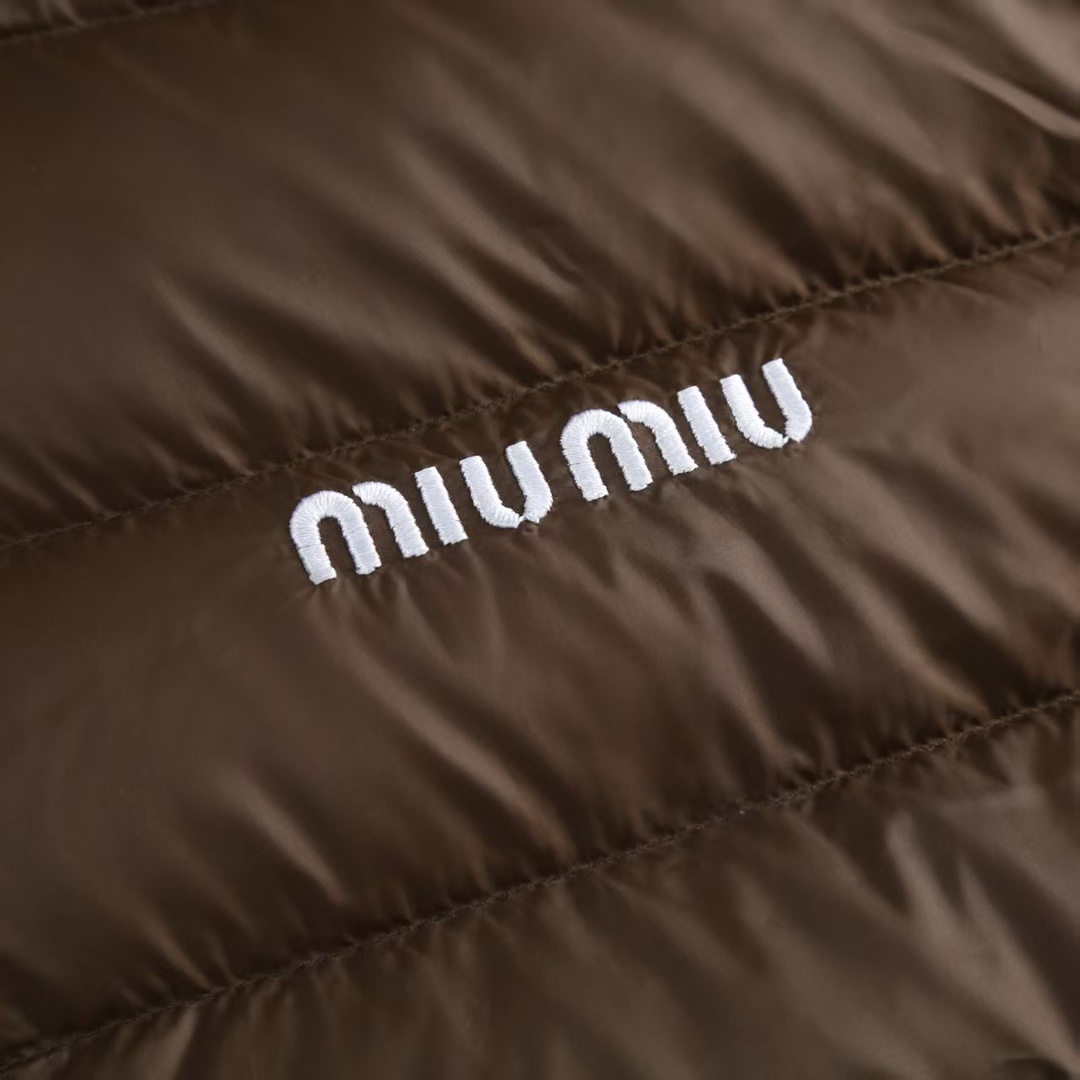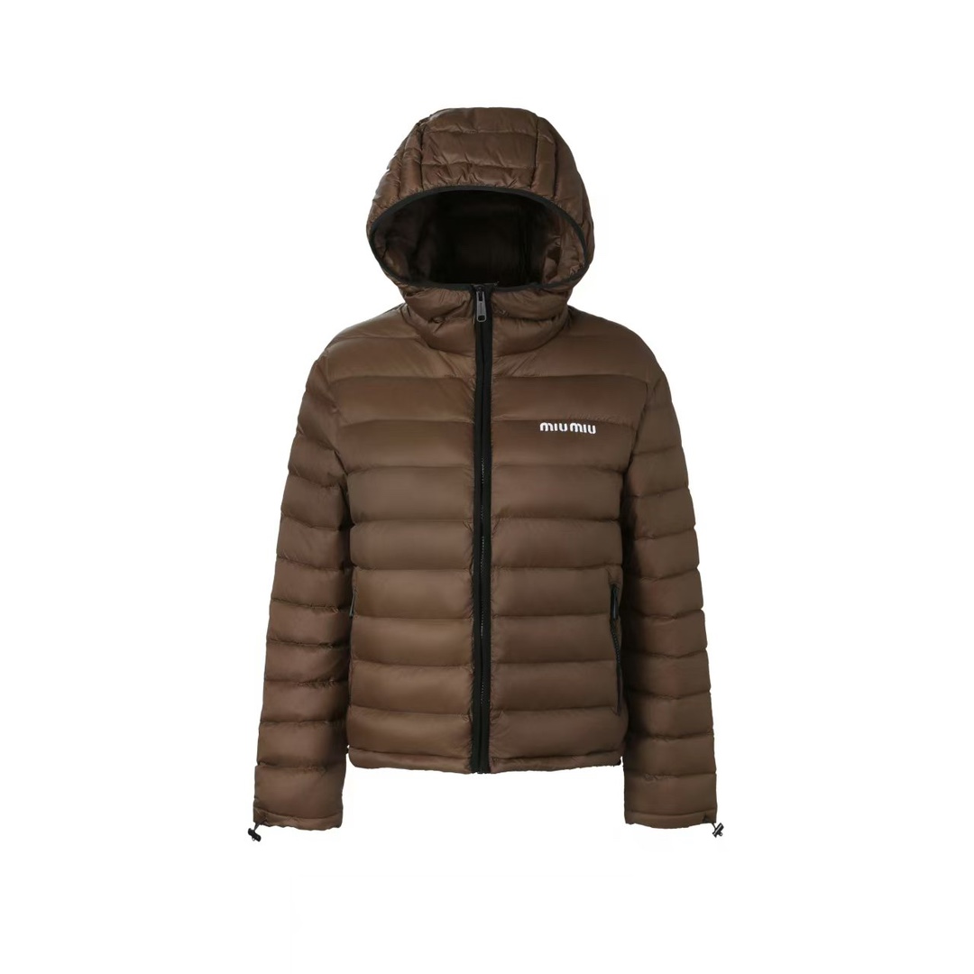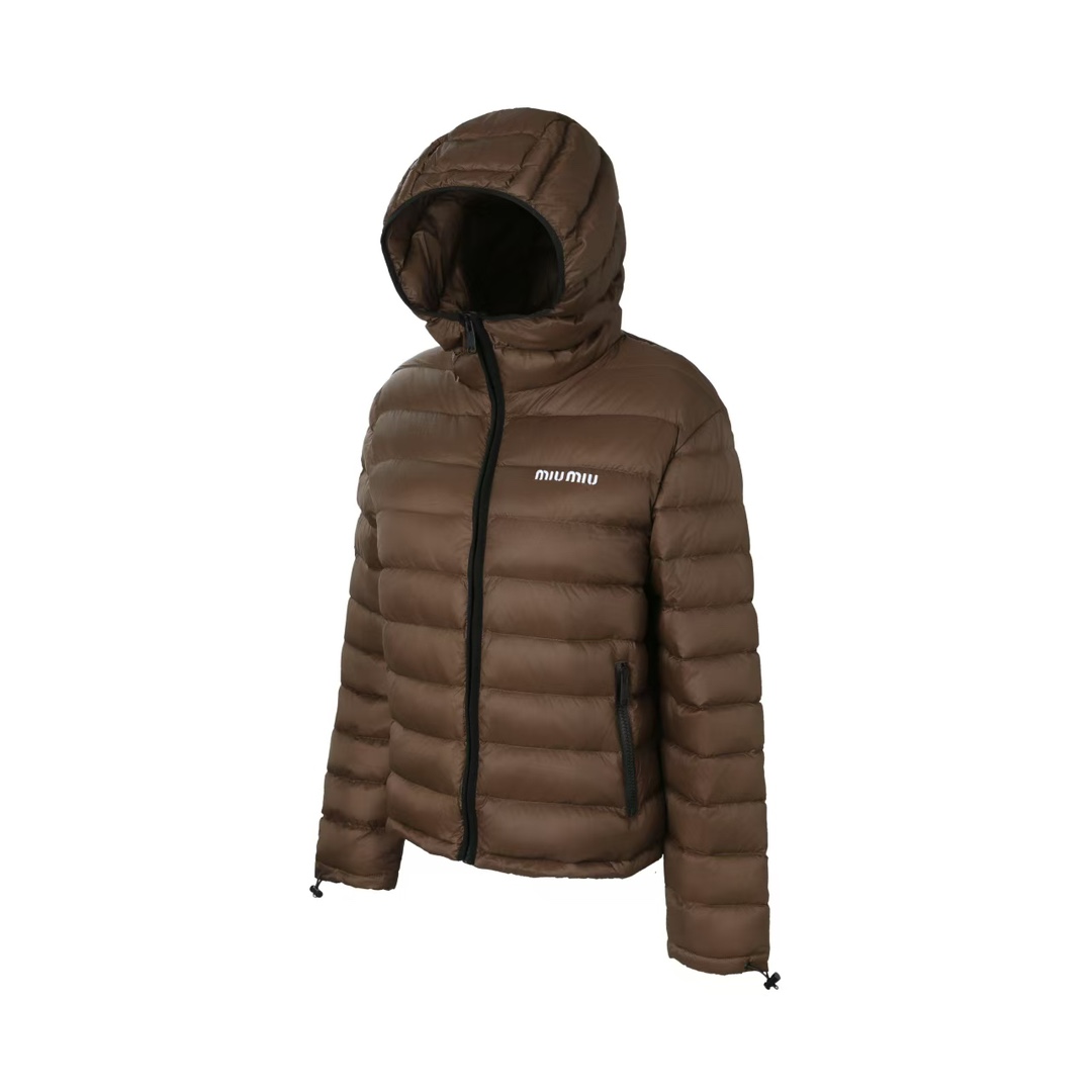 Tags: Designer Winter Jacket, Hooded Winter Coat, Lightweight Warm Jacket, Luxury Outerwear, Miu Miu Down Jacket, Nylon Down Puffer