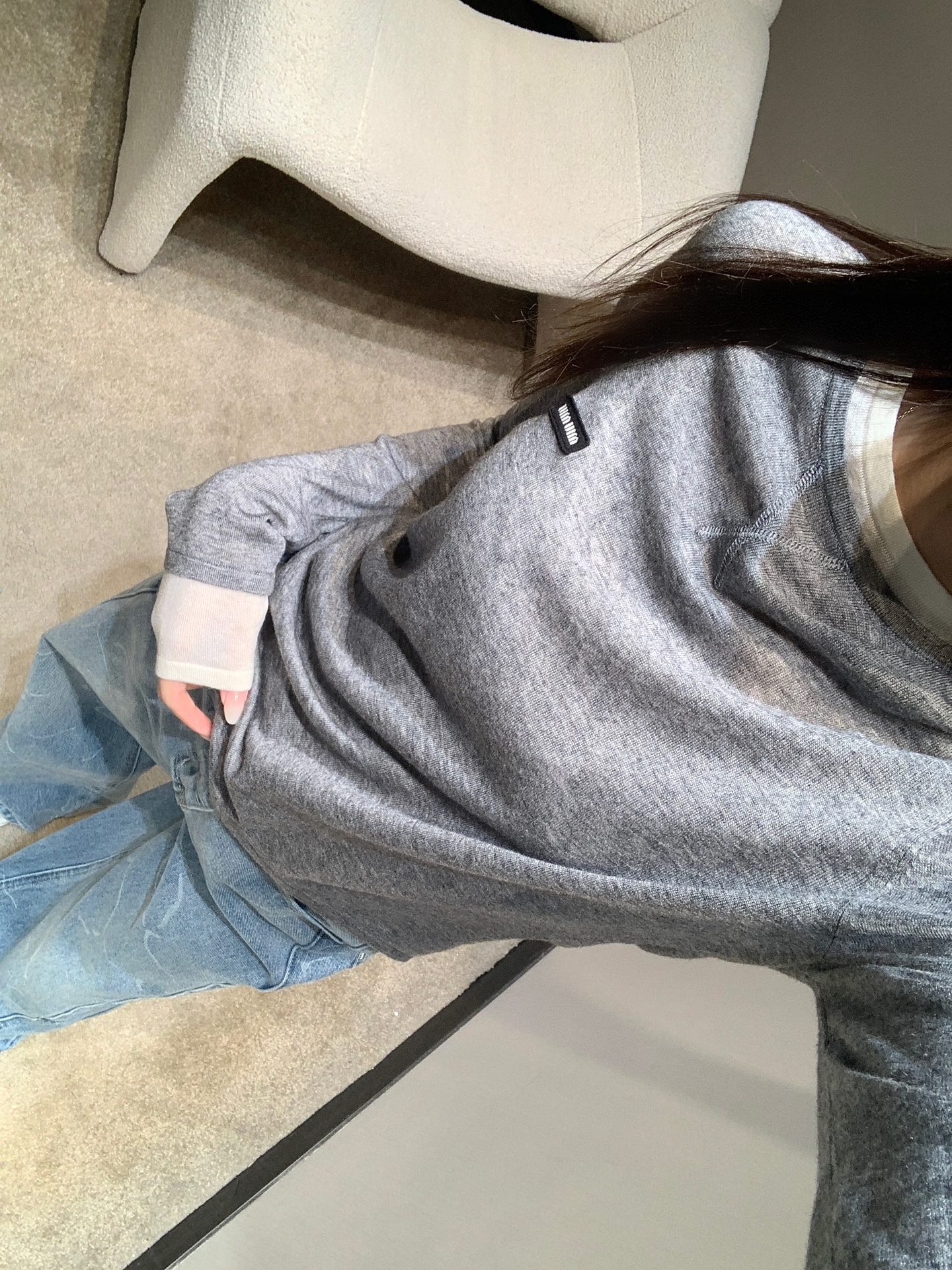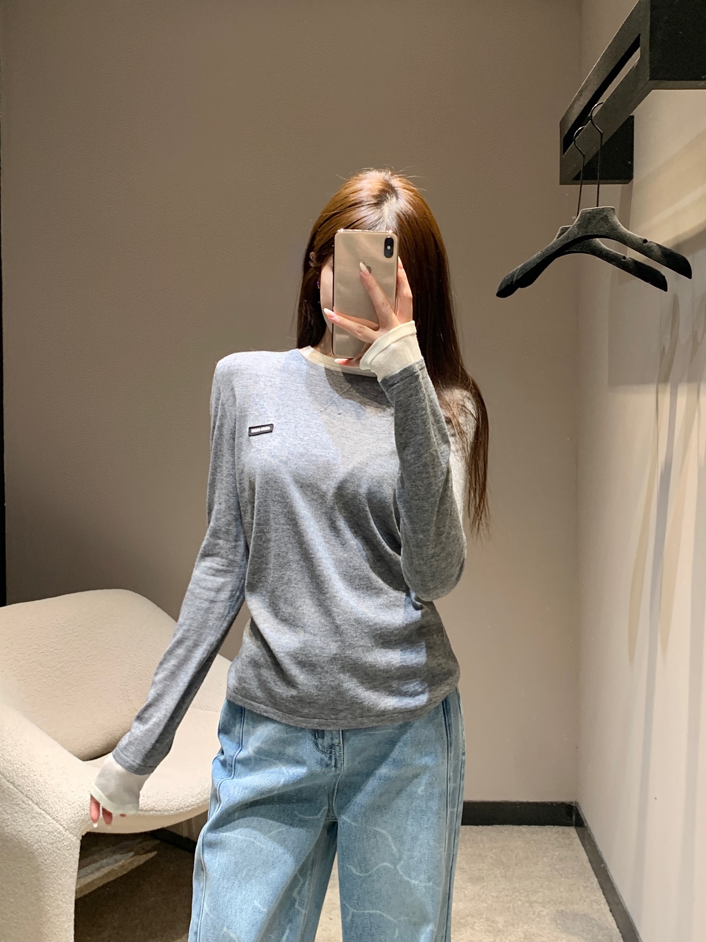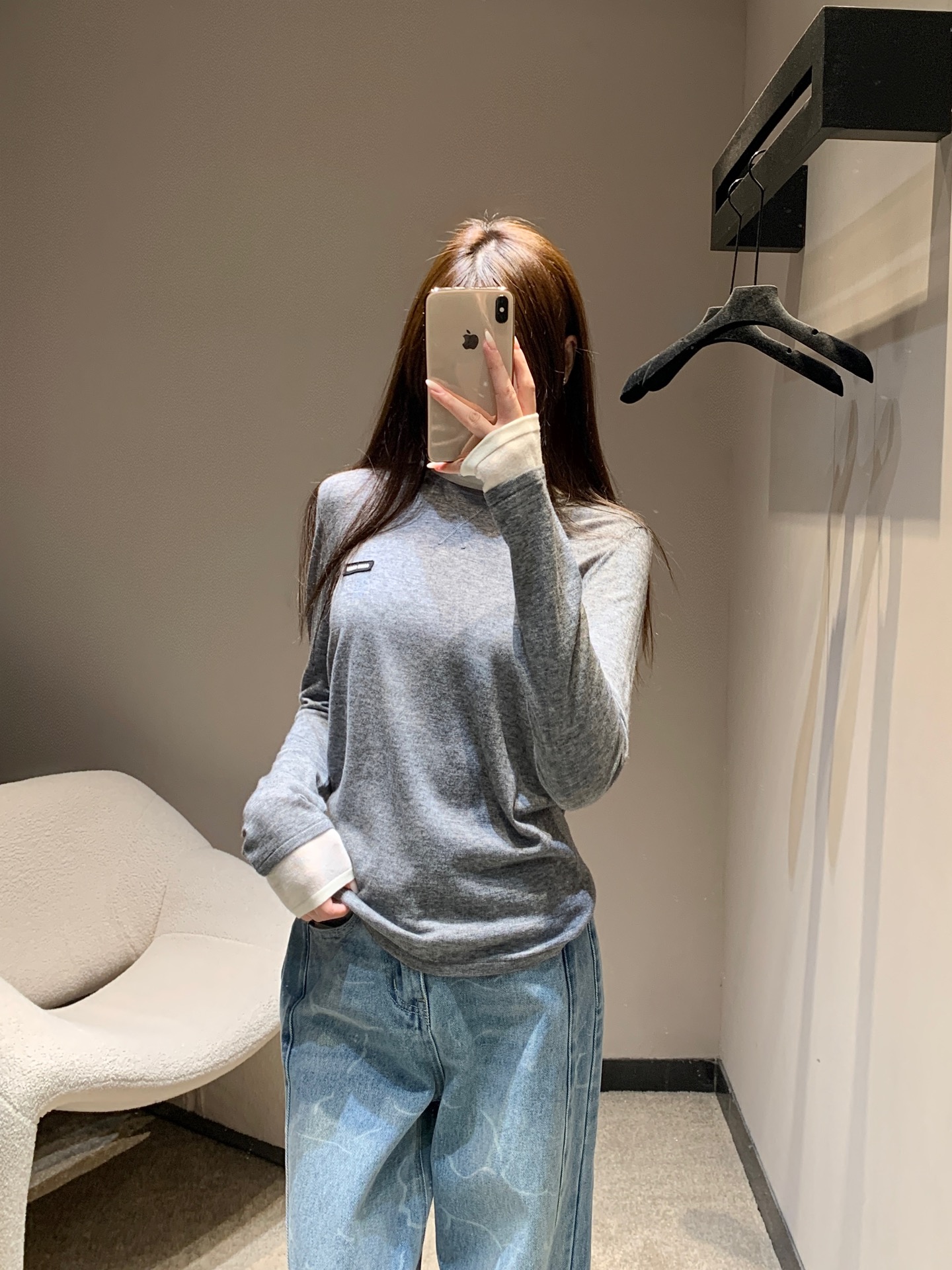 Tags: Casual Layered Top, Designer Long Sleeve Shirt, Elegant Women's Top, Miu Miu Long Sleeve Top, Wool Blend Layered T-Shirt