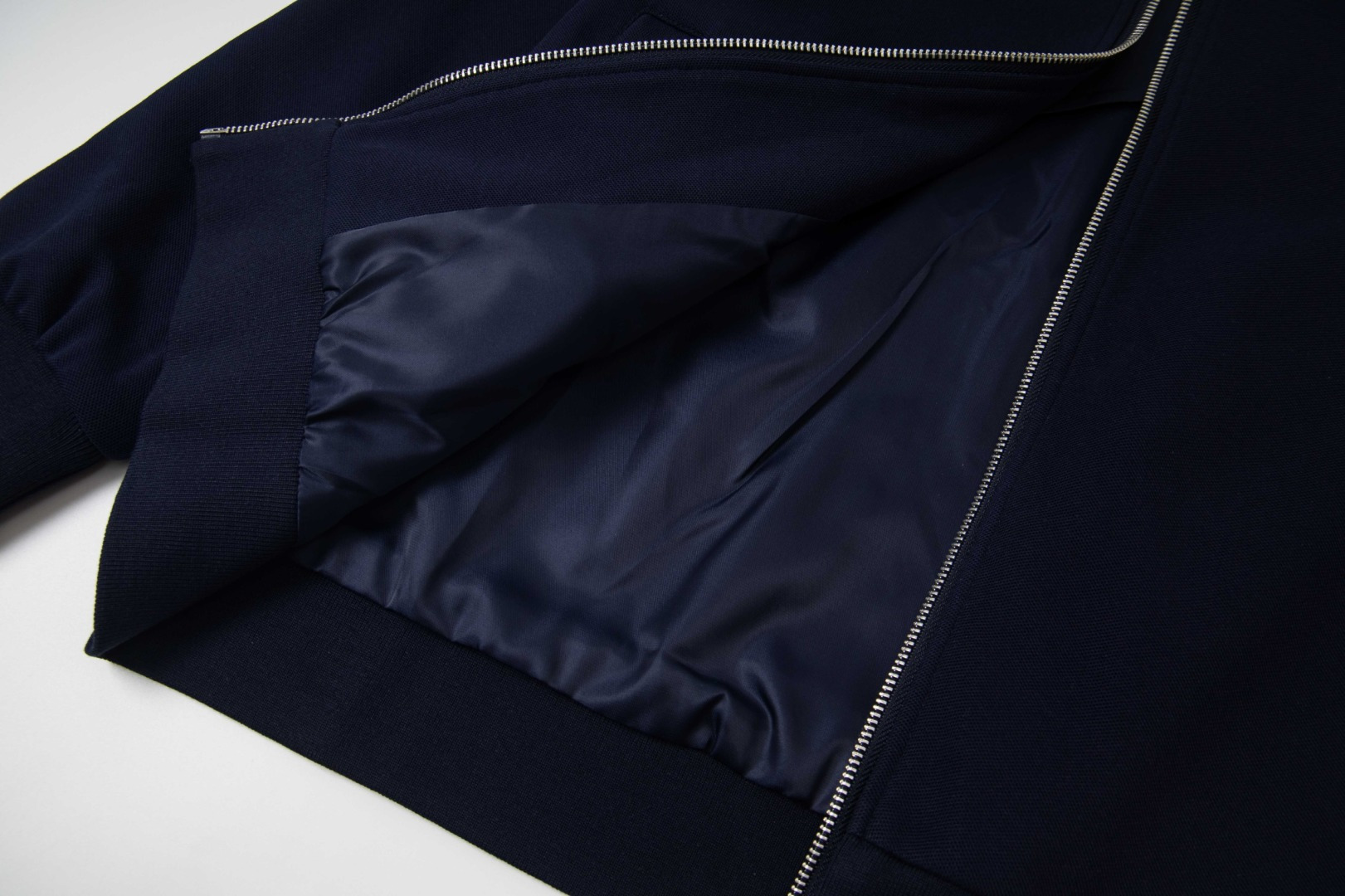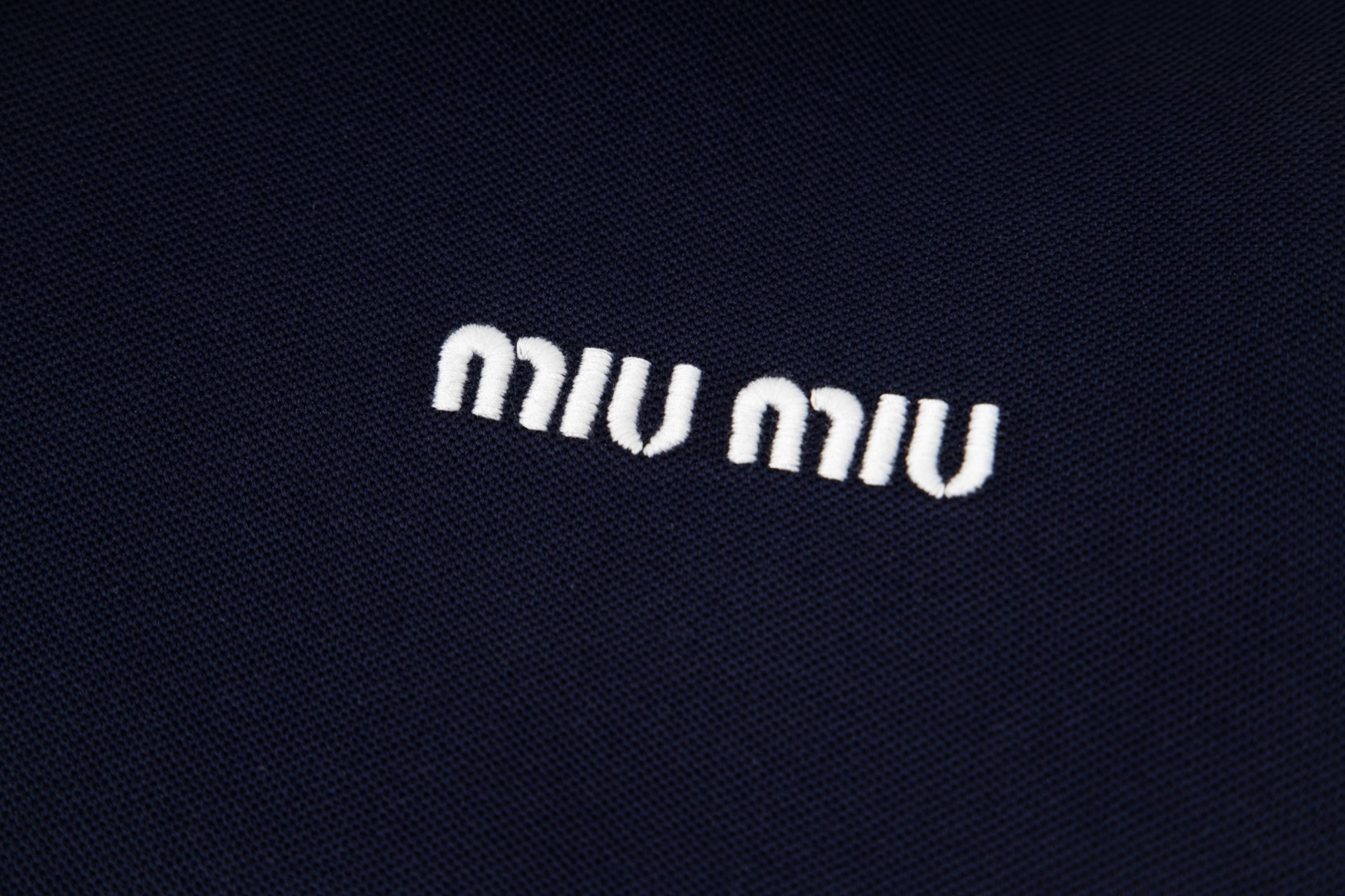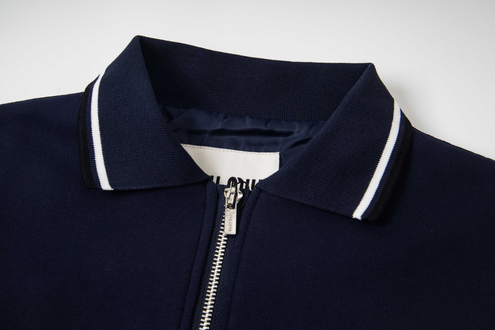 Elevate your style with this Miu Miu zip-up jacket. Navy knit with a contrast collar, perfect for a chic, versatile look. A must-have for any wardrobe.