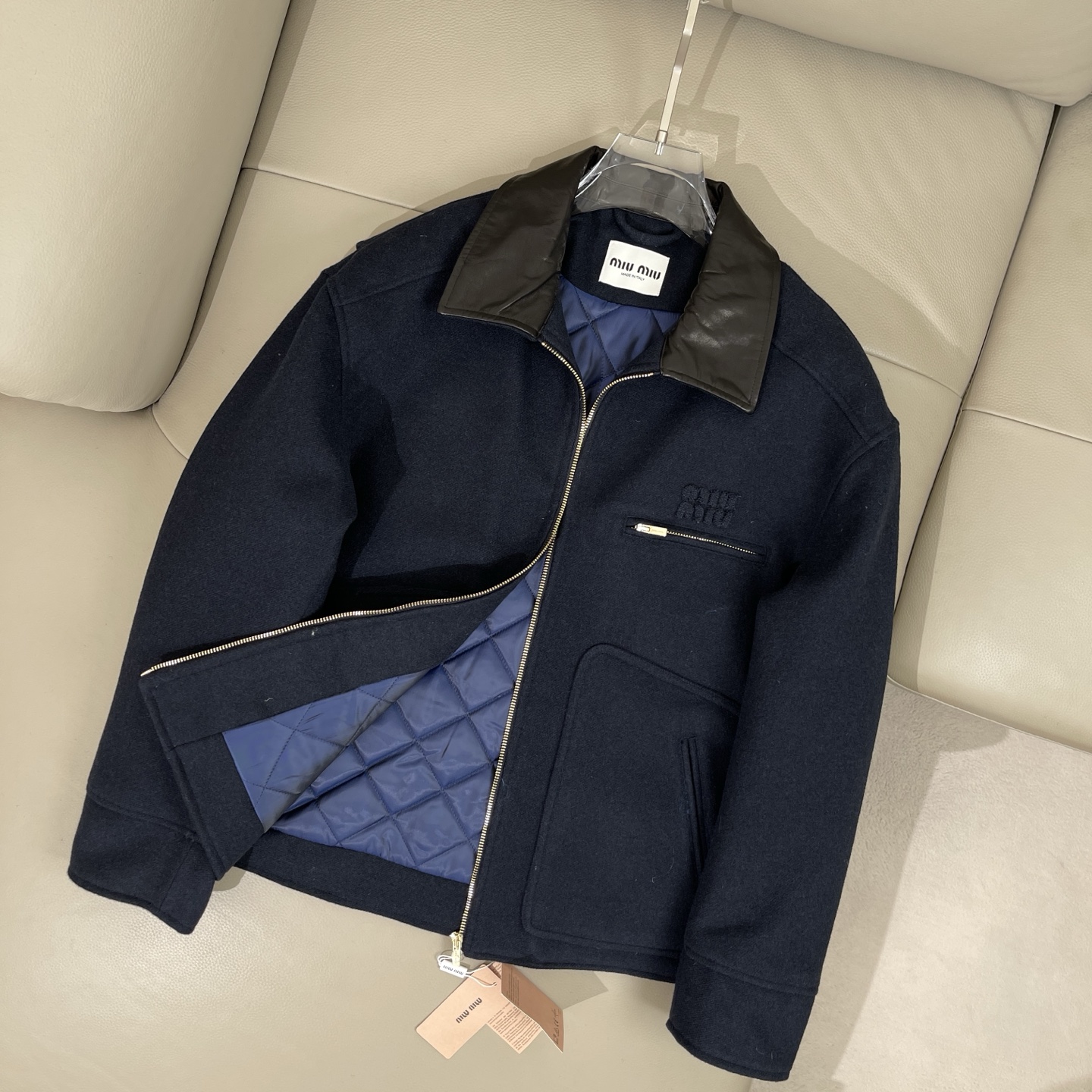 Tags: Embroidered Jacket, Leather Collar Jacket, Miu Miu Wool Jacket, Relaxed Fit Jacket, Wool Blend Outerwear