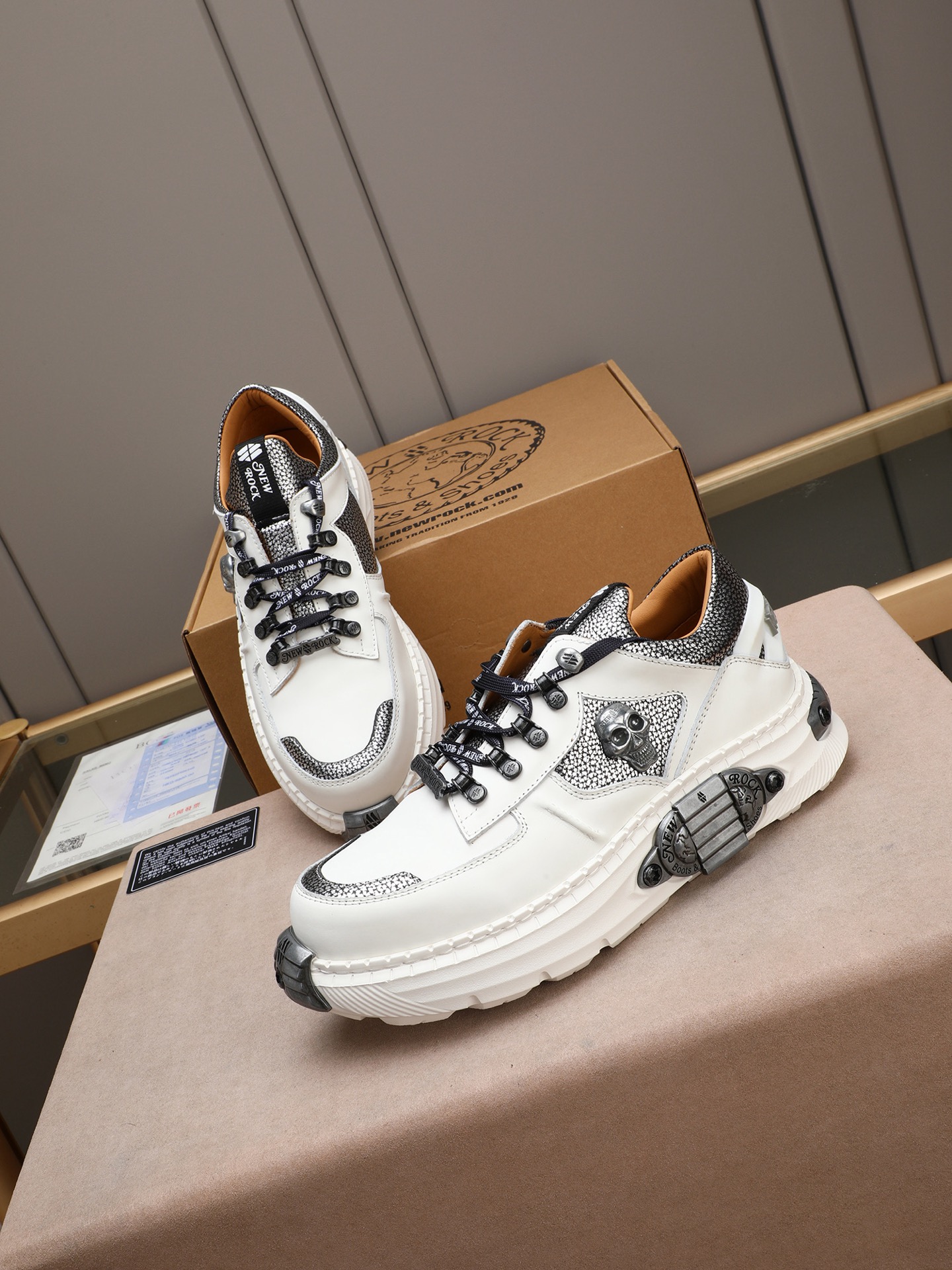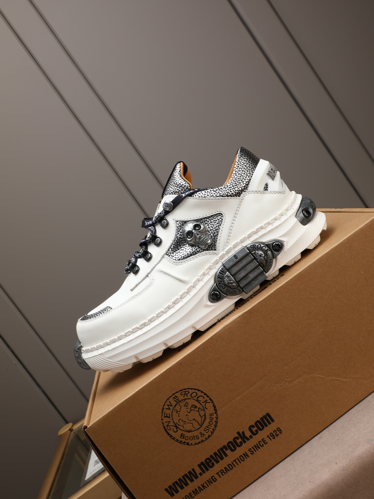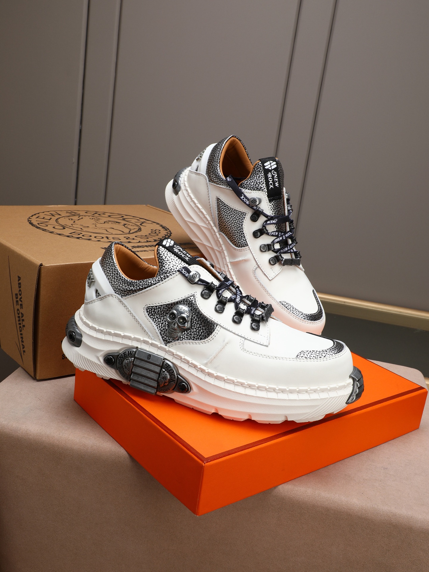 Step out in style with these punk rock-inspired New Rock sneakers. Featuring a tank tread sole, skull details, and premium leather construction.