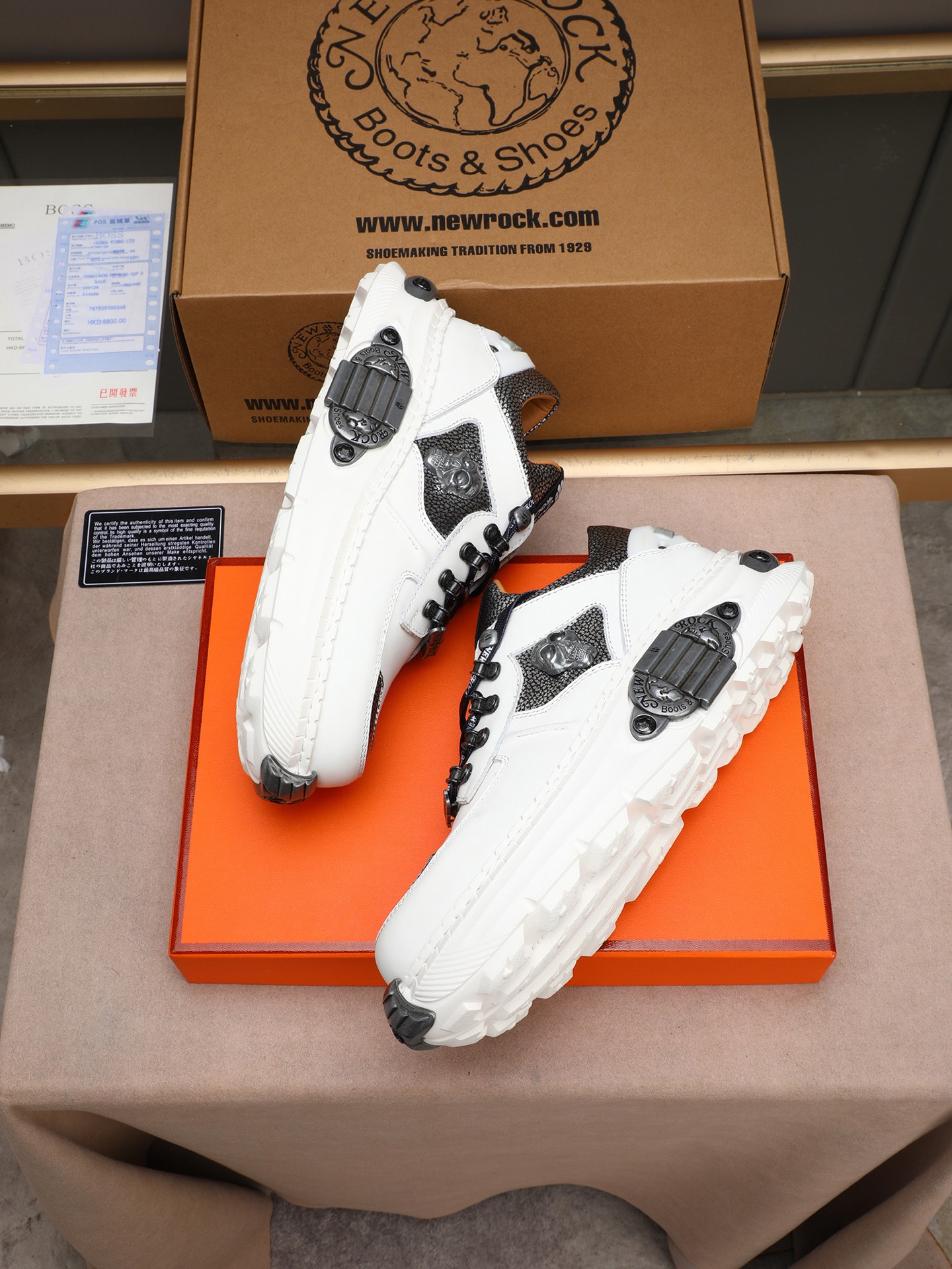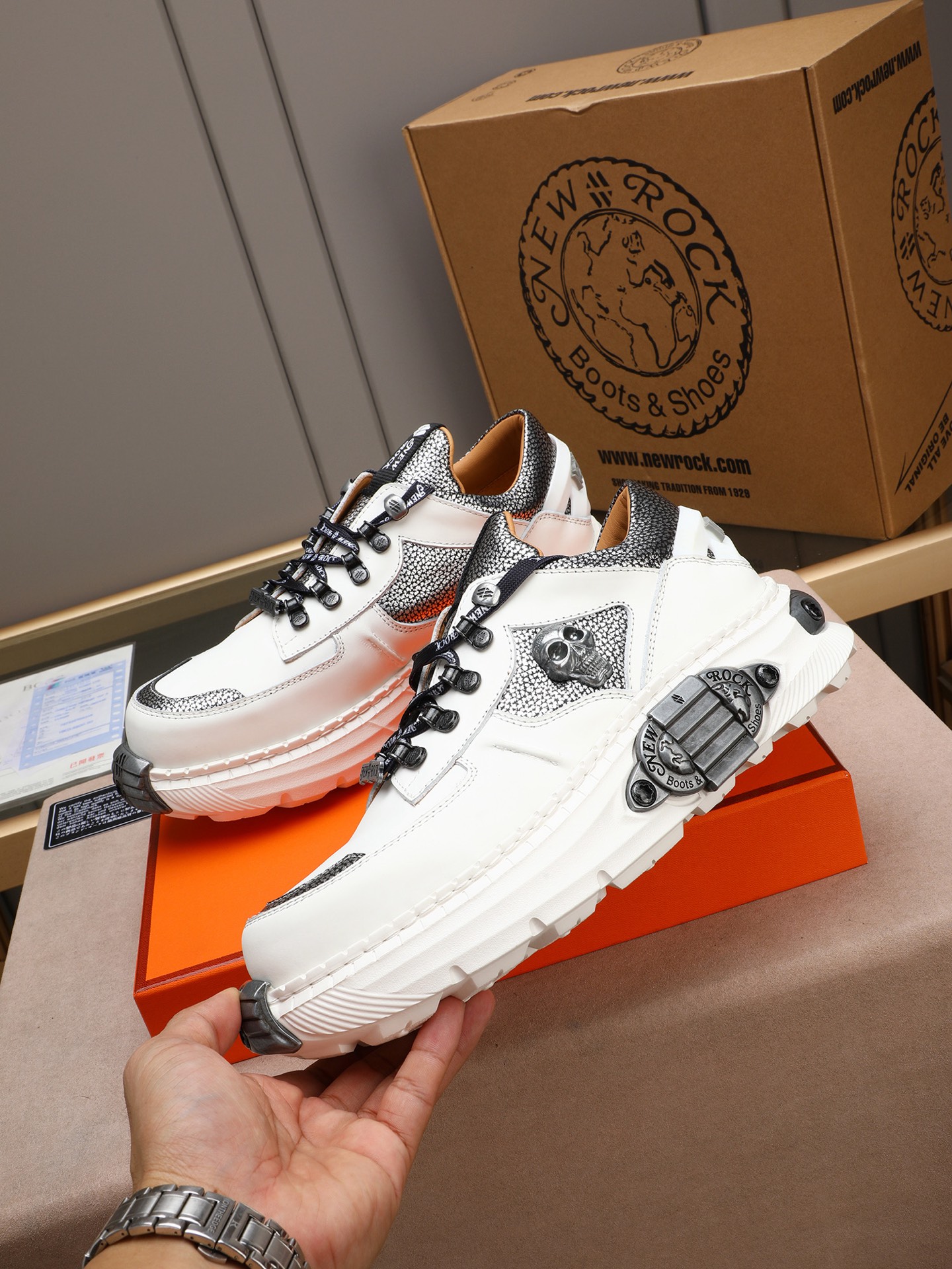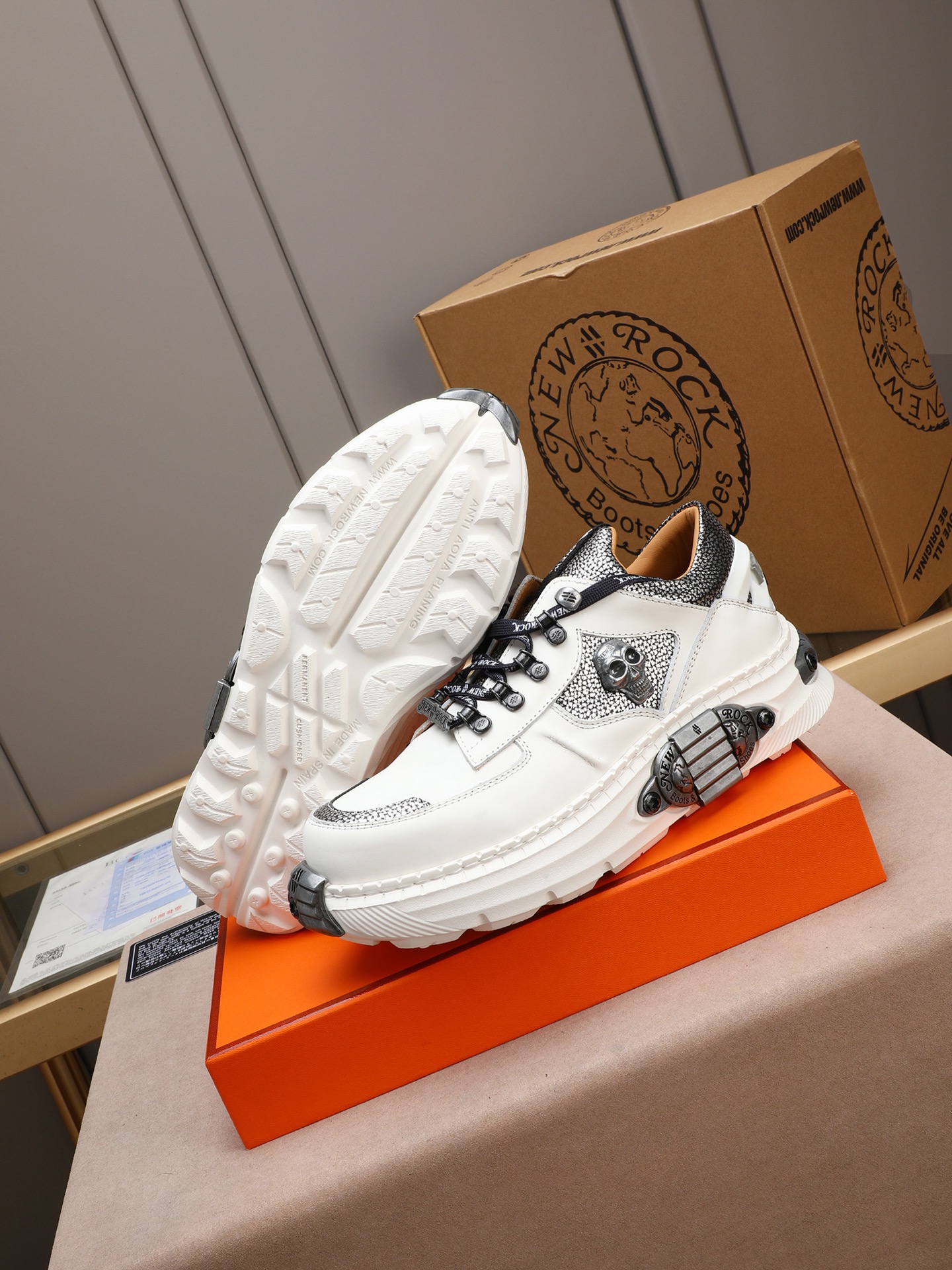 Step out in style with these punk rock-inspired New Rock sneakers. Featuring a tank tread sole, skull details, and premium leather construction.