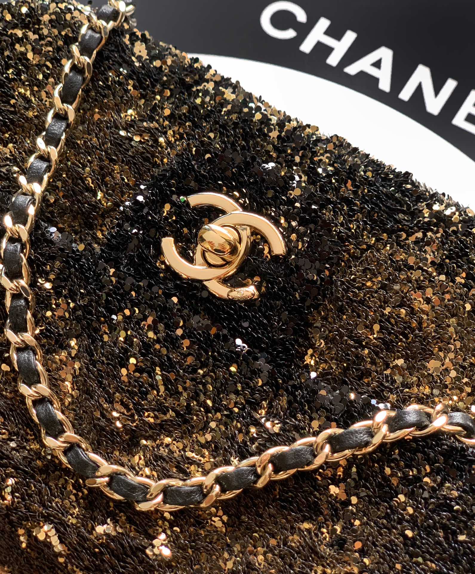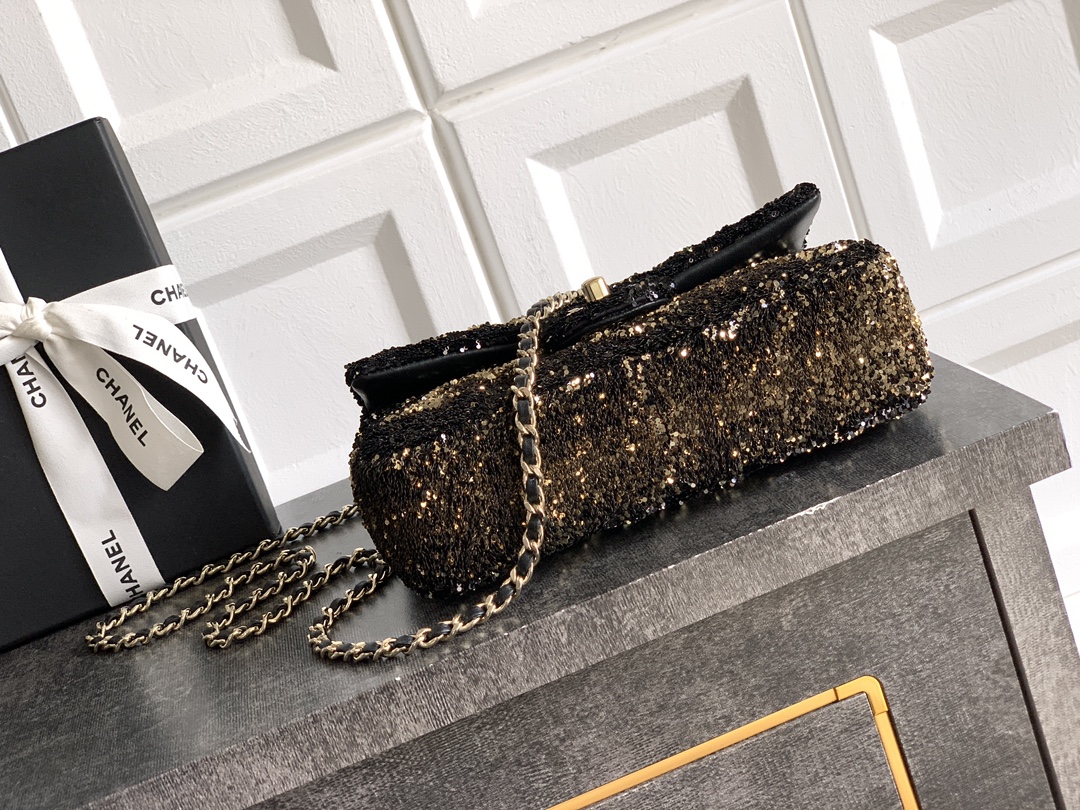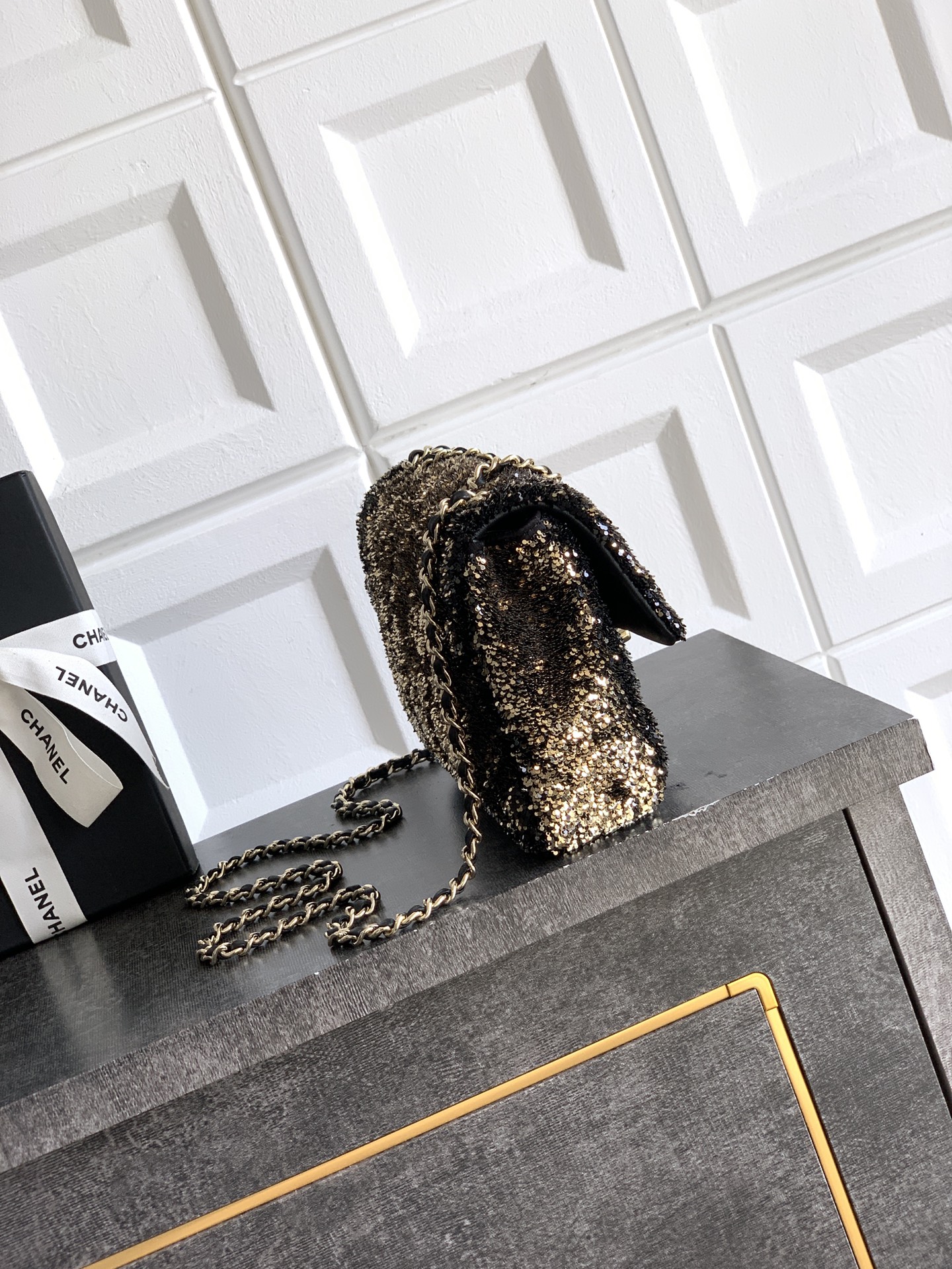 Dazzle with this OHANEL 25B flap bag. Features gold sequins, a chain strap, and the iconic design. Perfect for adding sparkle to any outfit. 20cm.