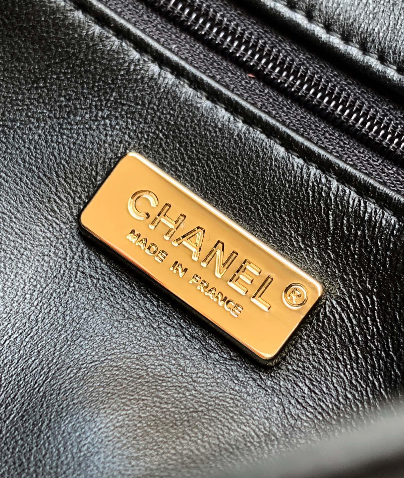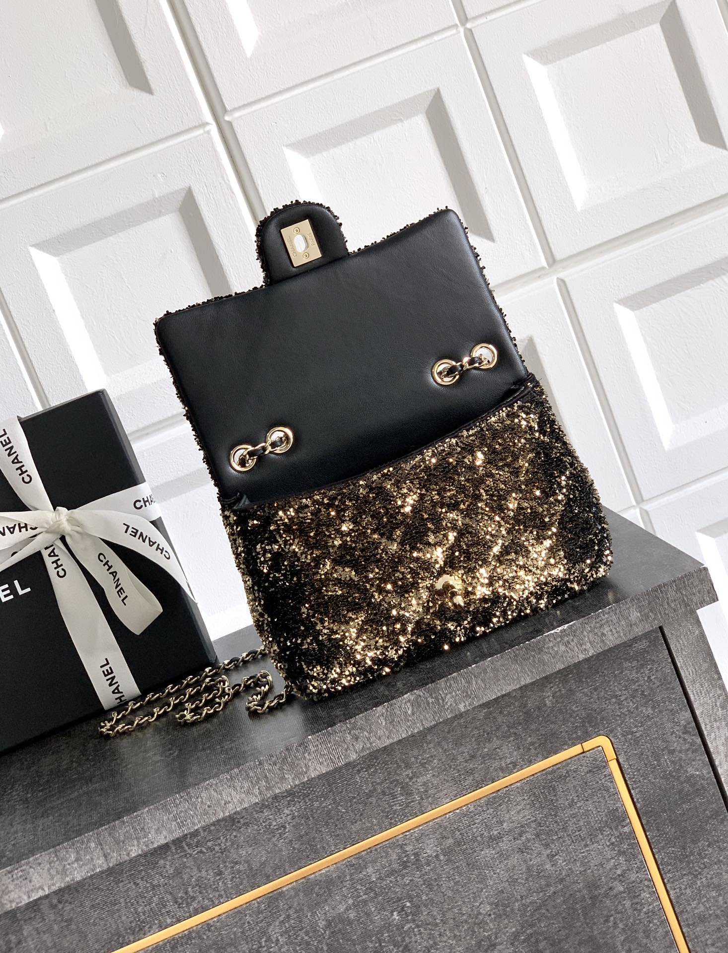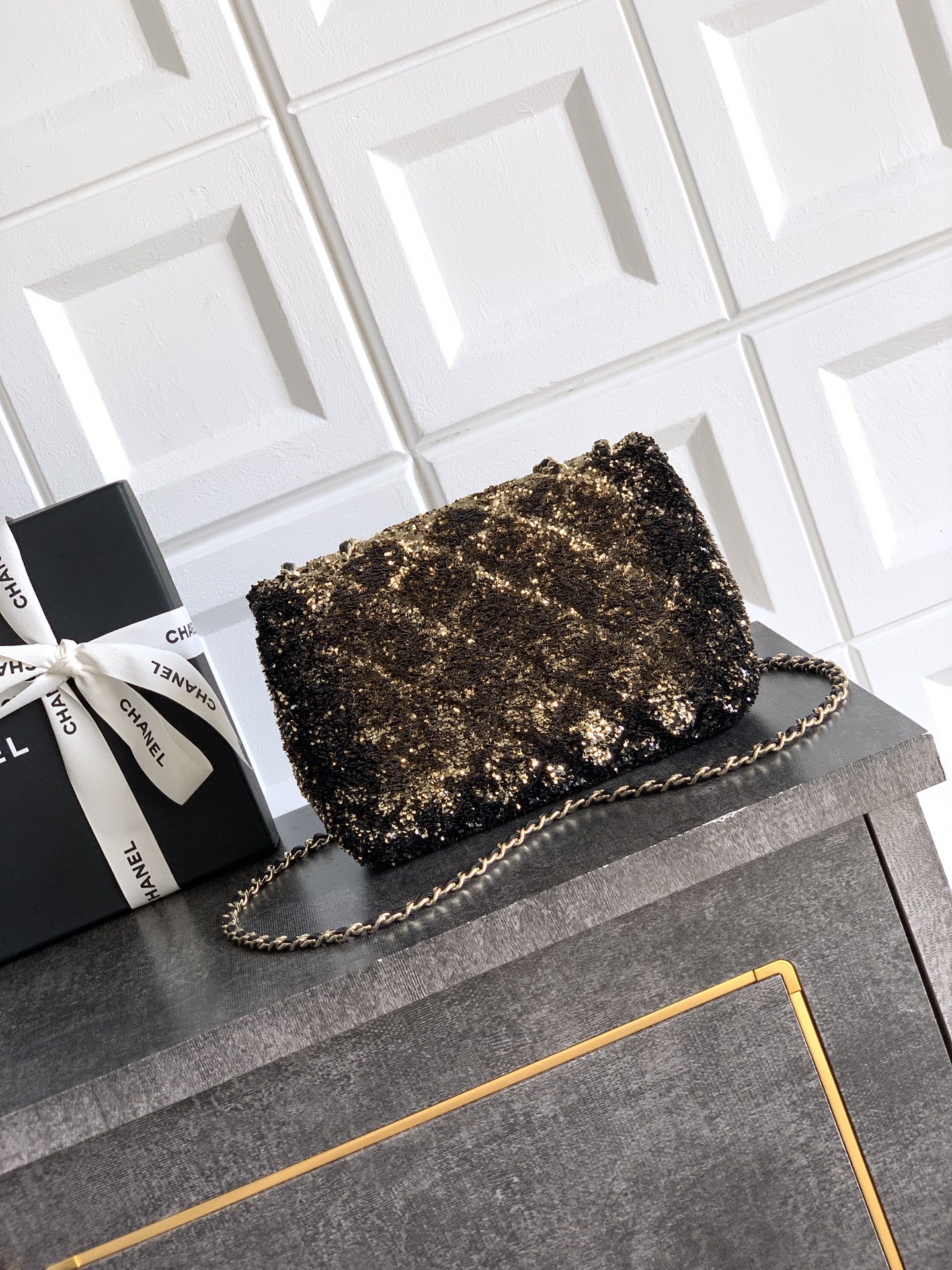 Dazzle with this OHANEL 25B flap bag. Features gold sequins, a chain strap, and the iconic design. Perfect for adding sparkle to any outfit. 20cm.