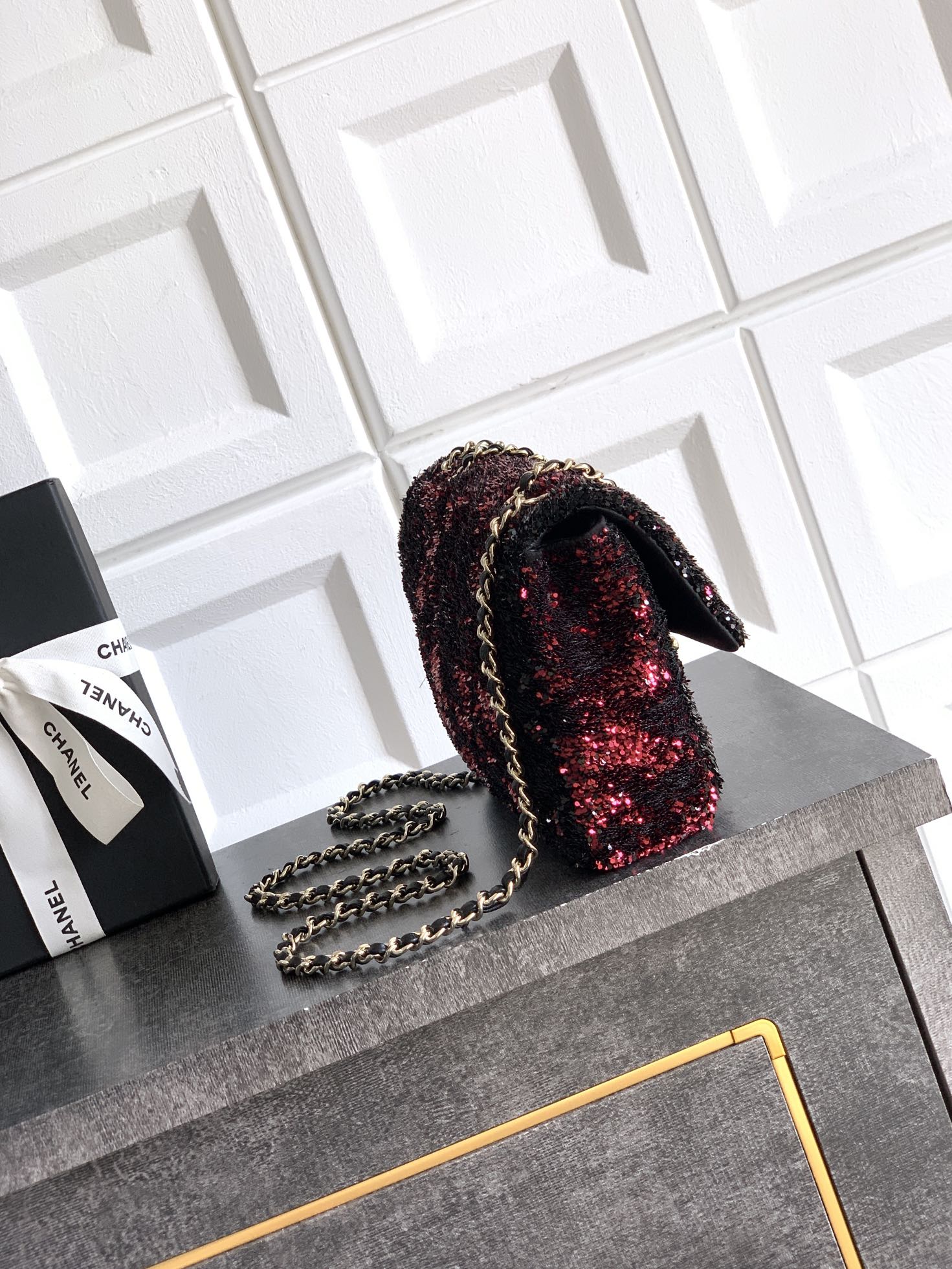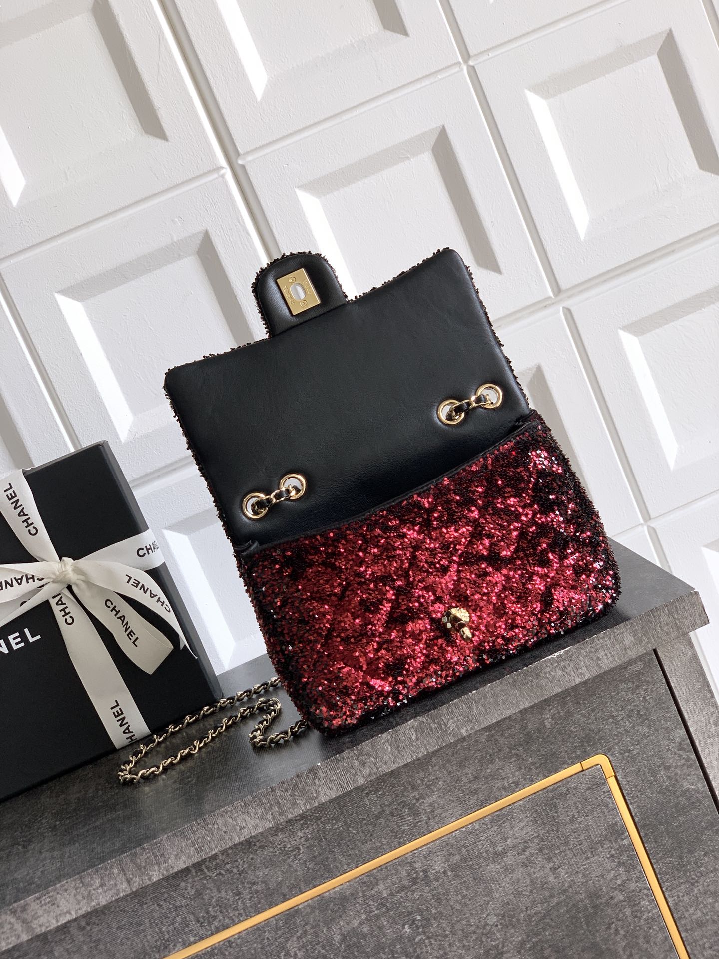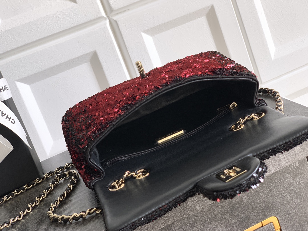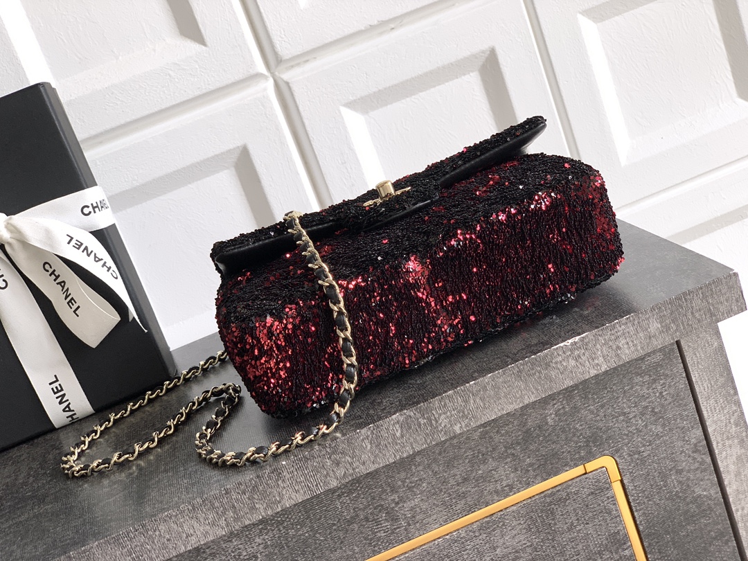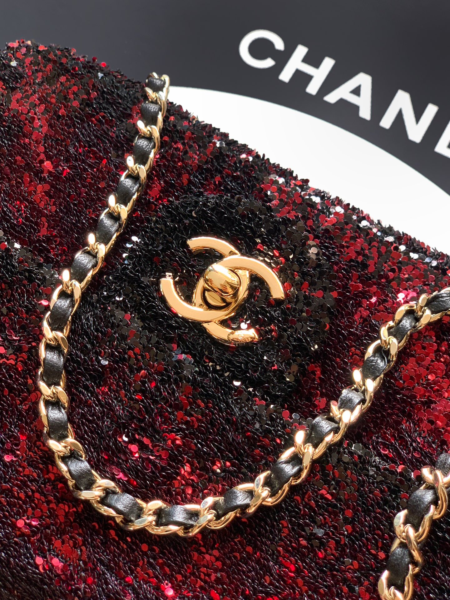 Dazzle with this OHANEL 25B sequin flap bag. Featuring a striking red and black color palette, gold chain, and compact design, it's the perfect statement accessory for evening elegance.