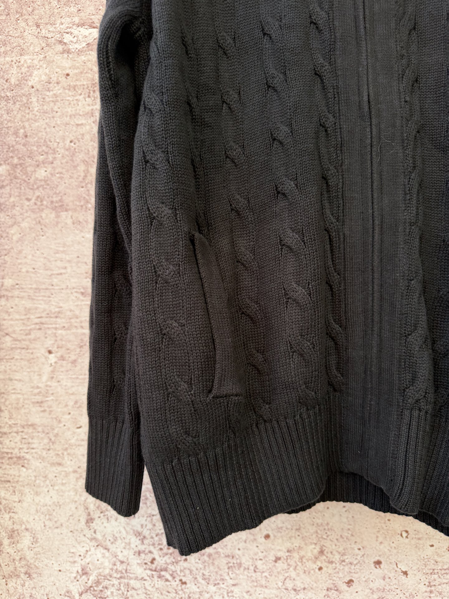 This Polo Ralph Lauren full-zip cable knit sweater is a versatile addition to any wardrobe.