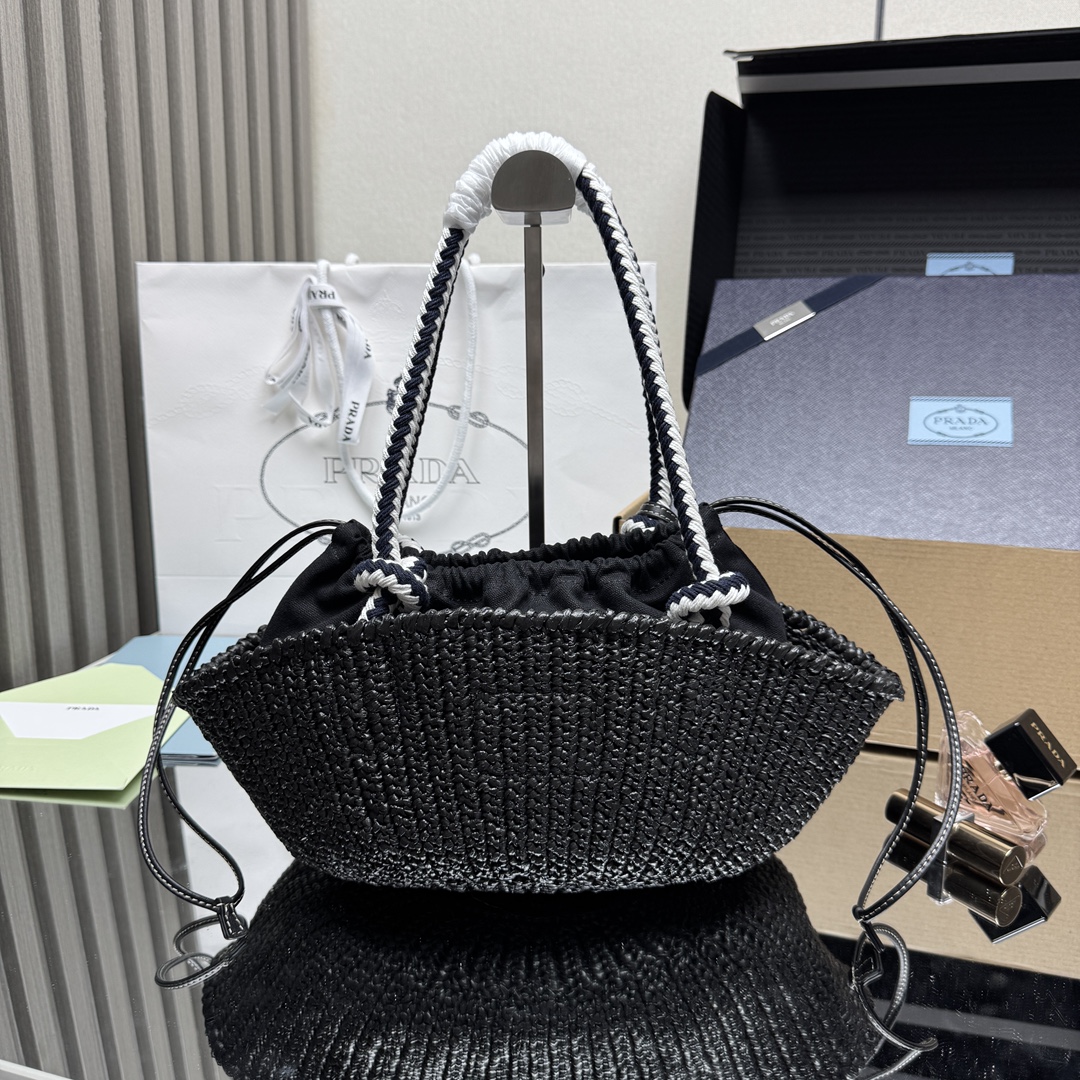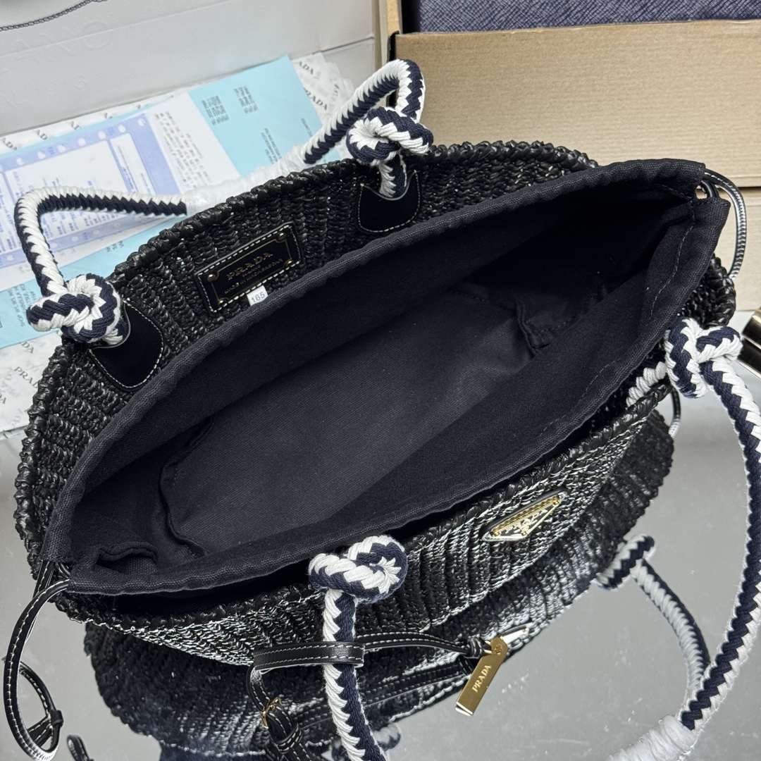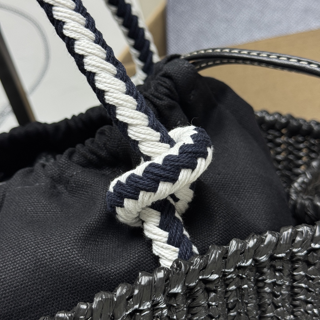 Prada 1BA463 Black Woven Raffia Basket Bag with Cotton Rope Handles