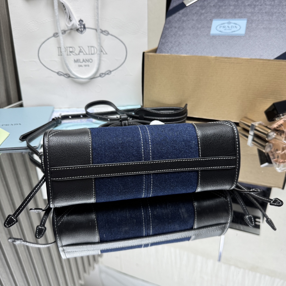 The Prada Bonnie mini bag features denim and leather construction with a spacious interior and a detachable strap for versatile styling. Perfect for daily use.
