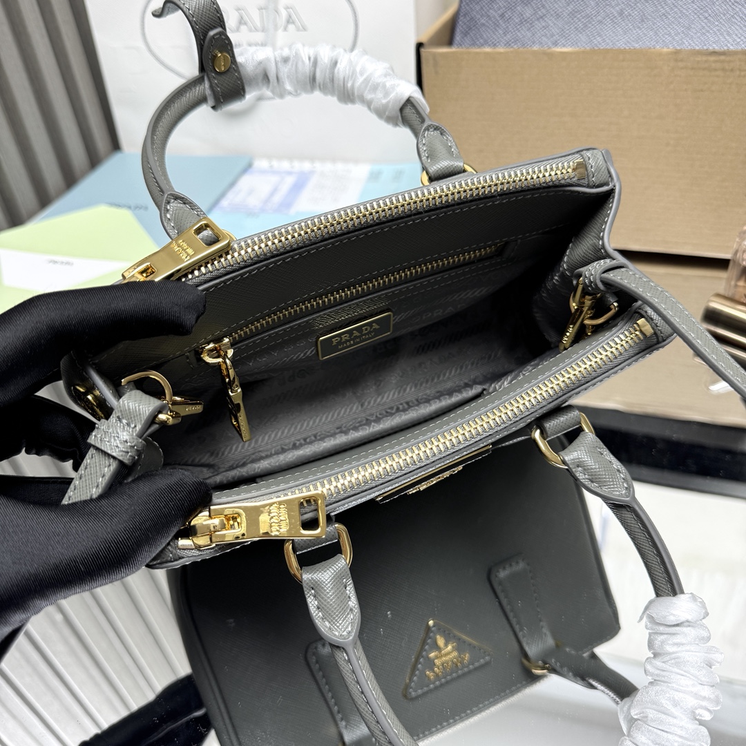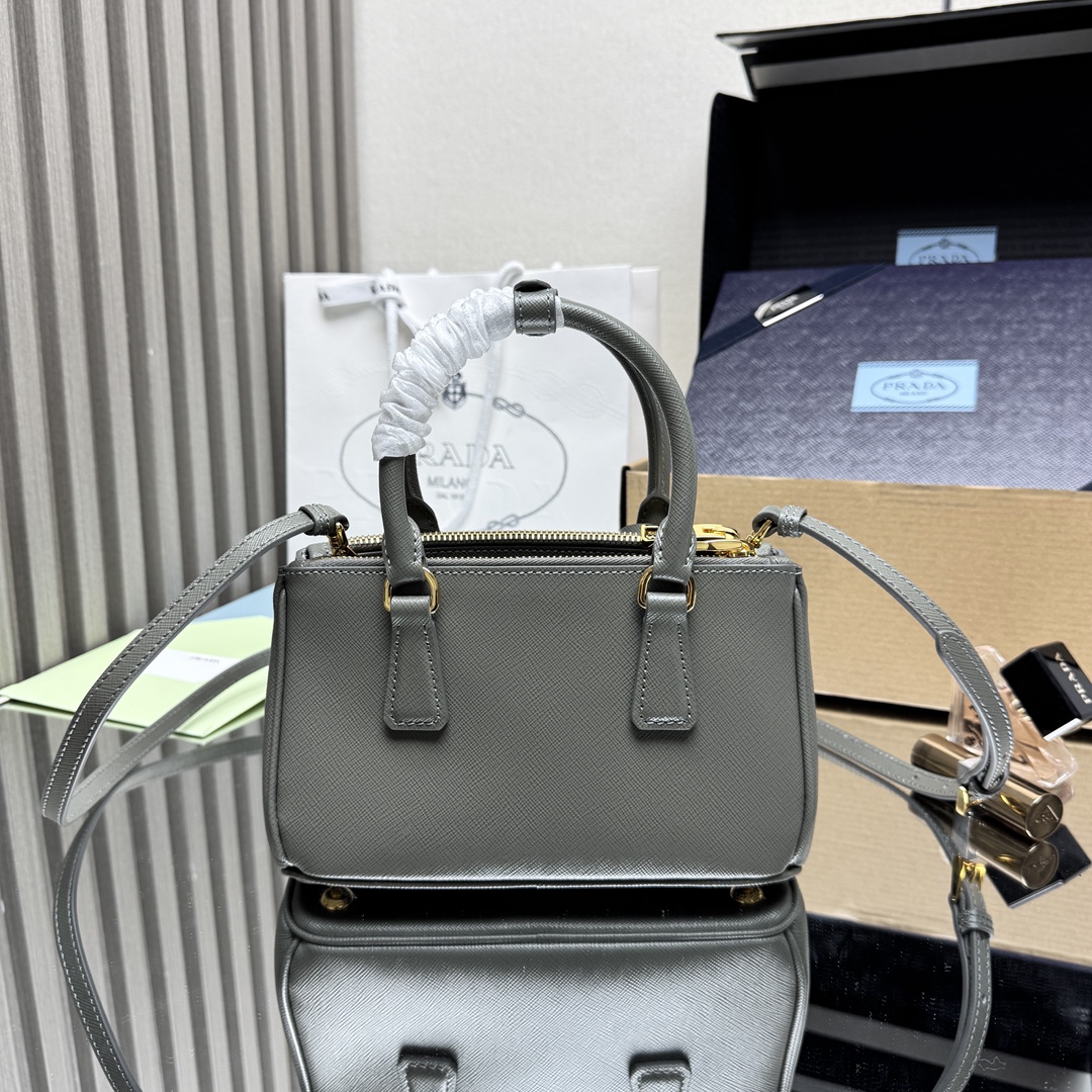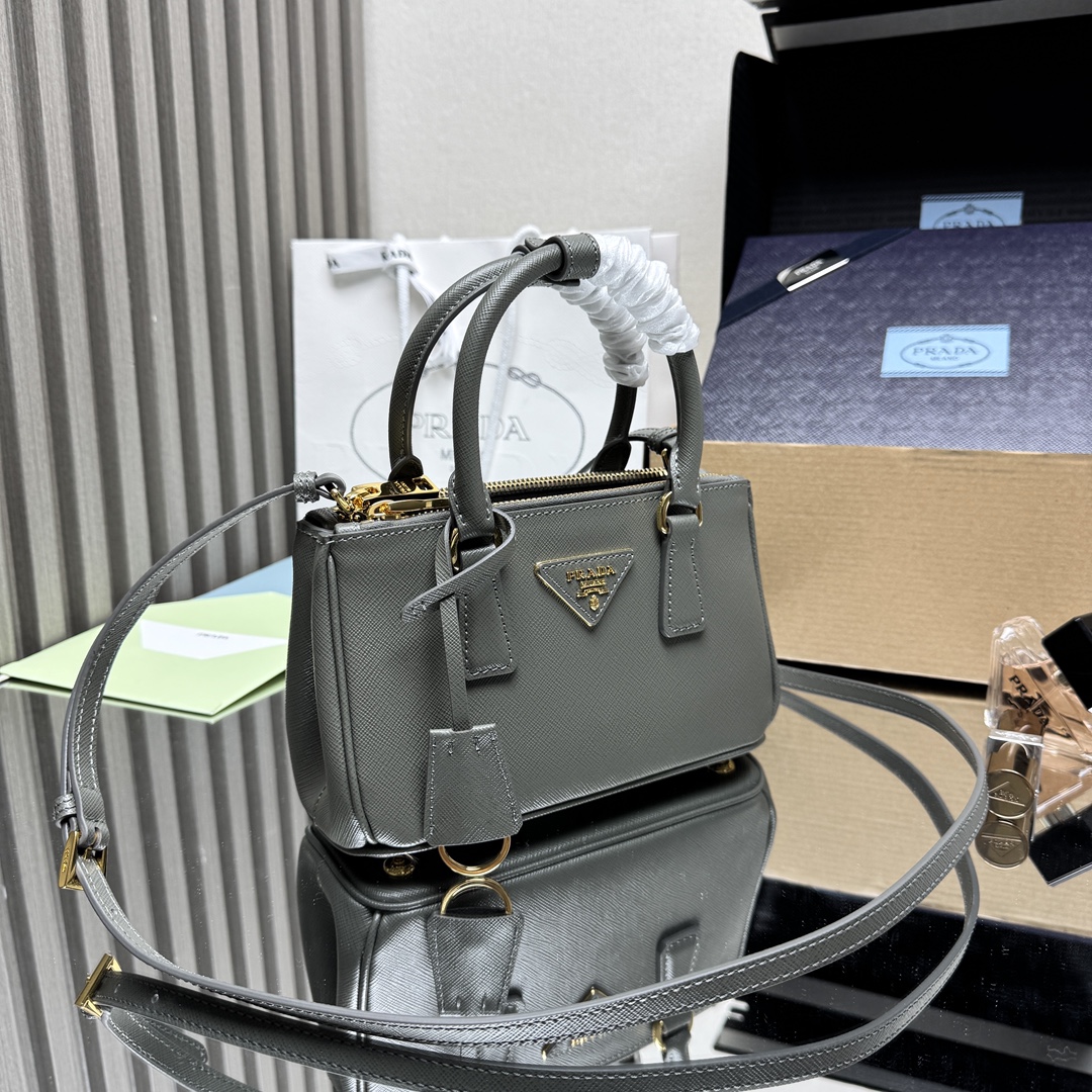 Tags: Designer Mini Bag, Gray Crossbody Bag, Luxury Leather Handbag, Mini Top Handle Bag, Prada Saffiano Leather Bag, Small Galleria Bag