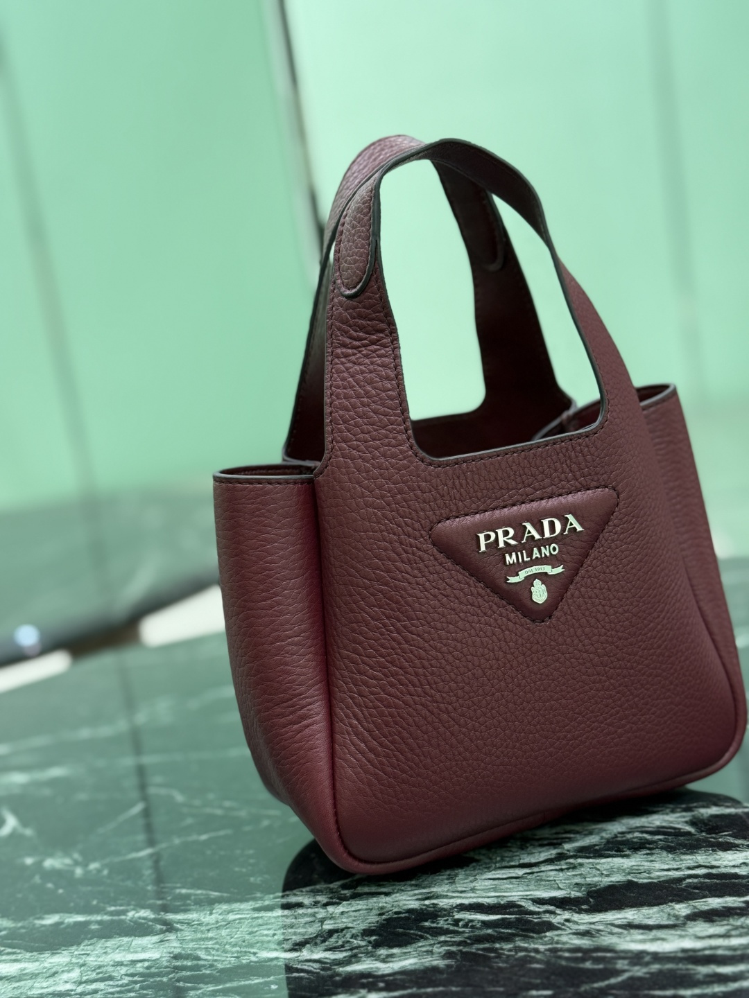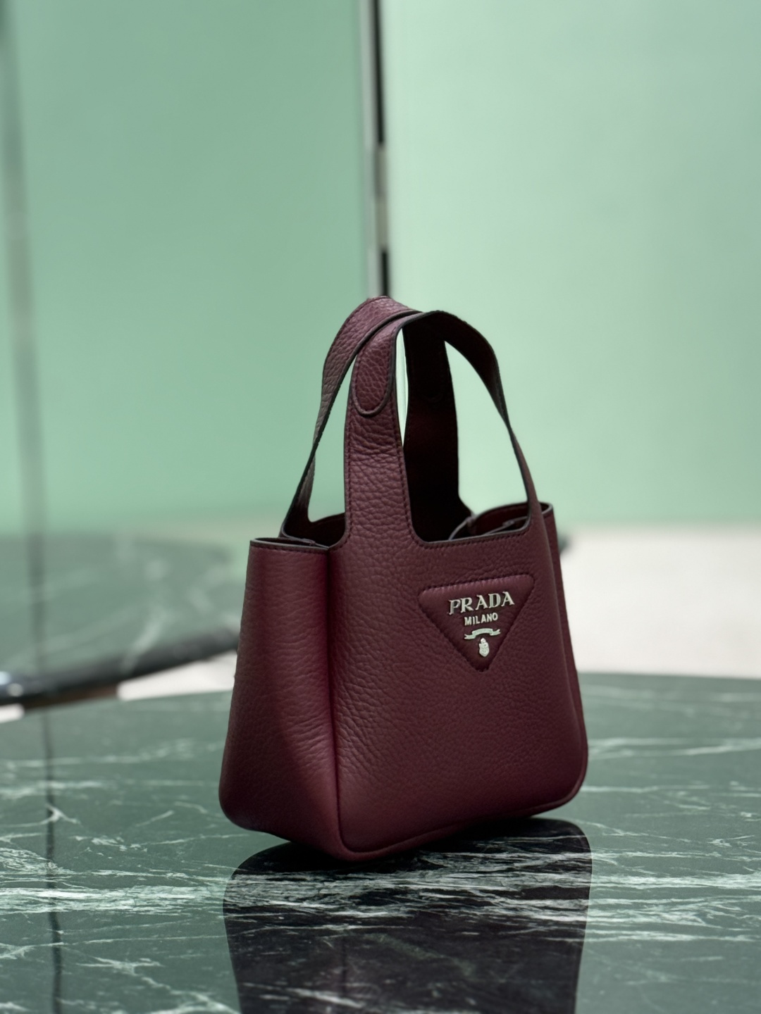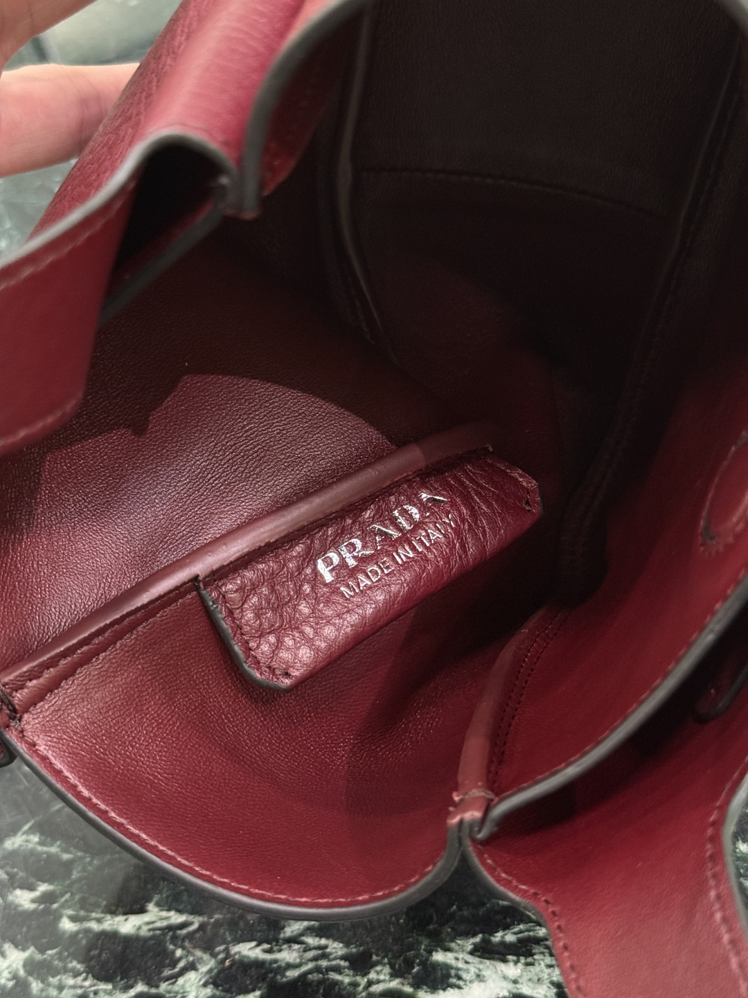 Tags: Burgundy Handbag, Designer Bucket Bag, Luxury Crossbody Bag, Prada 1BA349, Prada bucket bag, Small Leather Tote