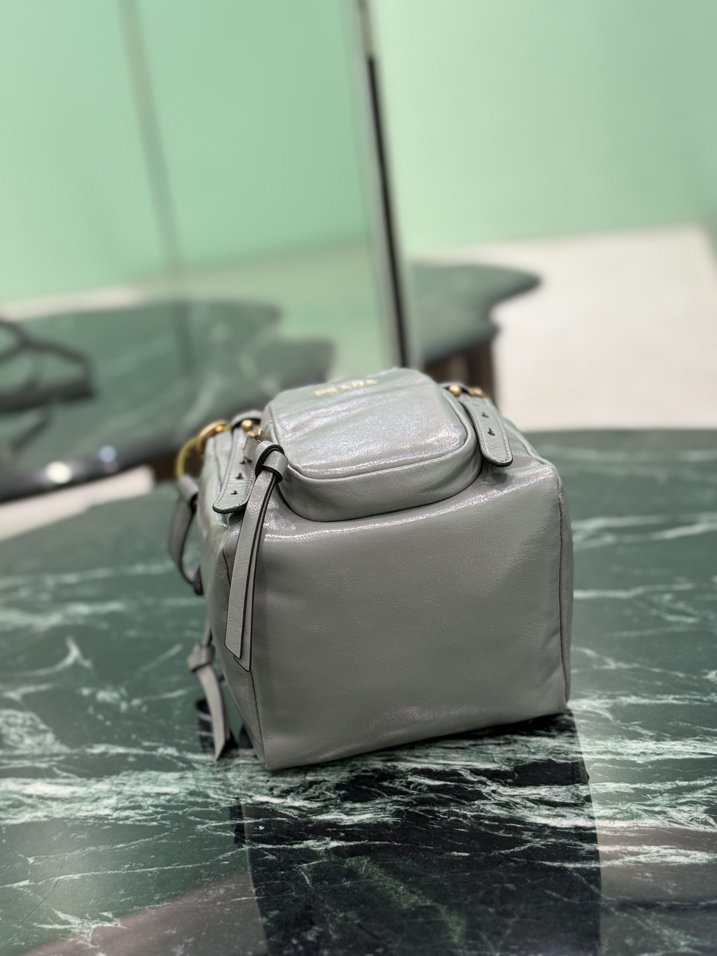 Prada Soft Lux Cube Small Handbag, Vintage-Inspired Leather, Gray, 14x14x13.5cm
