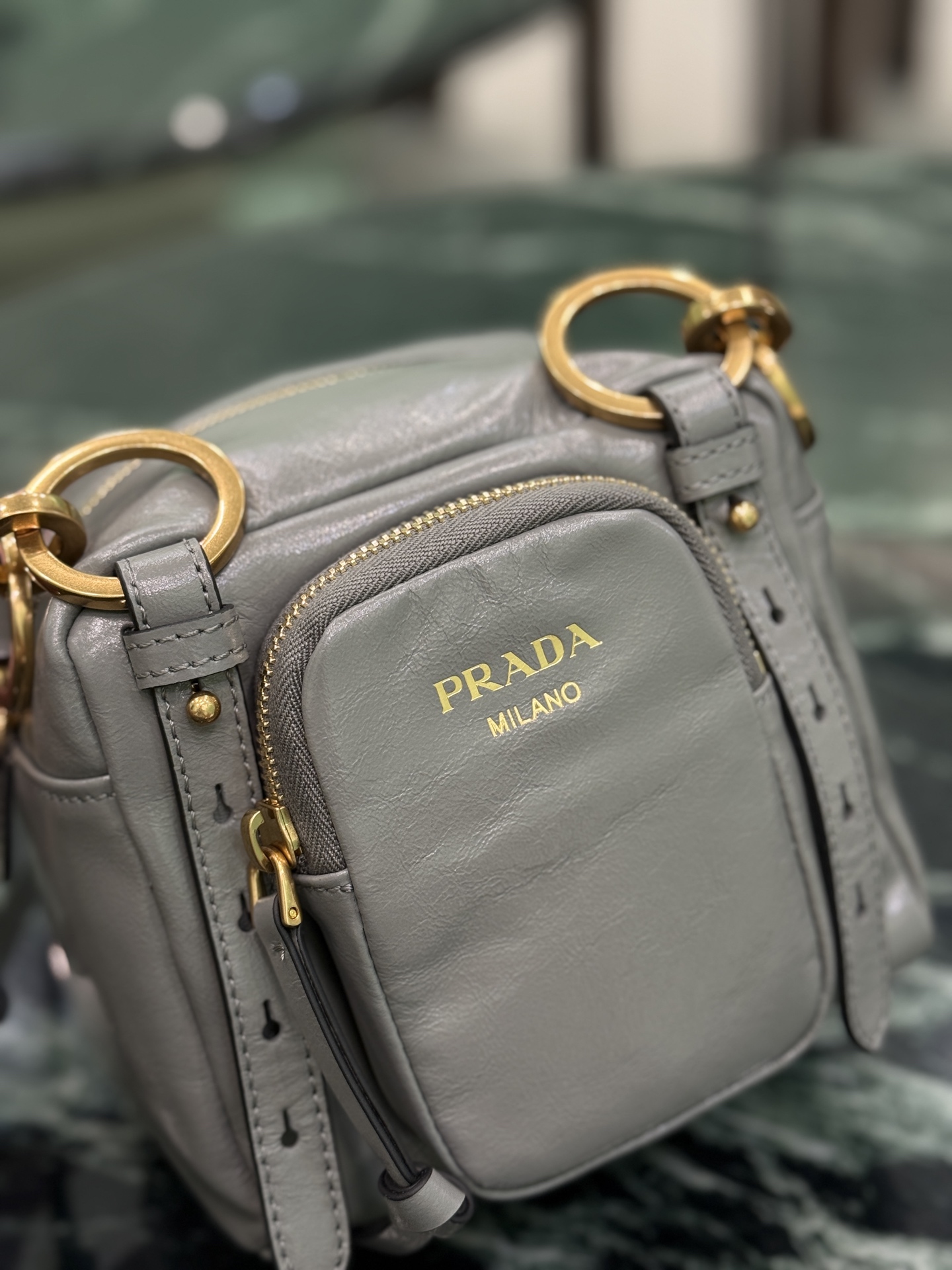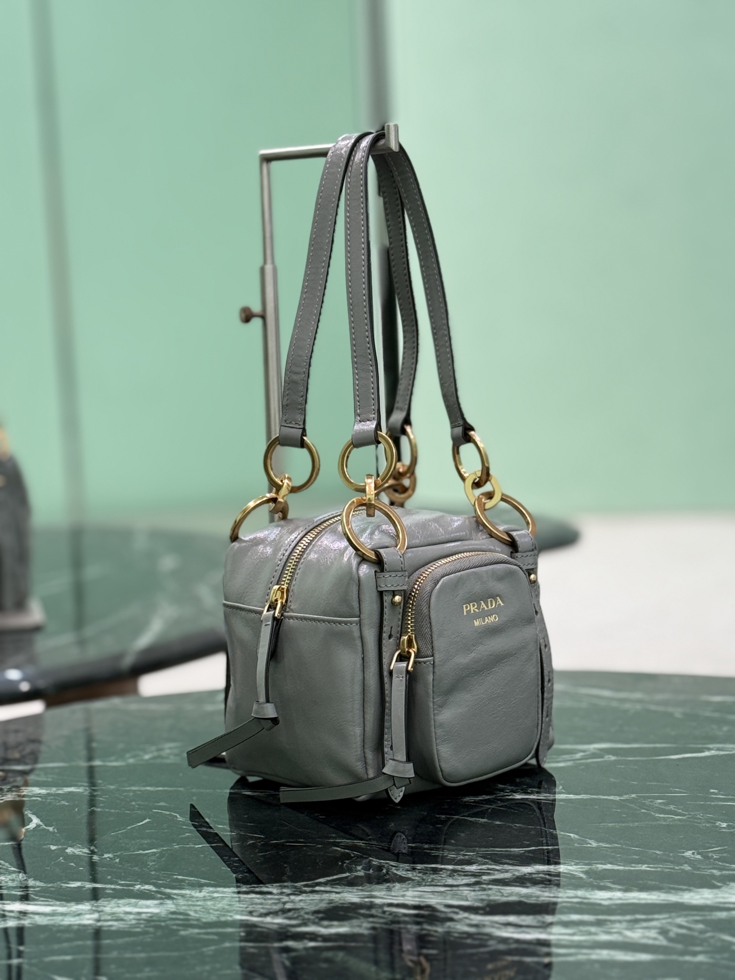 Tags: Designer Top Handle Bag, Gray Leather Handbag, Prada Cube Handbag, Shoulder Bag, Small Leather Handbag, Vintage Style Bag