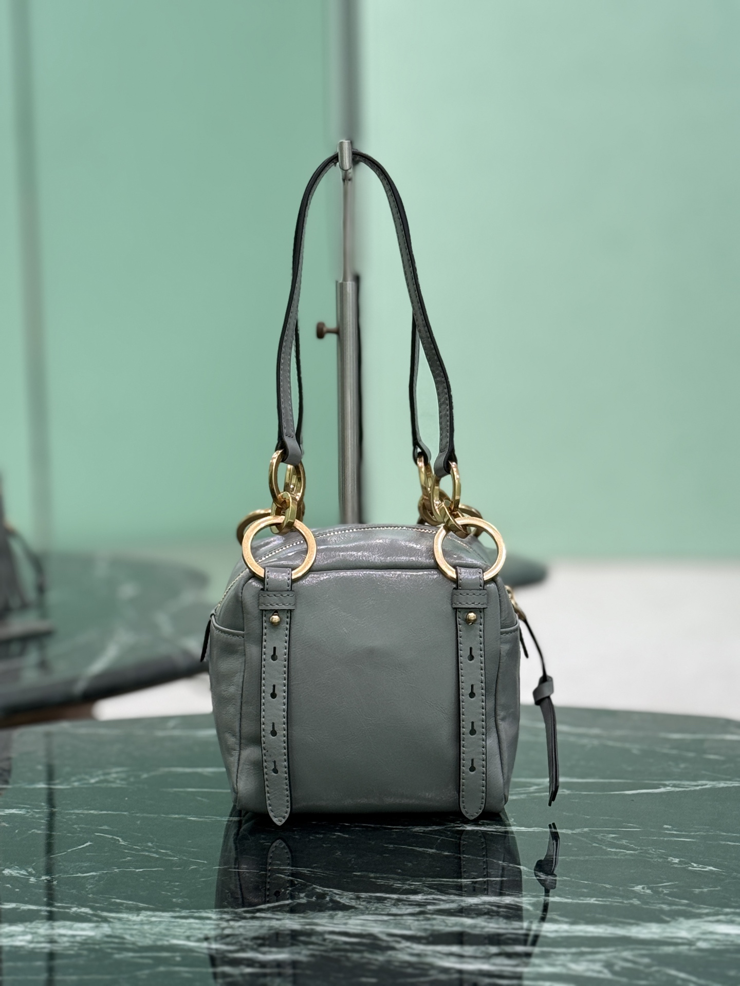 - Retro metal hardware detailing