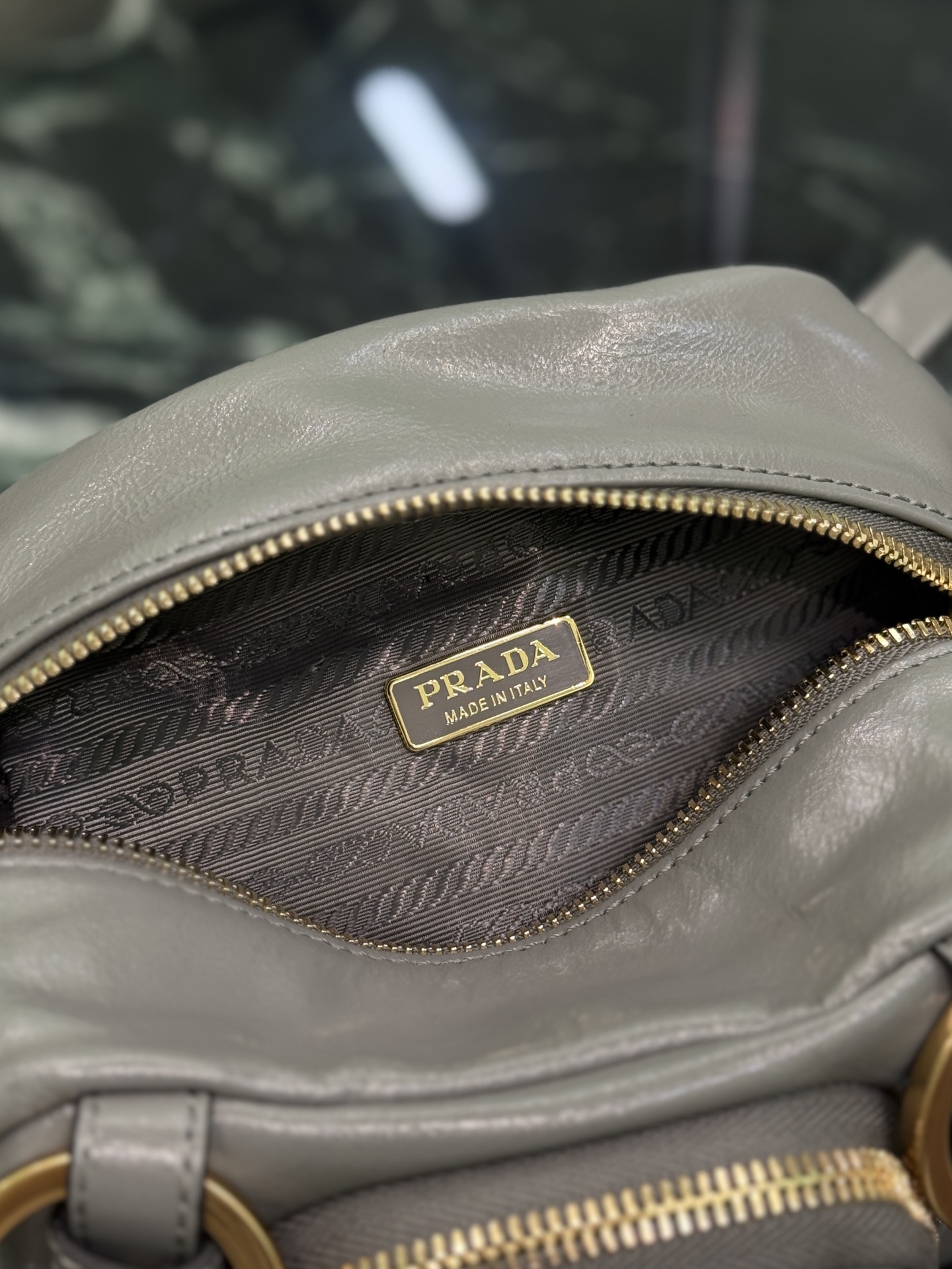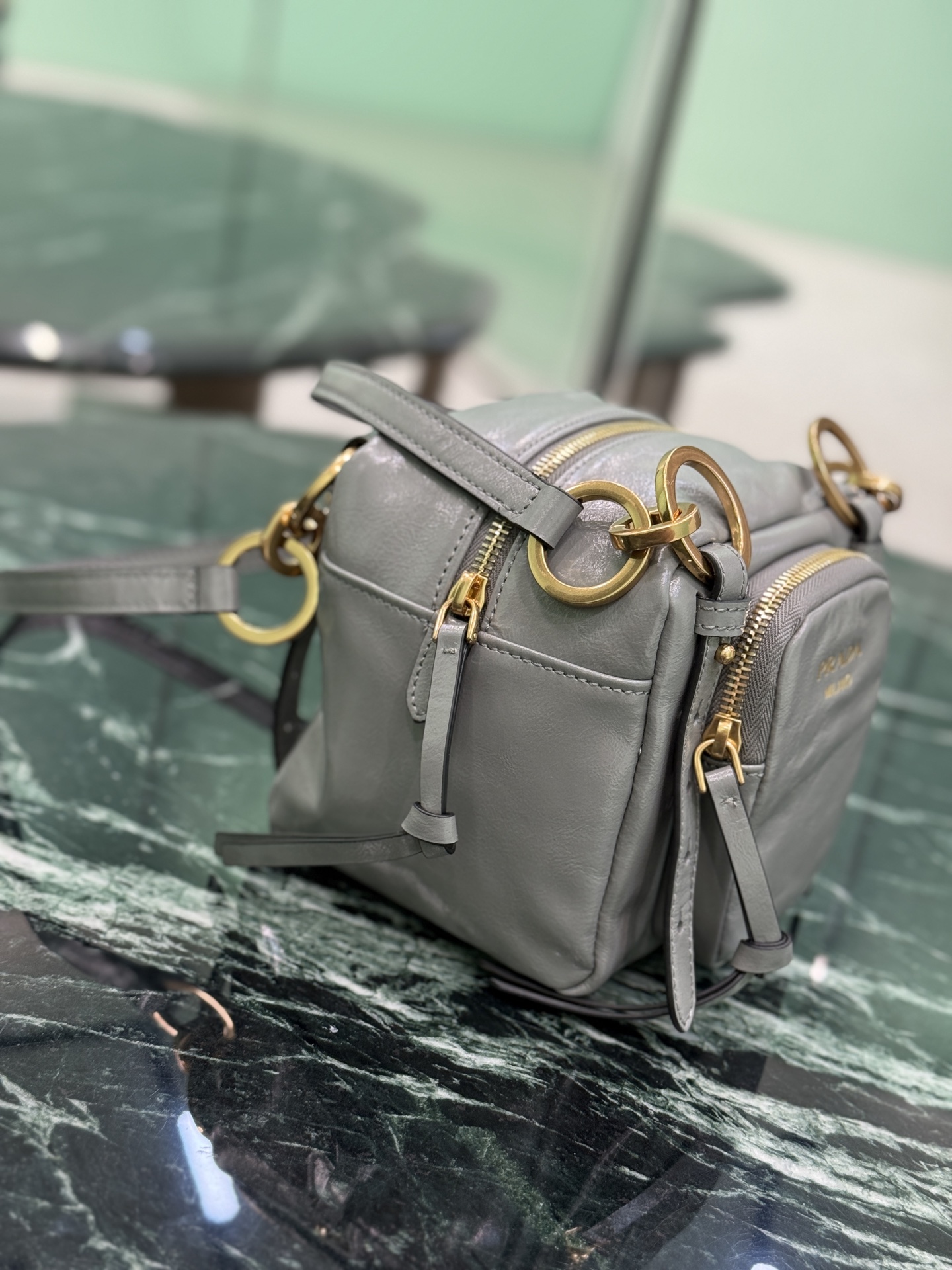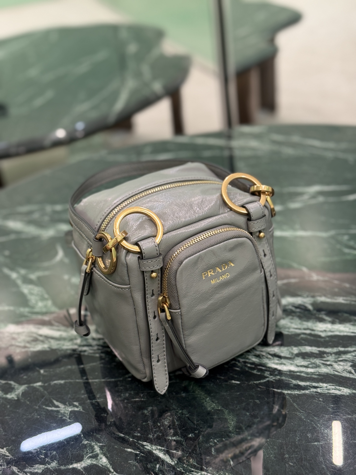 Chic Prada cube handbag in soft, vintage-inspired leather. Features retro metal hardware, classic zip pocket, and versatile carry options. Perfect for daily use.