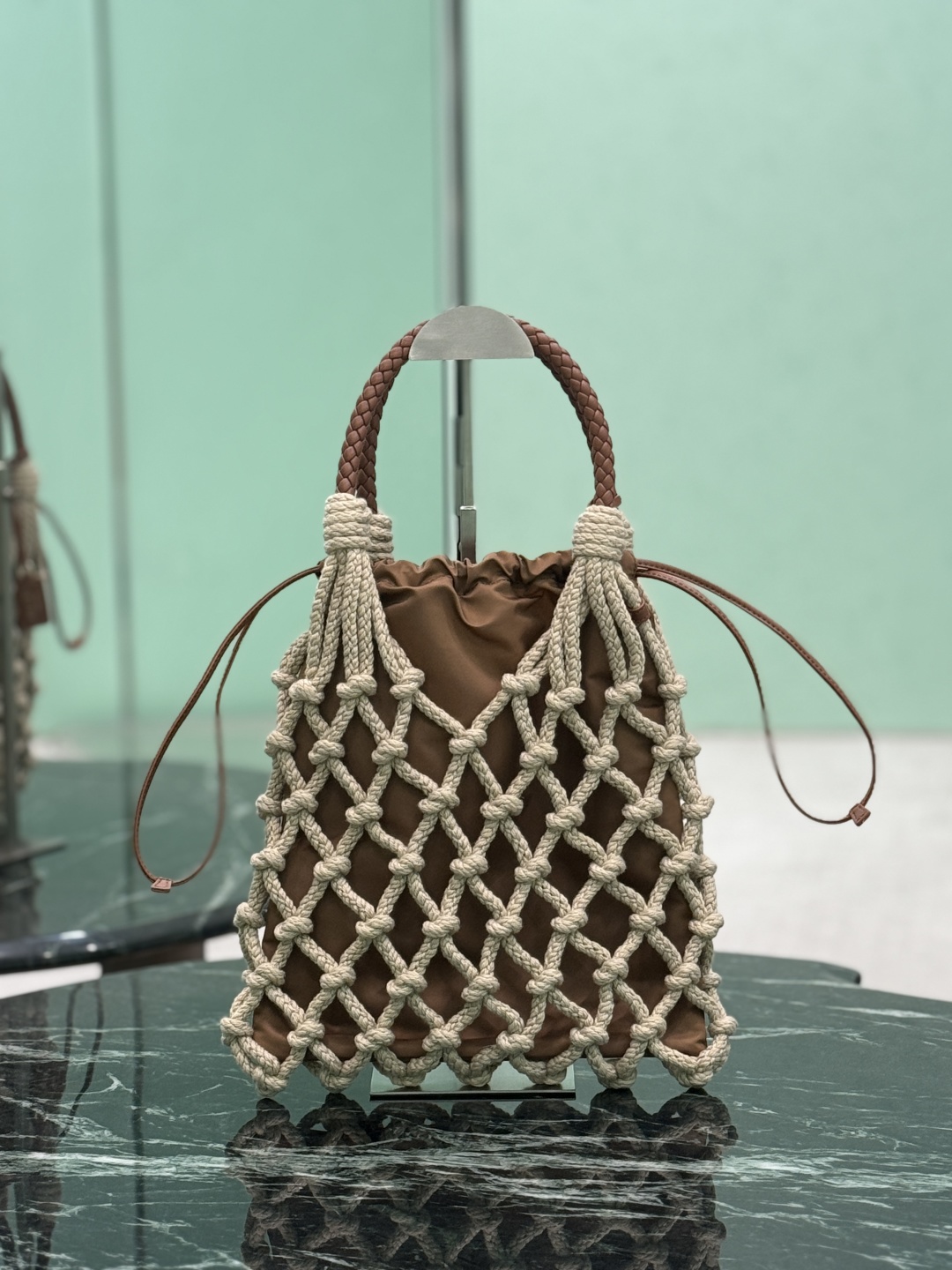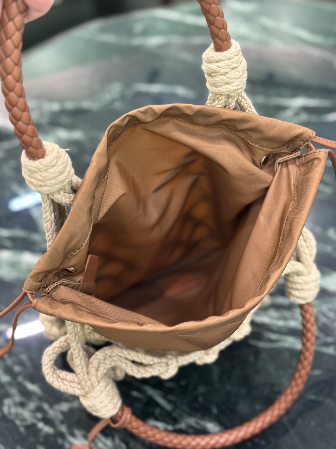 Tags: Beige Knit Bag, Brown Nautical Bag, Cotton Lace Bag, Detachable Pendant Bag, Leather Handle Bag, Woven Handbag
