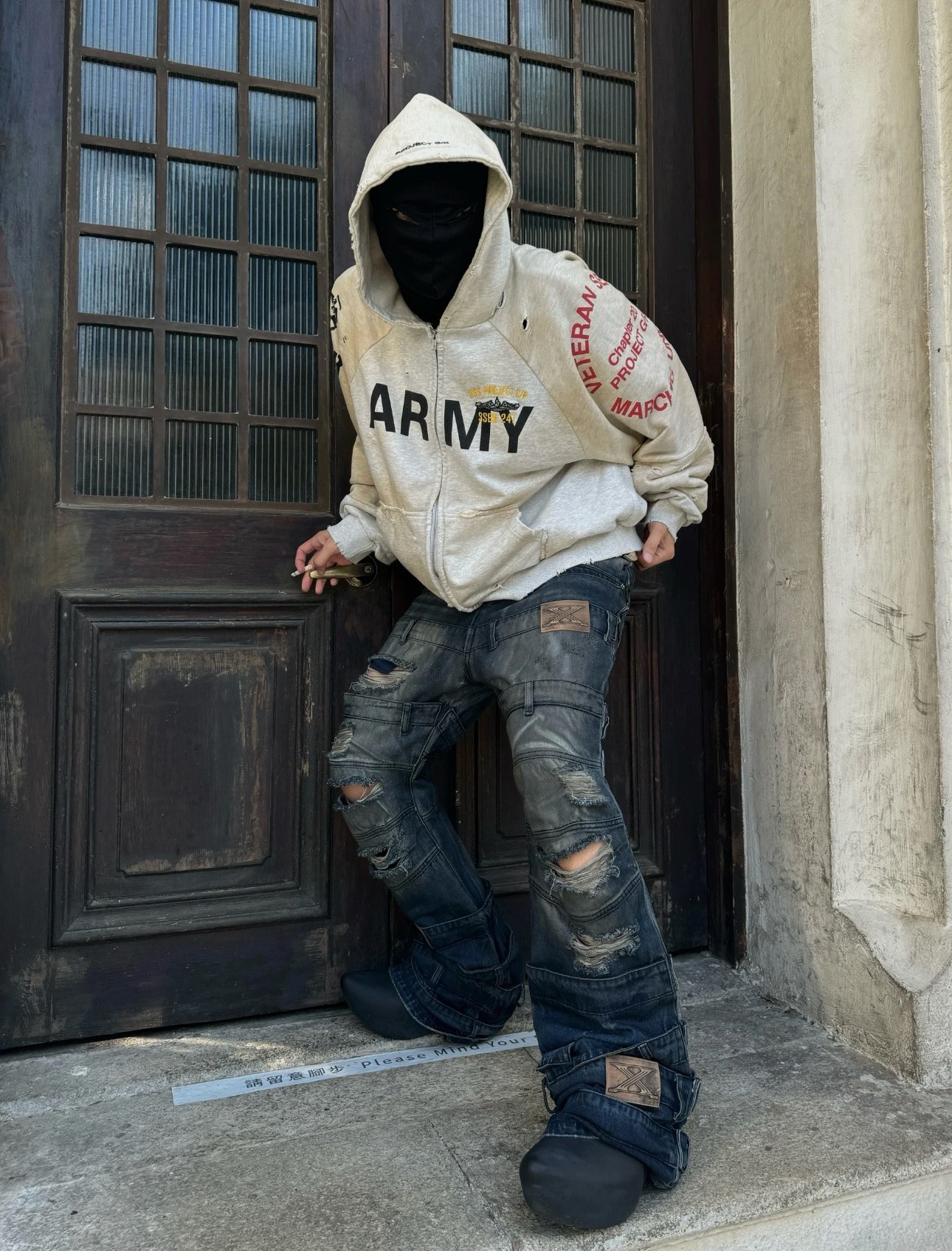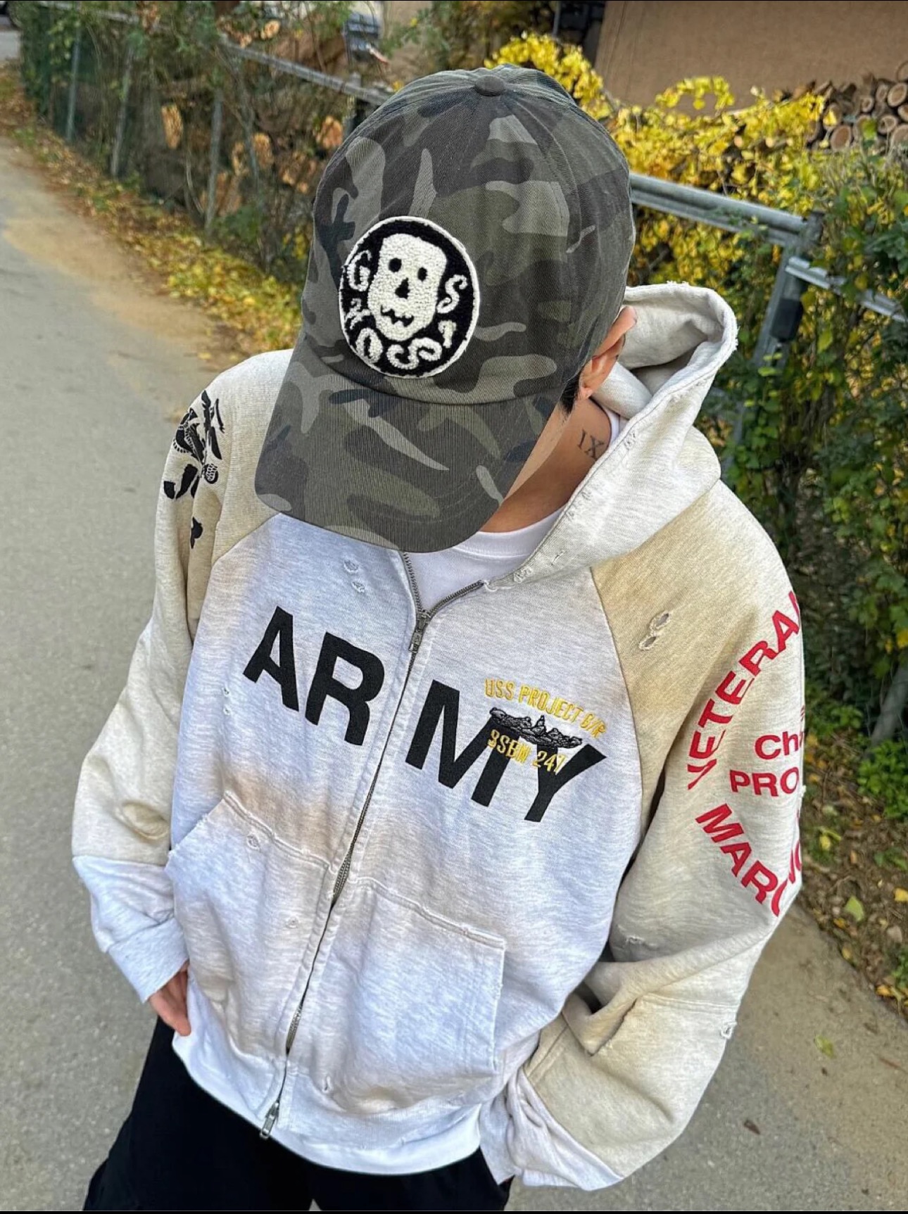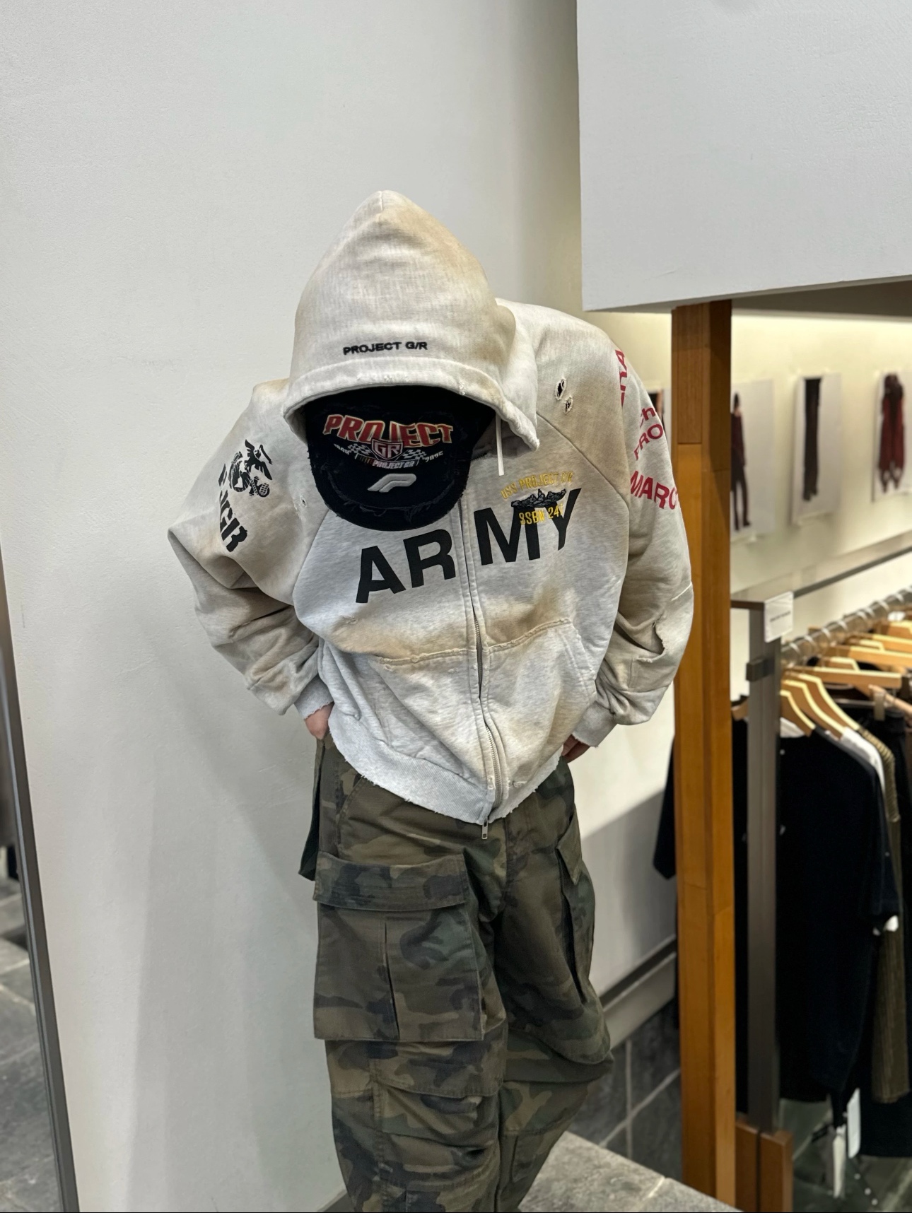 Introducing the Project G/R Army Distressed Zip-Up Hoodie, a blend of vintage aesthetics and modern design.