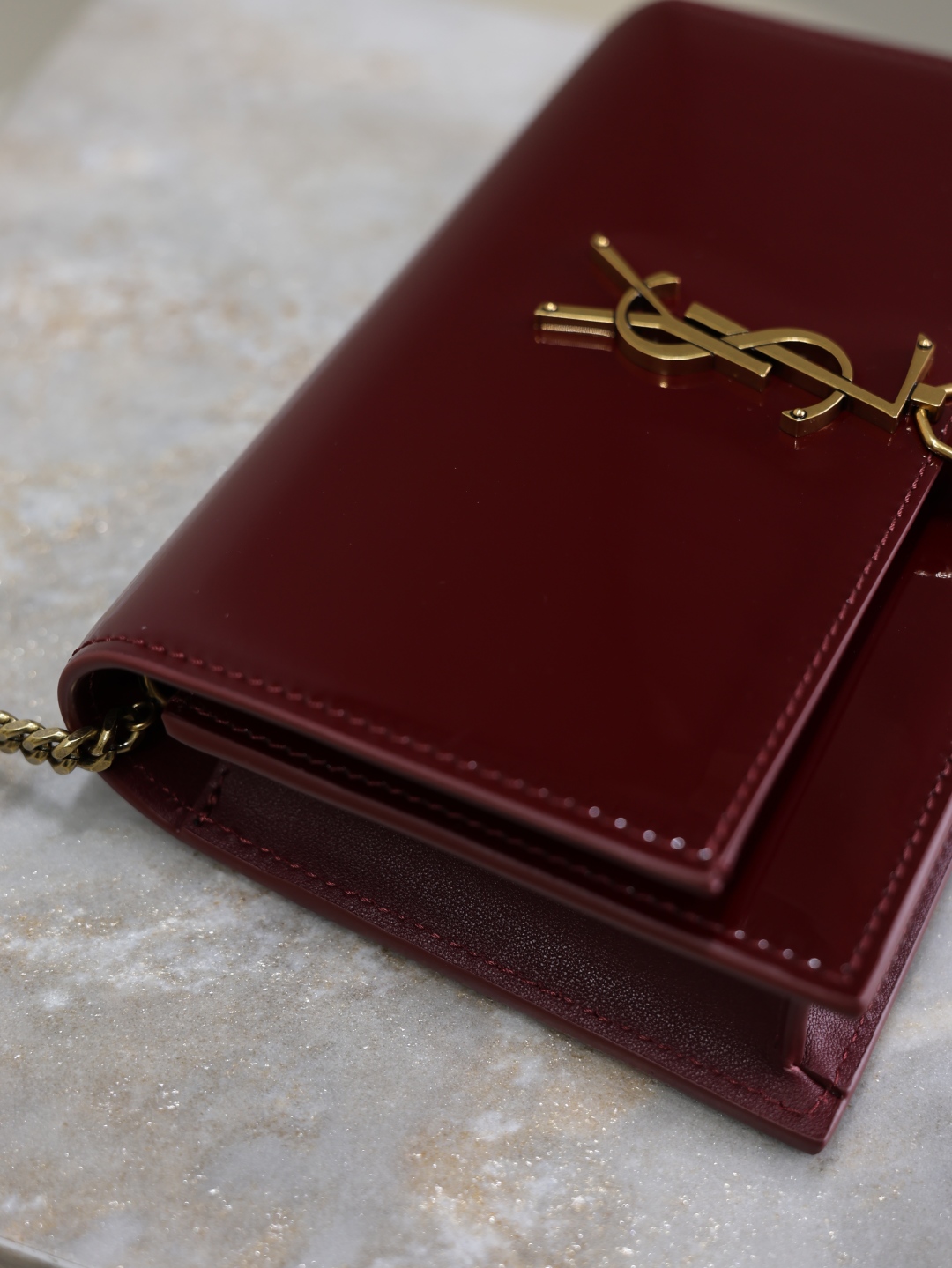 Elevate your style with this Saint Laurent Kate clutch. Crafted in Italy from patent leather. Featuring a tassel detail and chain strap.