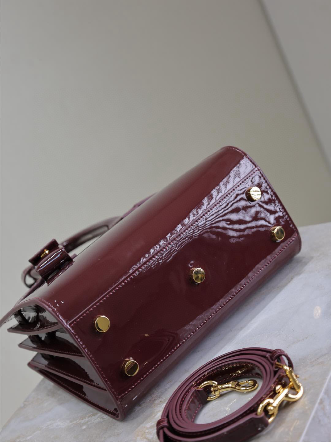 Elevate your style with this burgundy Sac De Jour. Crafted in Italy from glossy patent leather, featuring adjustable shoulder strap.