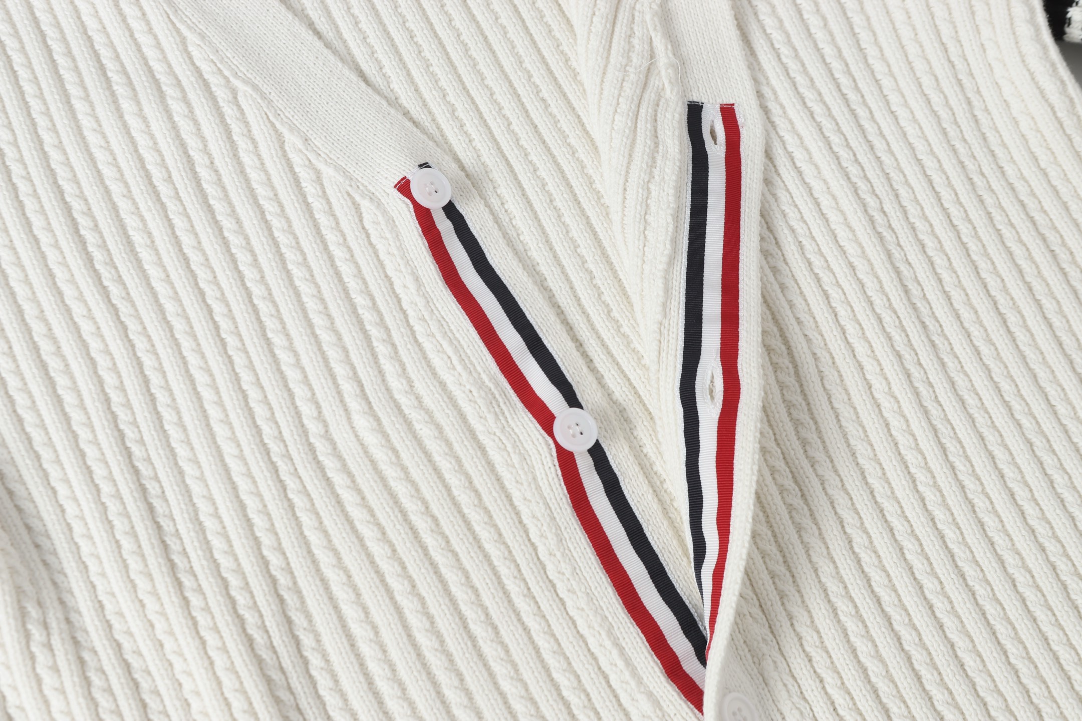 Tags: Cream Wool Cardigan, Designer Knitwear, Luxury Cardigan Sweater, Striped Sleeve Cardigan, Thom Browne Cardigan, Wool V Neck Cardigan