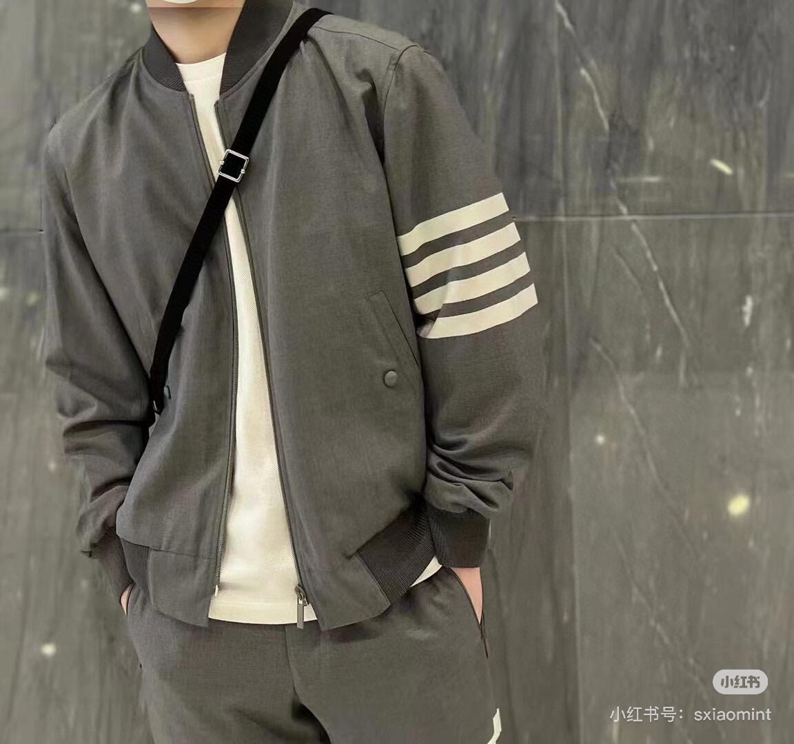 Tags: Designer Bomber Jacket, Executive Style Jacket, Gray Cotton Jacket, Stripe Sleeve Jacket, Thom Browne Bomber Jacket