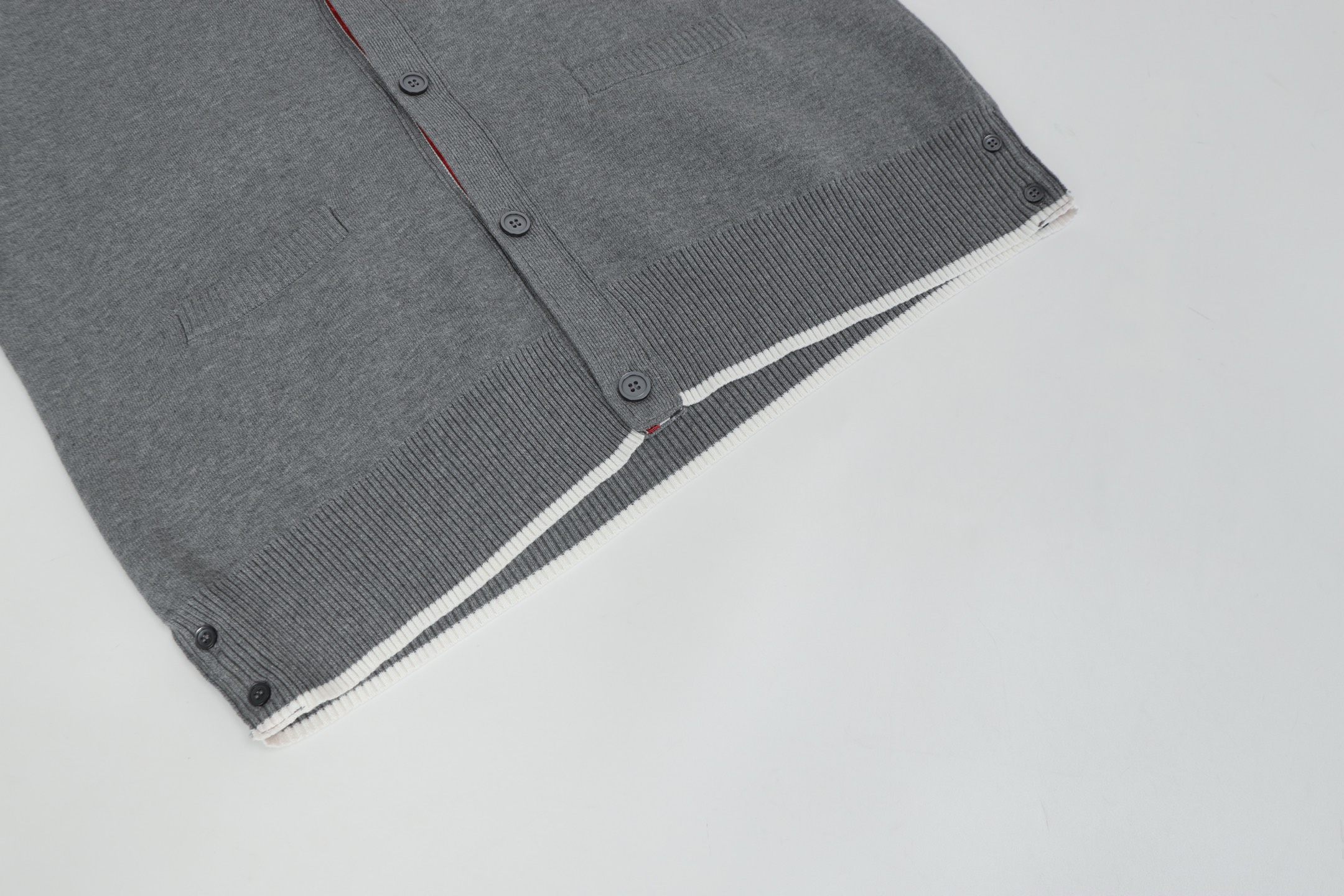 Tags: Designer Cardigan, Four Bar Stripe Knitwear, Gray Knit Cardigan, Thom Browne Cardigan, V Neck Sweater