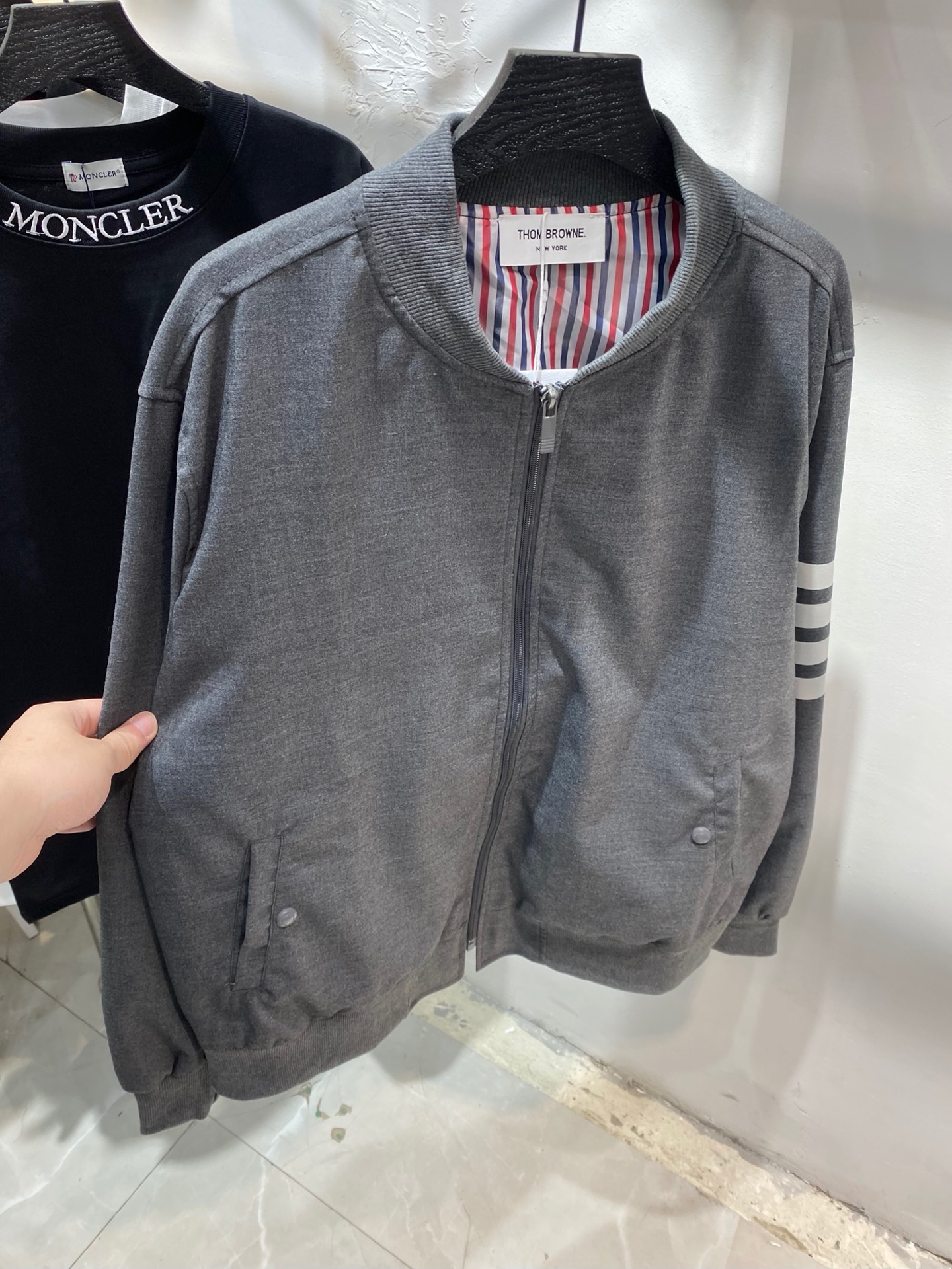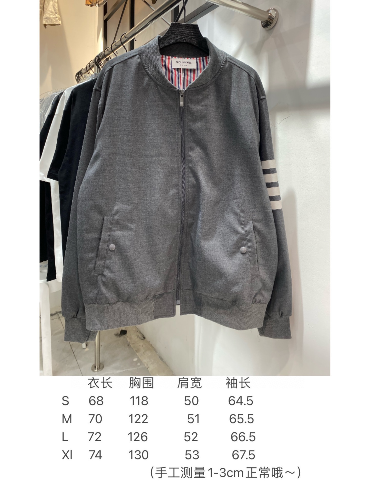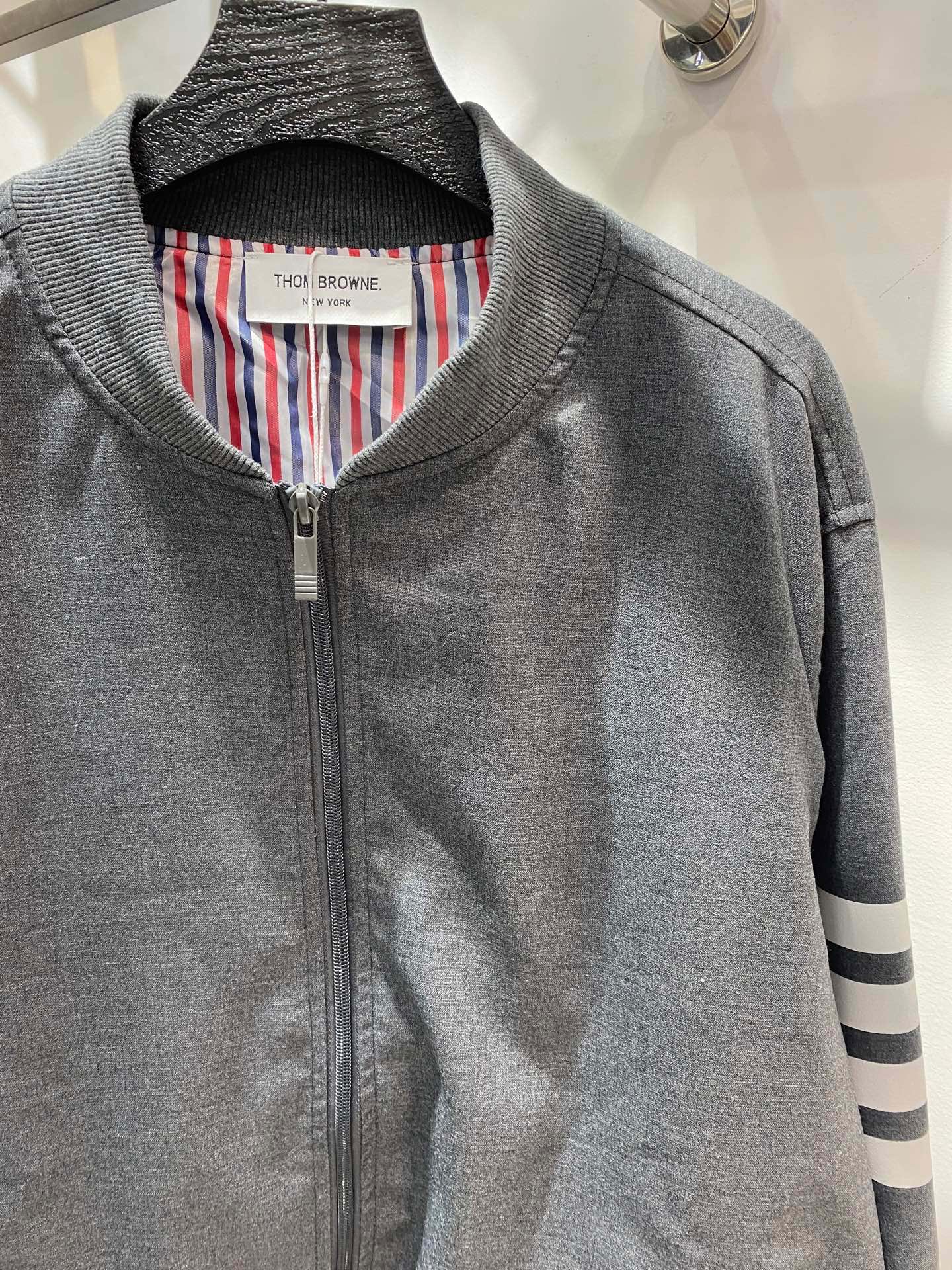 Elevate your wardrobe with this stylish Thom Browne bomber jacket, featuring the iconic four-bar stripe design. Comfortable, versatile, and perfect for any occasion.