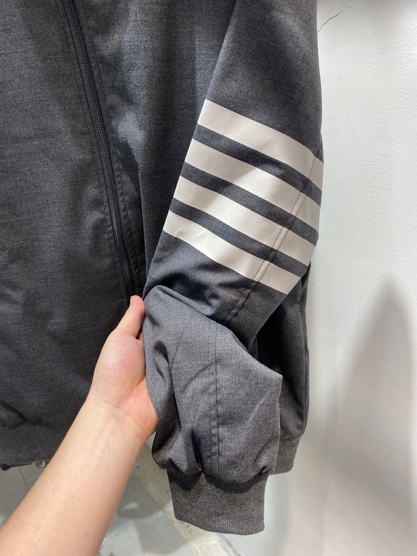 Tags: Cotton Blend Outerwear, Designer Zip Up Jacket, Four Bar Stripe Jacket, Gray Bomber Jacket, Striped Sleeve Jacket, Thom Browne Bomber Jacket