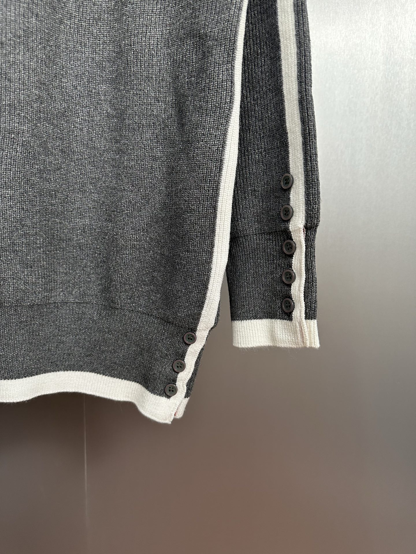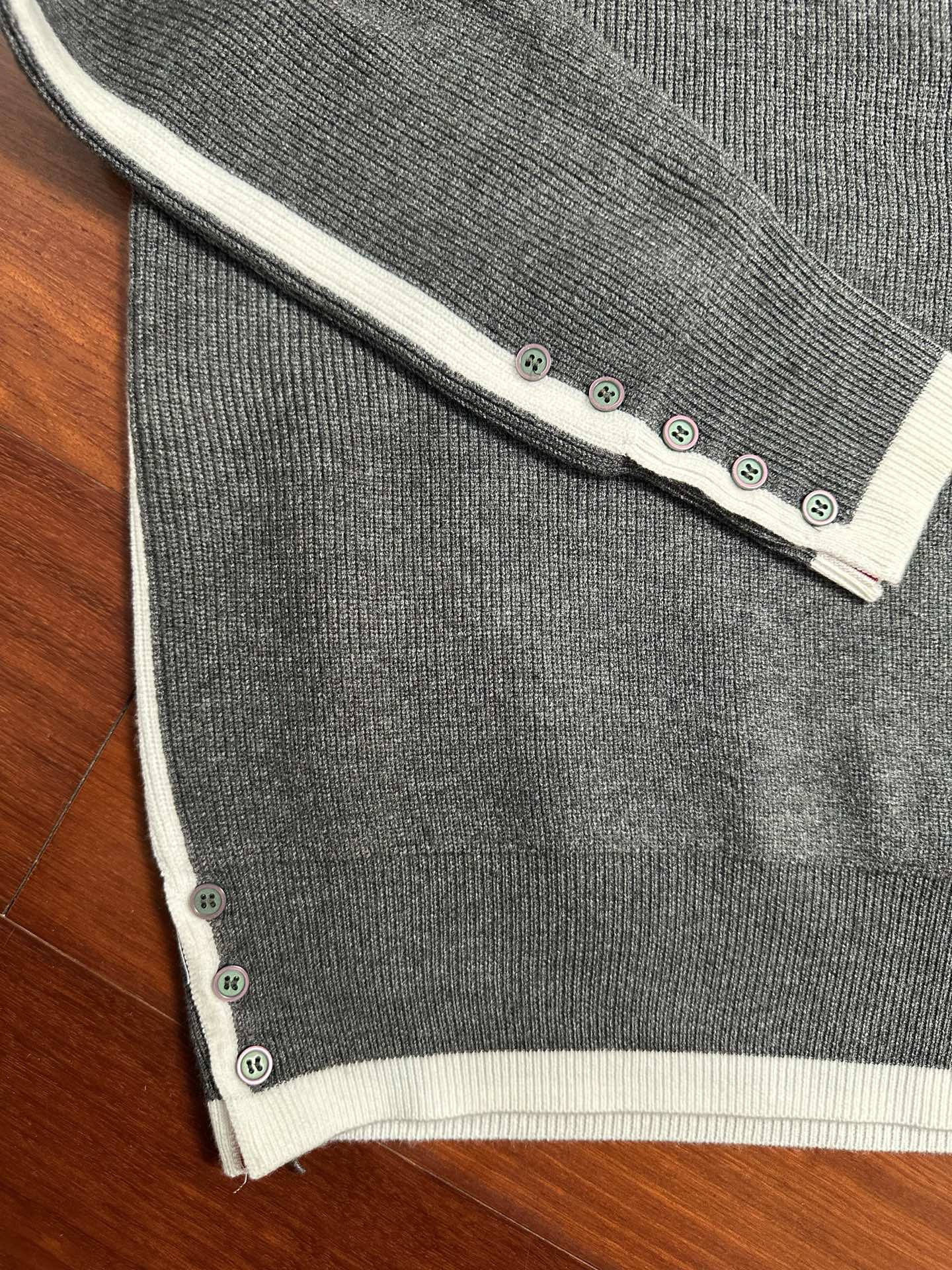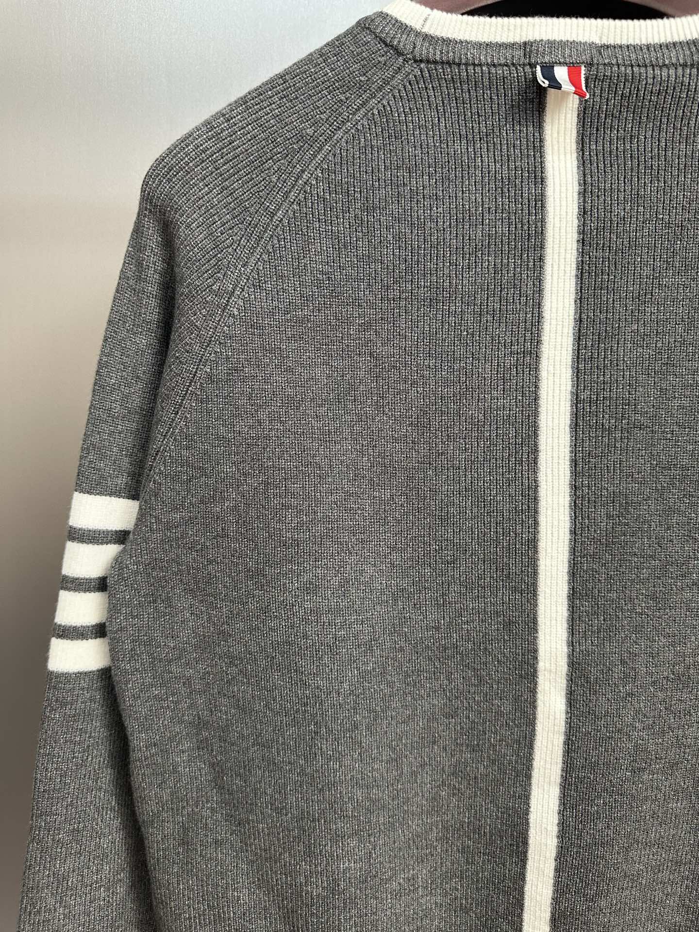Elevate your wardrobe with this Thom Browne grey knit sweater. Features signature stripes, contrast trim, and quality fabric. Perfect for any occasion.