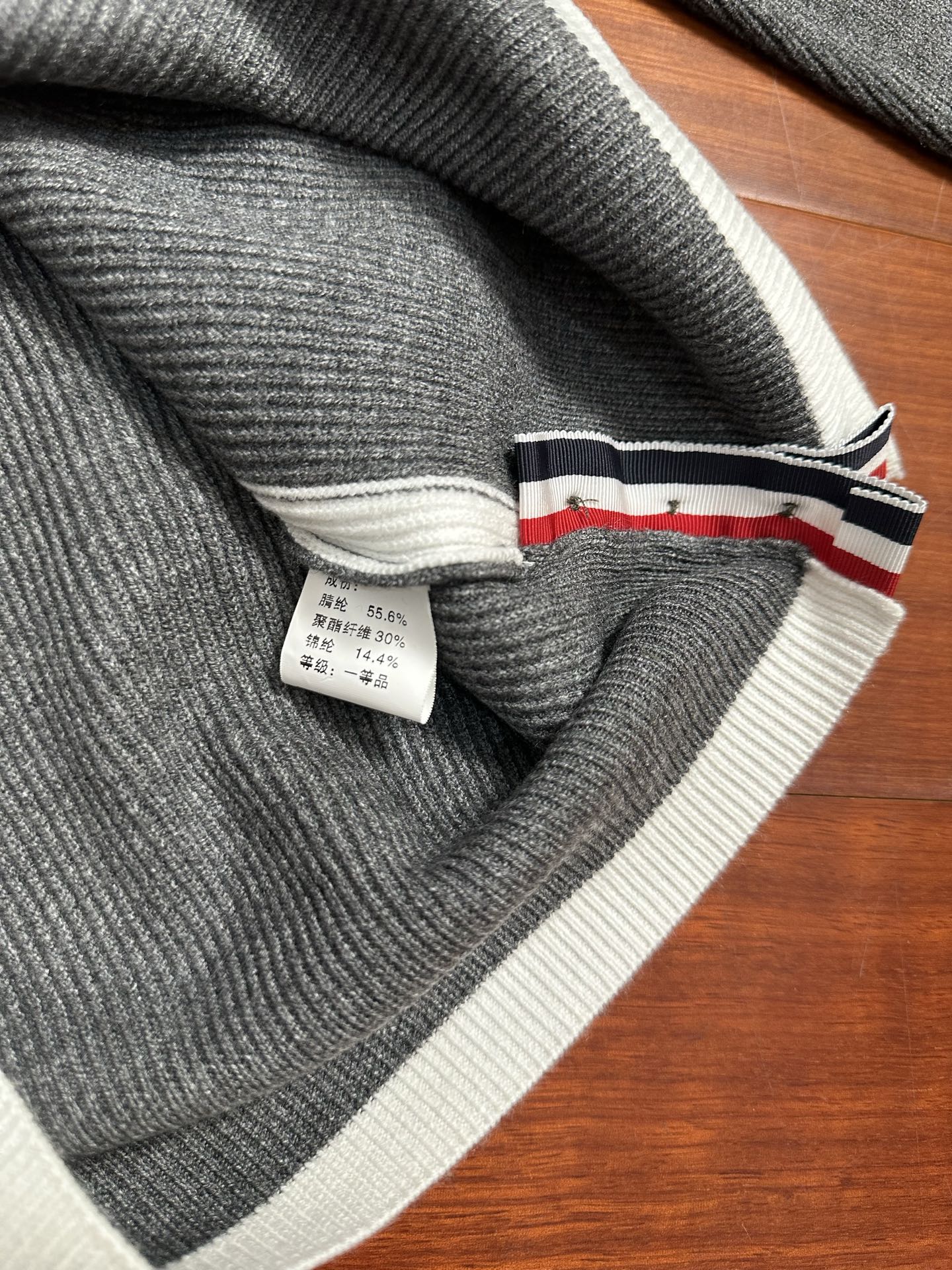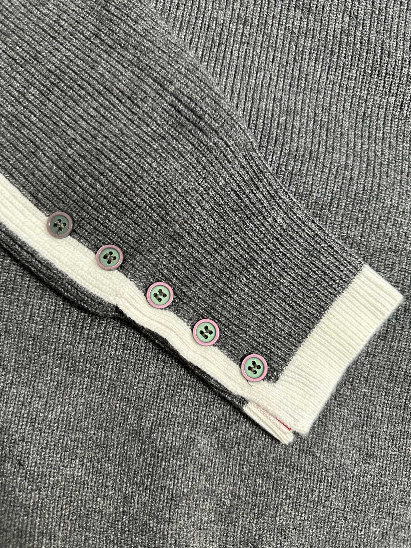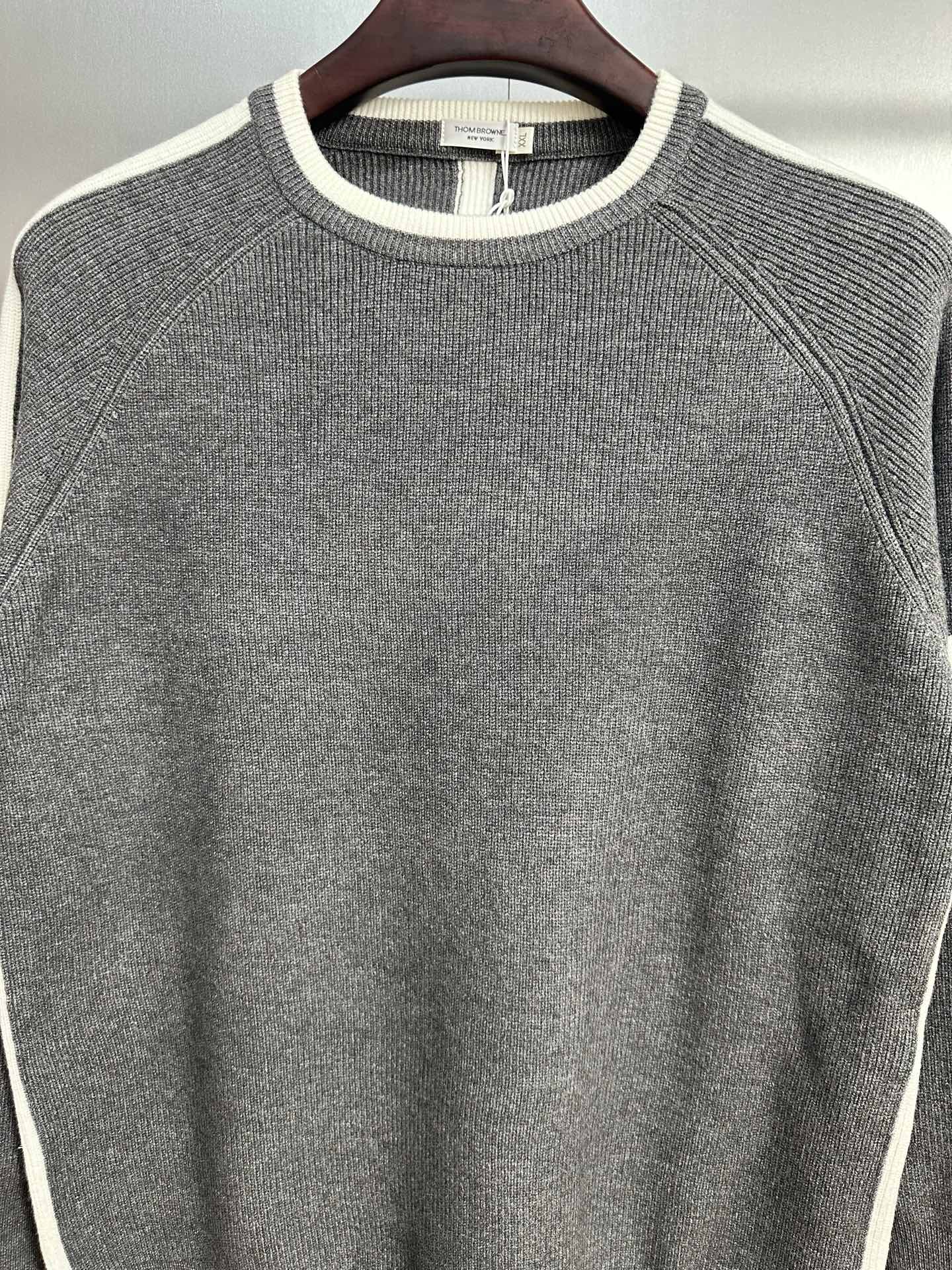 Elevate your wardrobe with this Thom Browne grey knit sweater. Features signature stripes, contrast trim, and quality fabric. Perfect for any occasion.