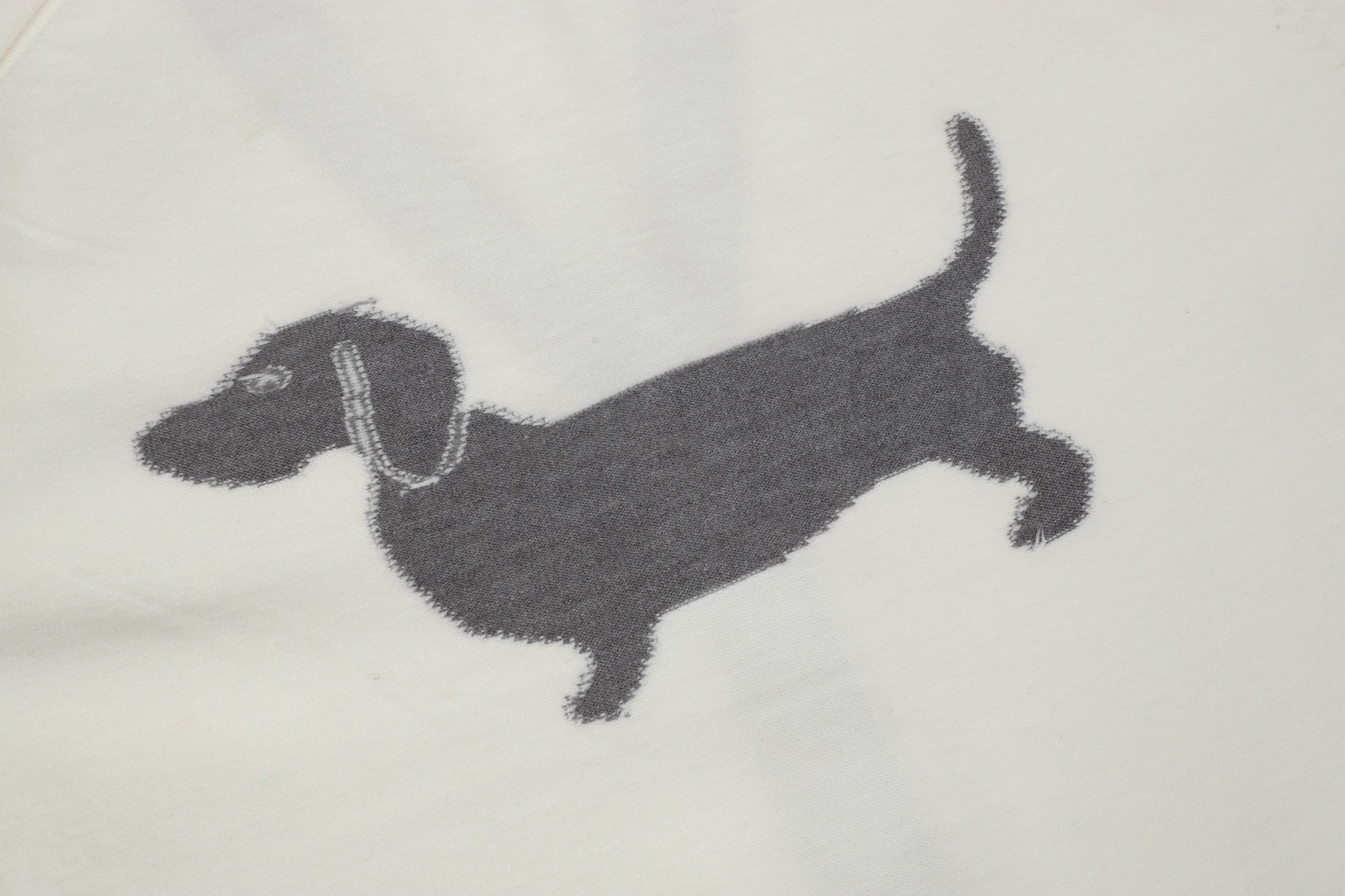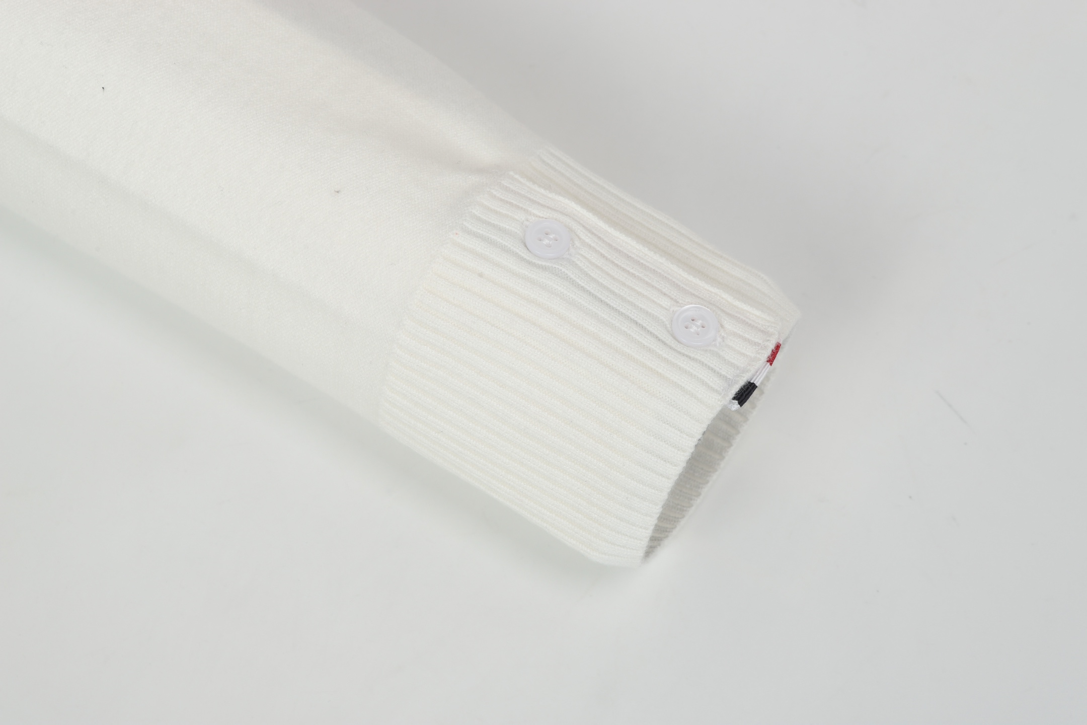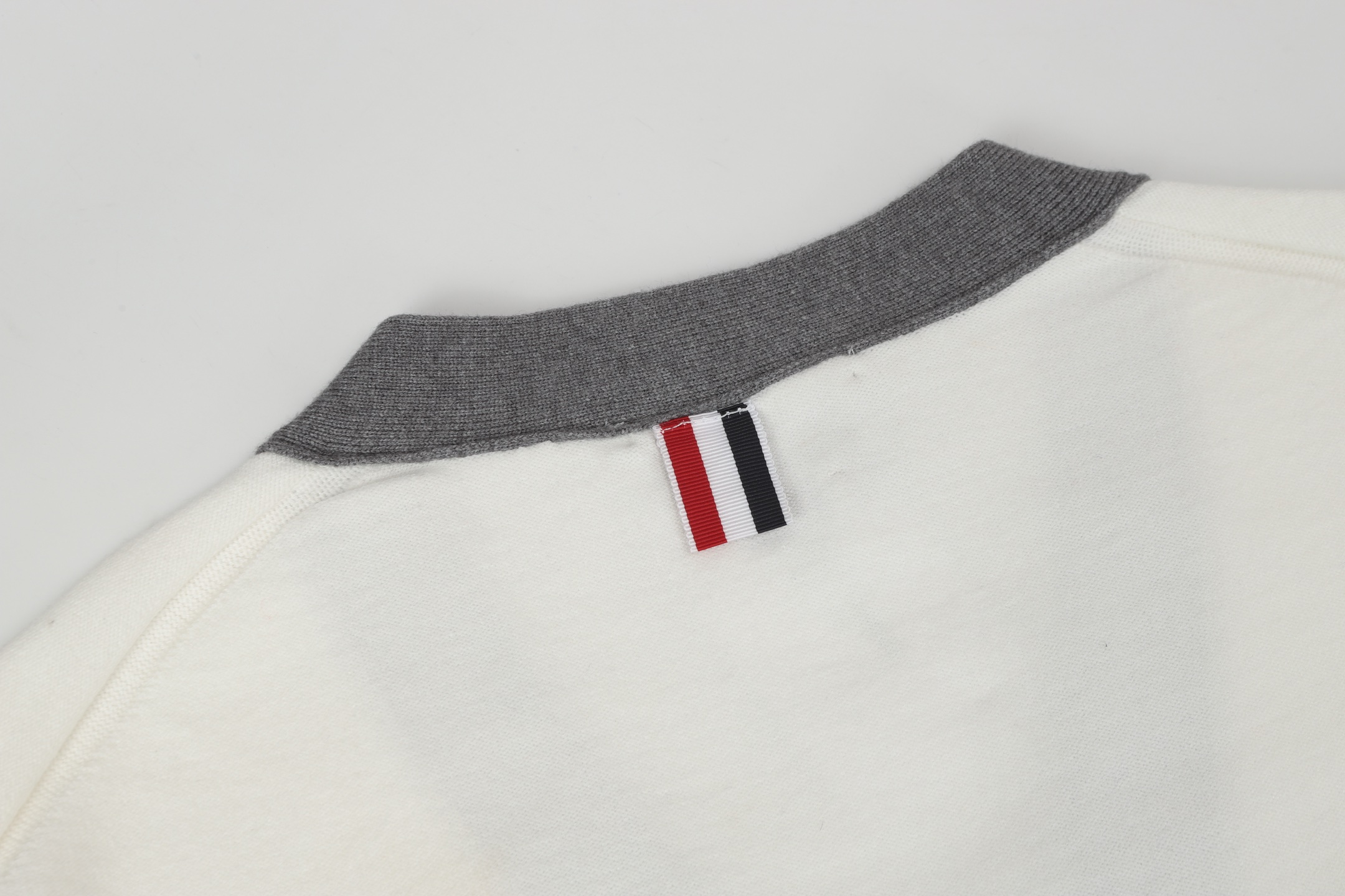 - Signature Thom Browne four-stripe detail on the left sleeve.