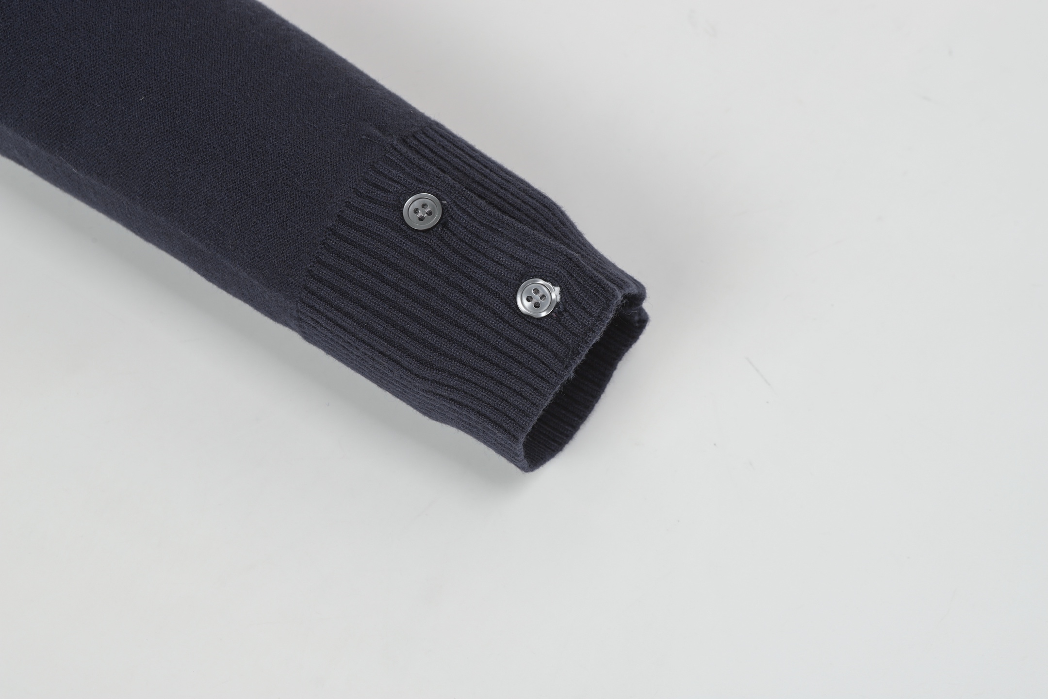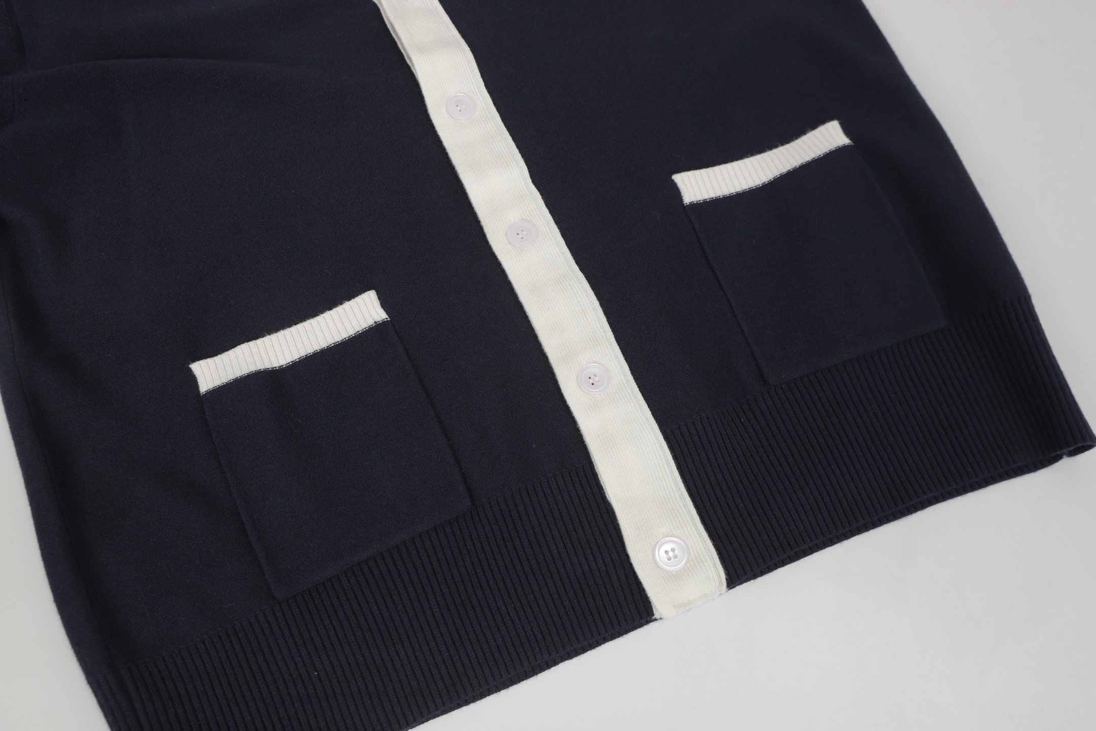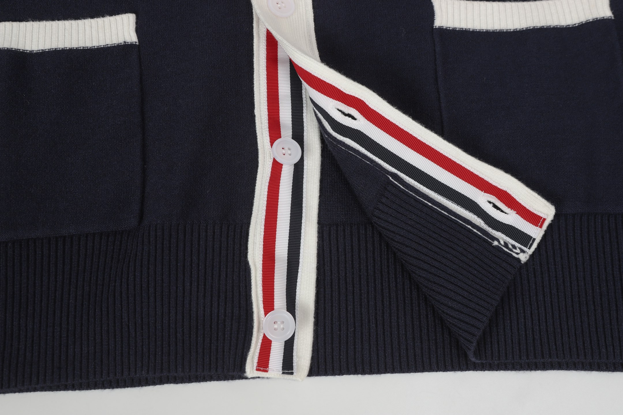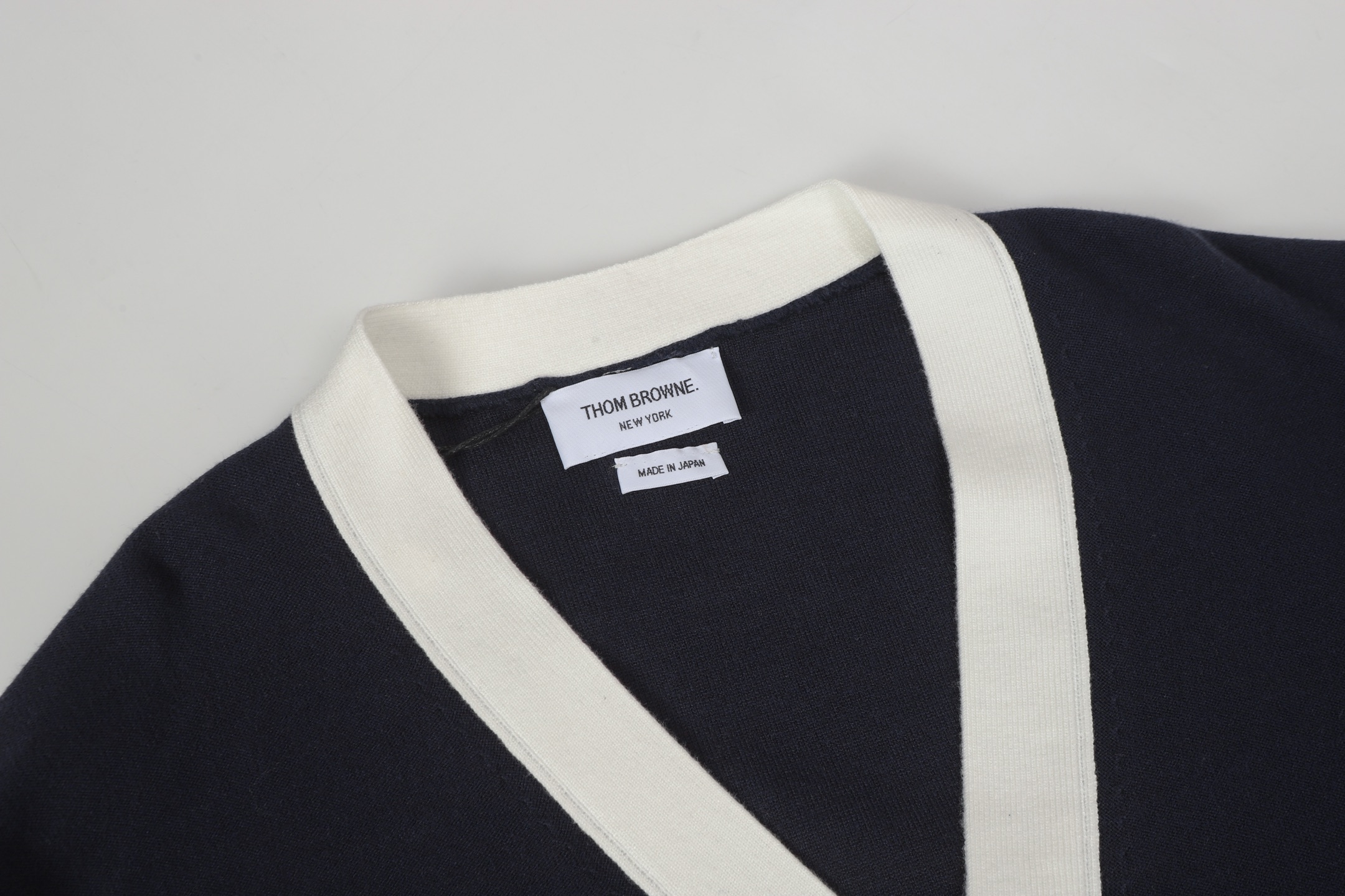 Tags: Long Sleeve Cardigan, Navy And White Cardigan, Preppy Style Sweater, Slim Fit Sweater, Thom Browne Cardigan, V Neck Knitwear
