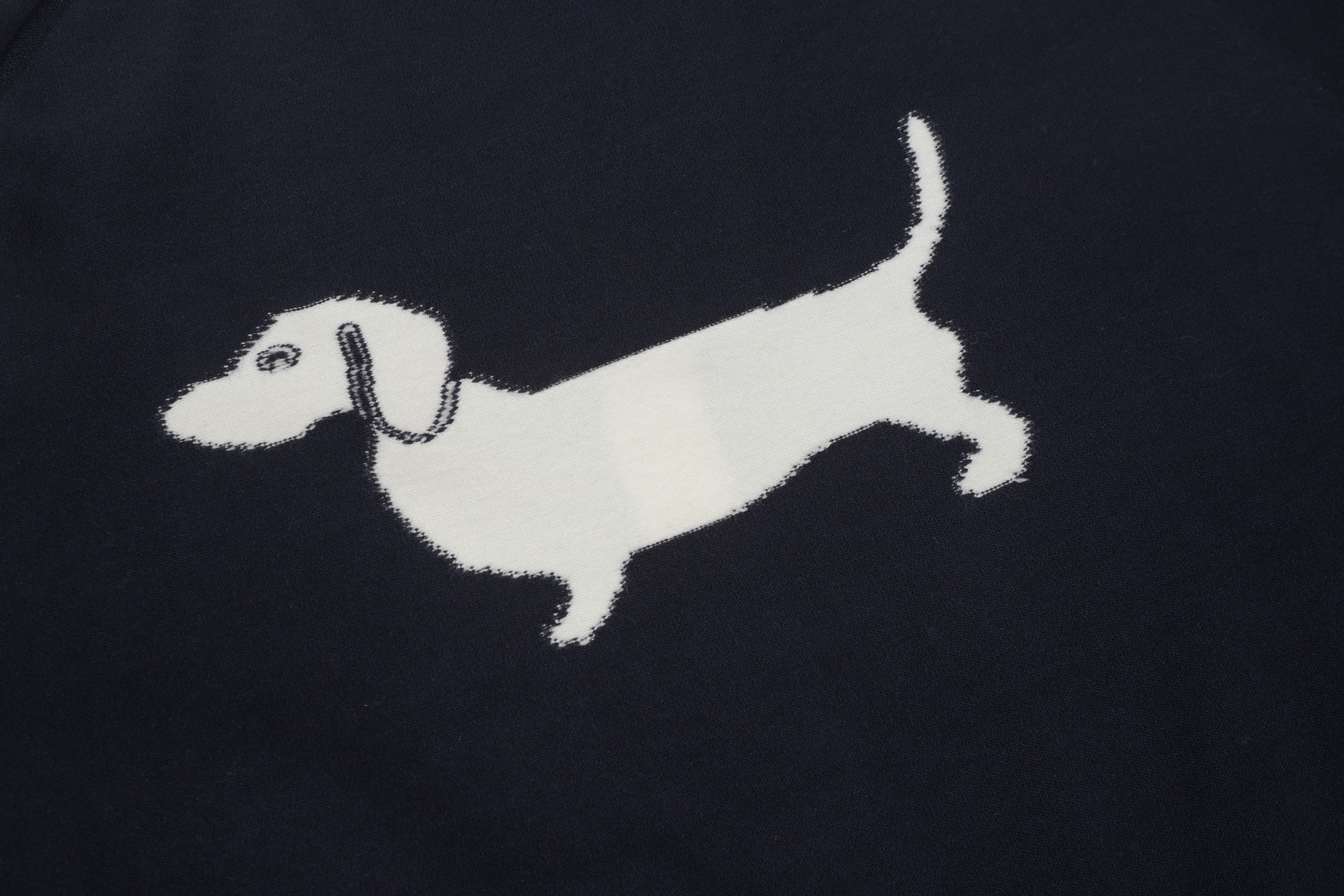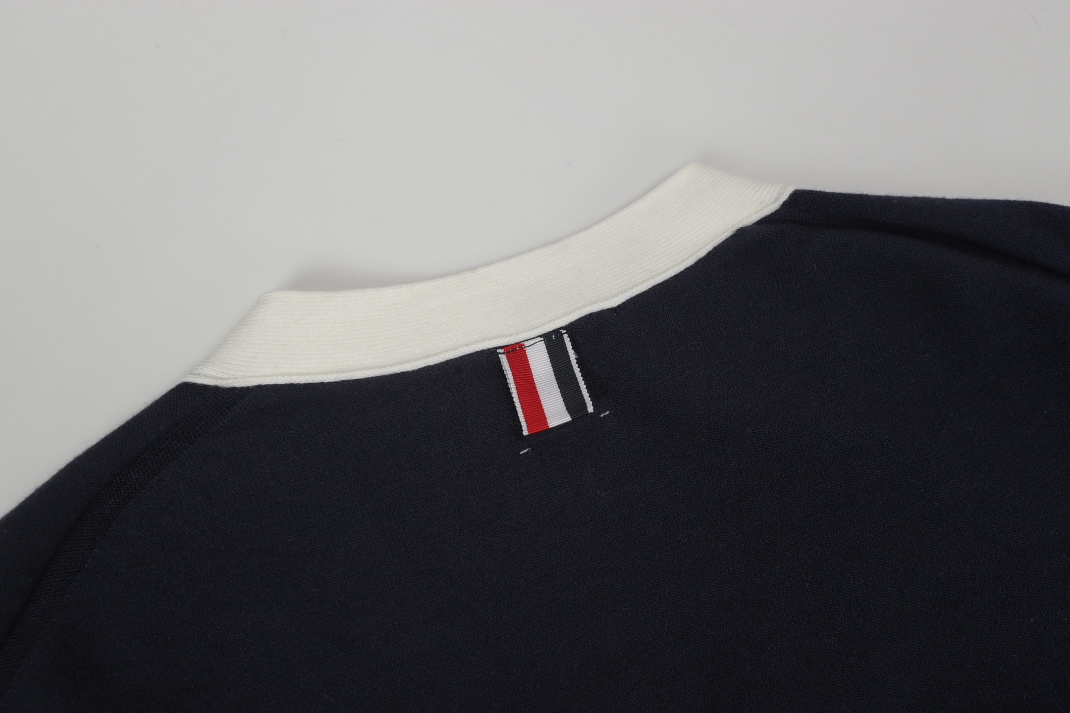 - Long sleeves with Thom Browne's signature four-stripe detail on the upper arm.