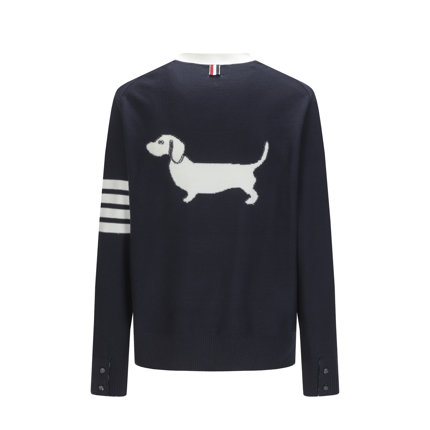 Classic Thom Browne cardigan. Navy knit with white trim, V-neck, and signature striped sleeve detail. Perfect for a refined, preppy look.