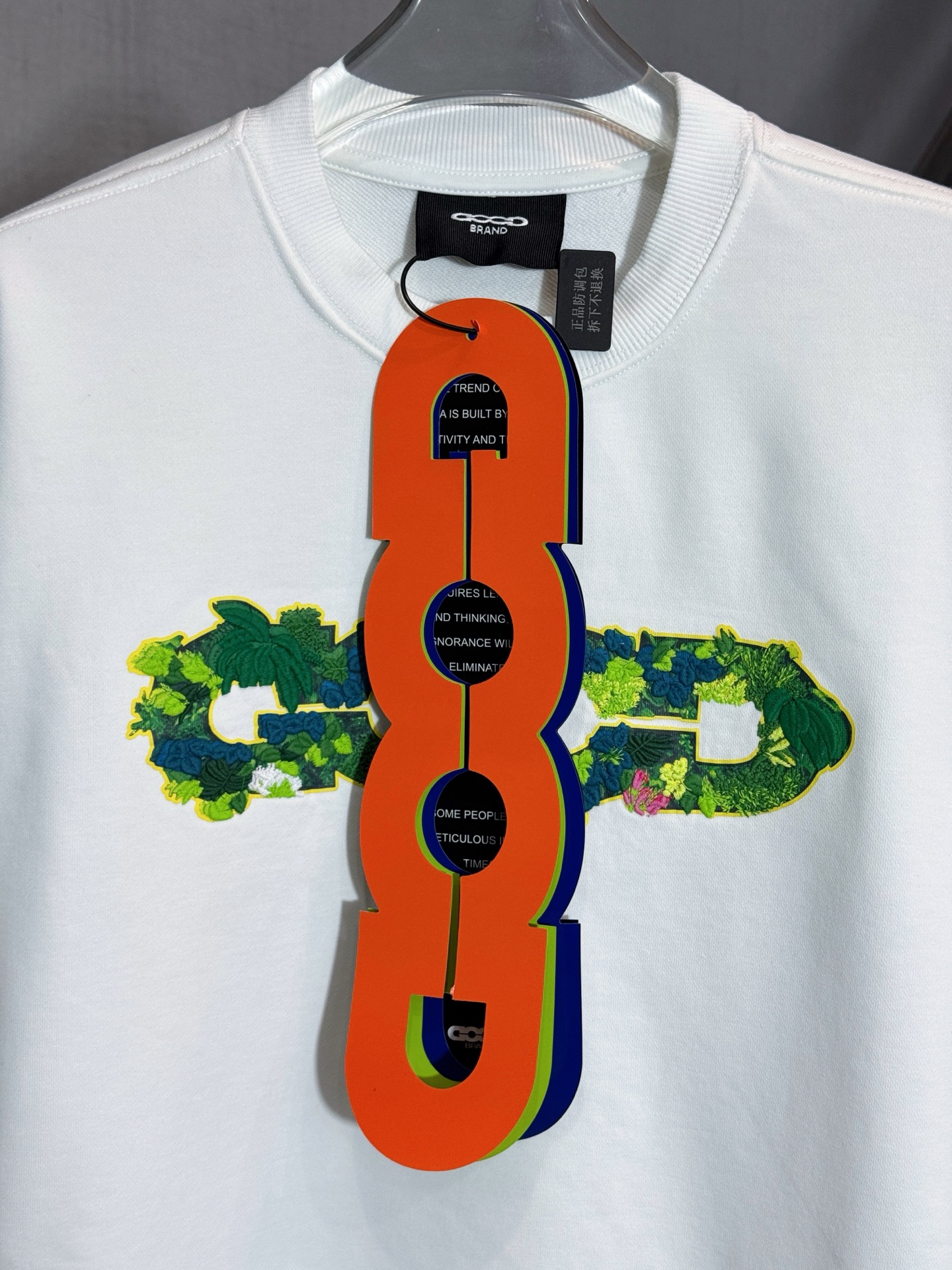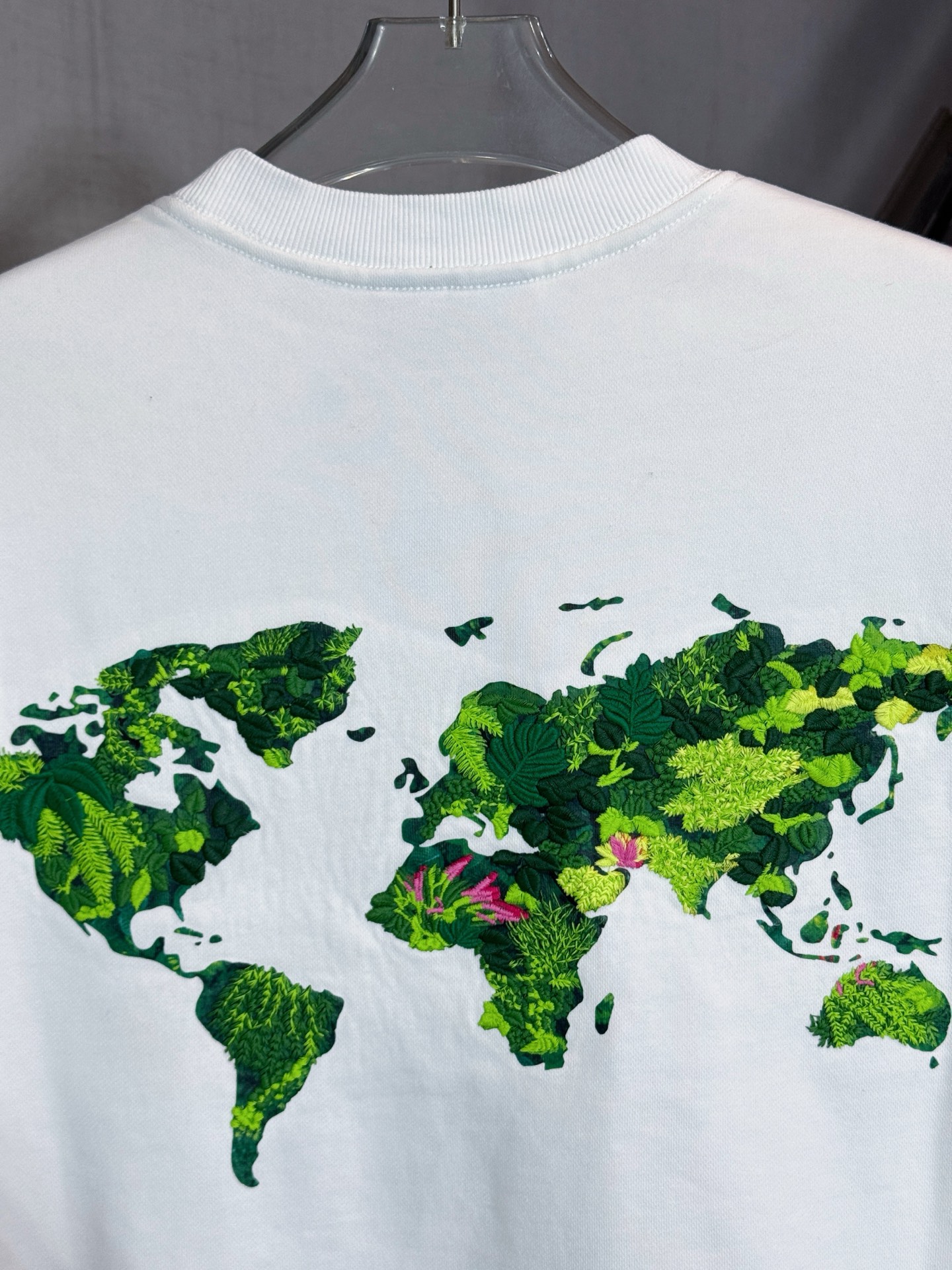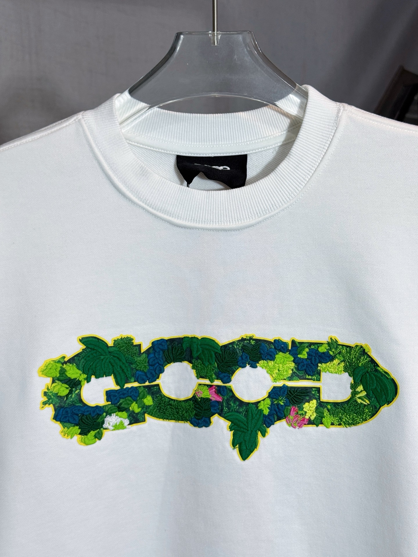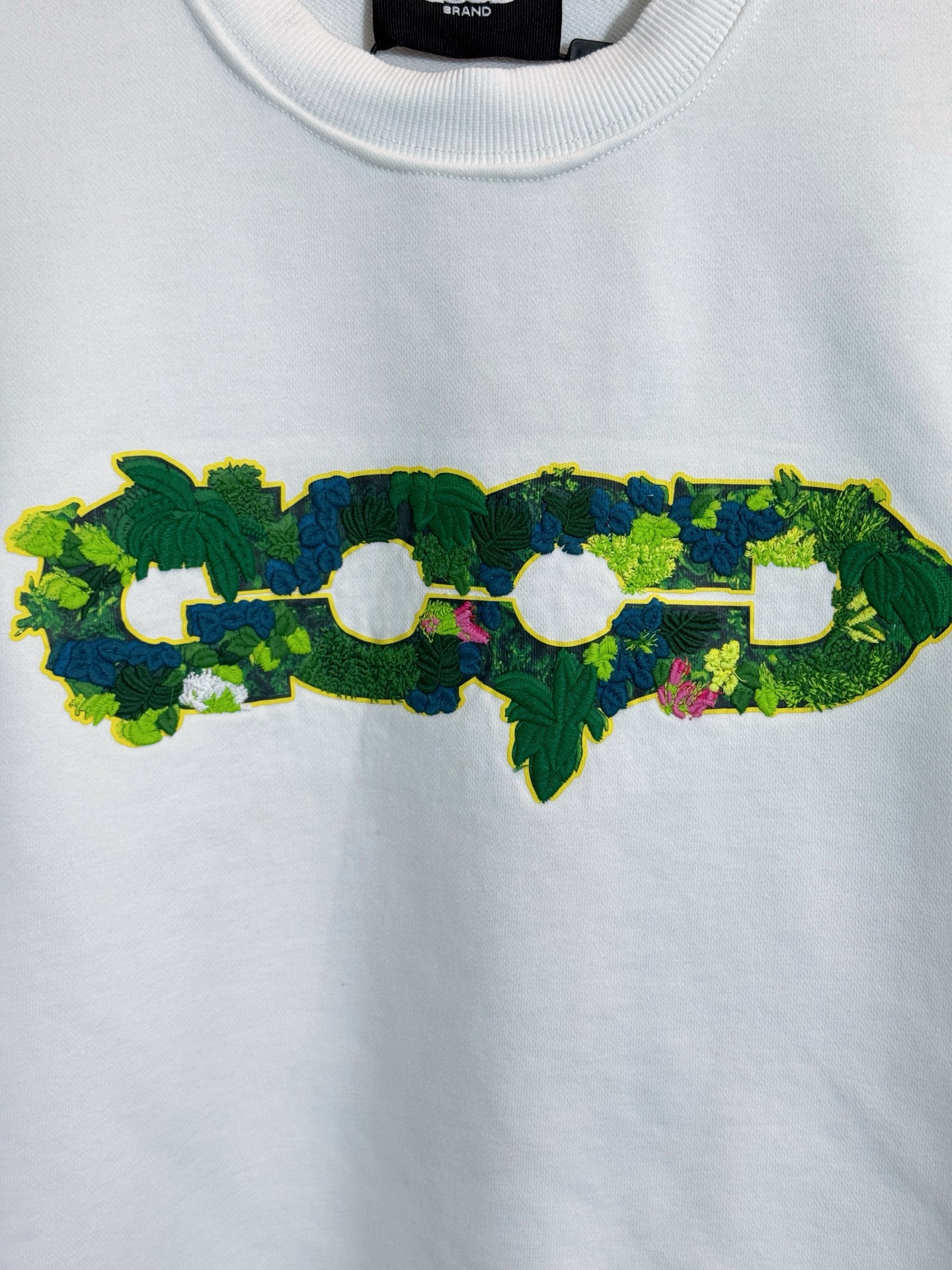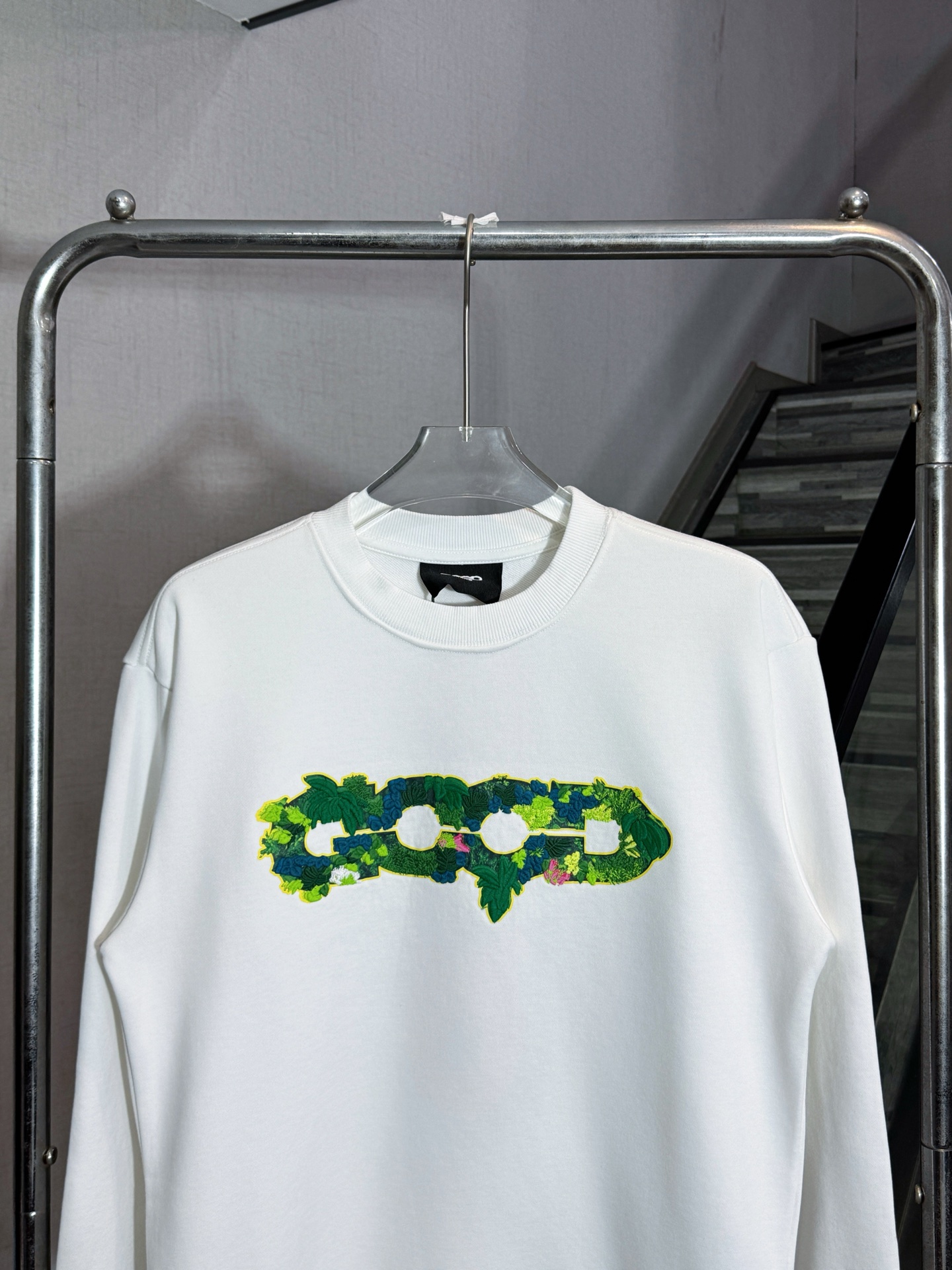 Elevate your style with this white cotton sweatshirt, featuring intricate green floral embroidery and a comfortable, relaxed fit. Perfect for everyday wear.