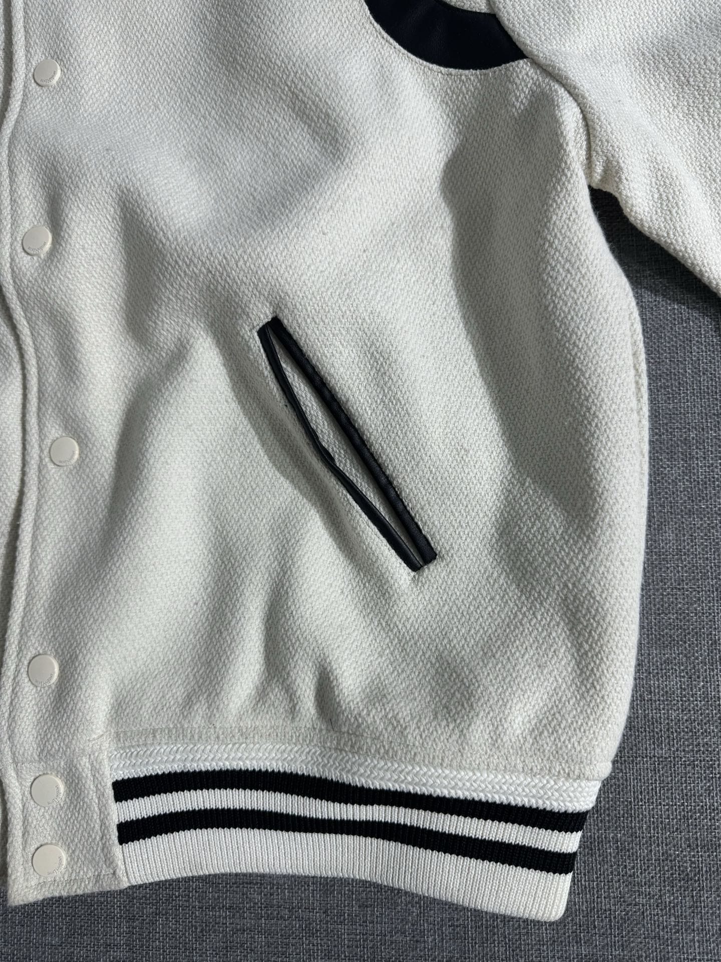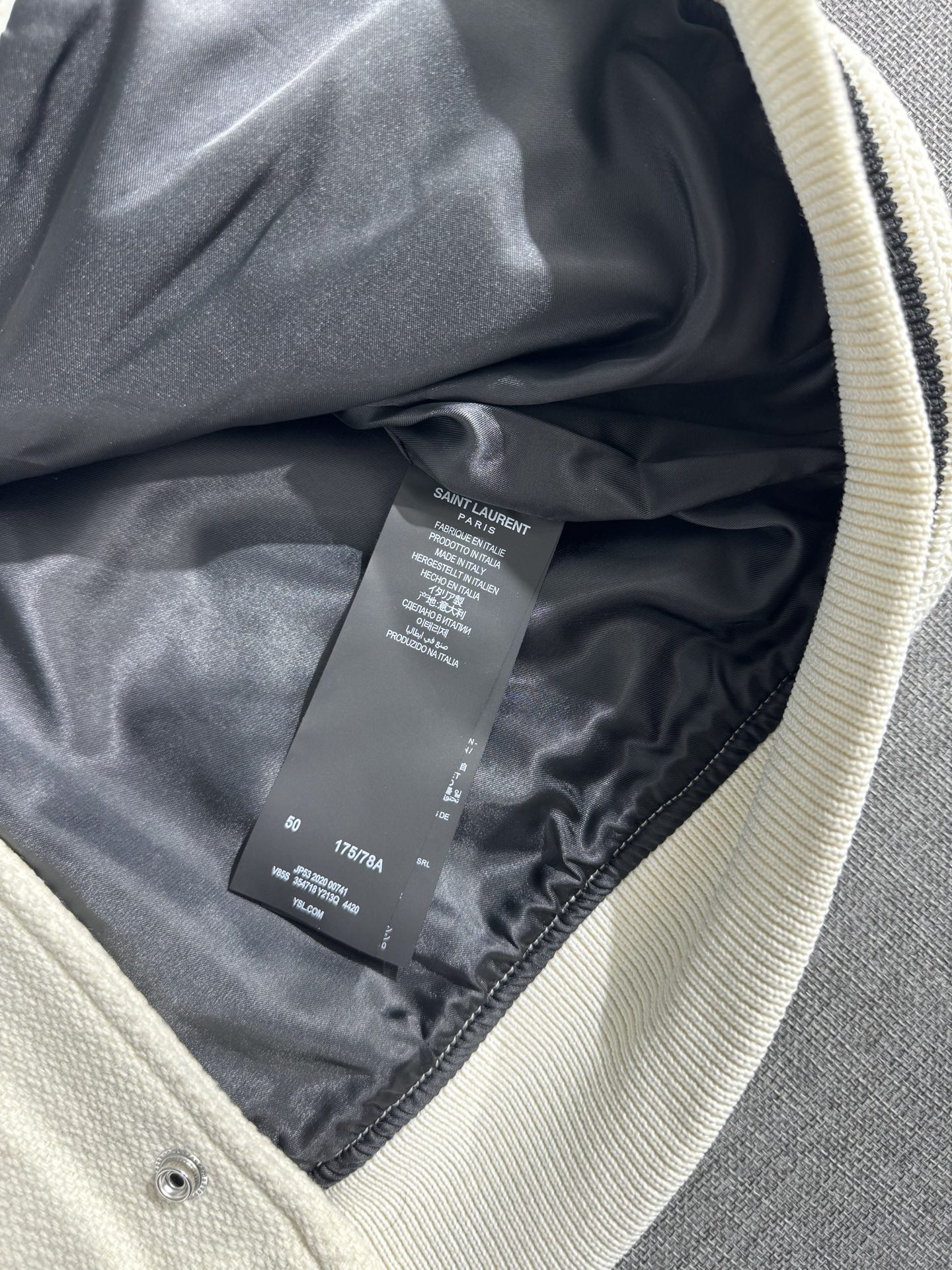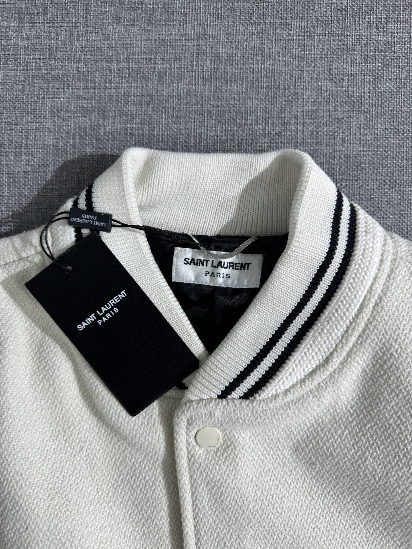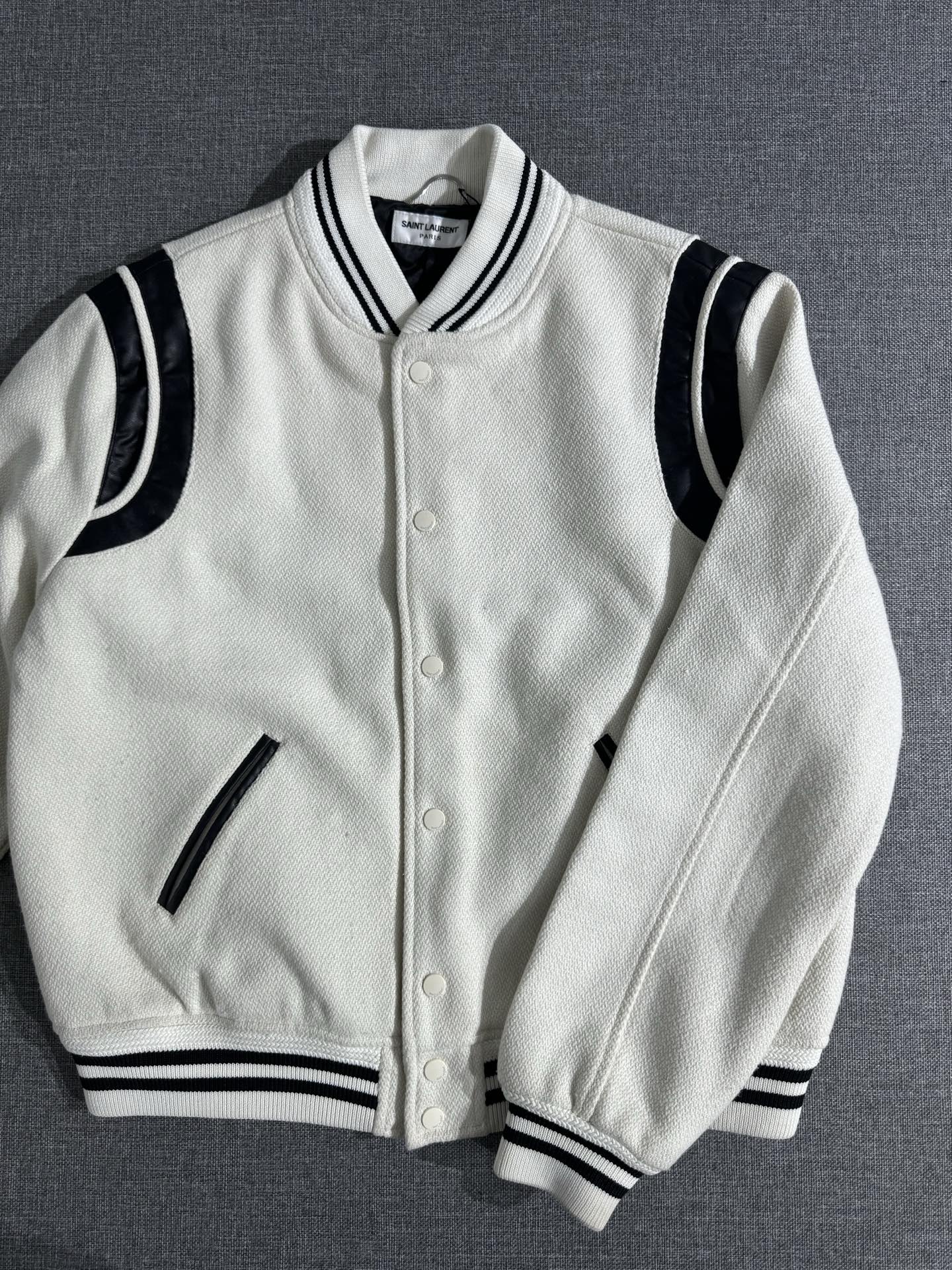 Tags: Designer Varsity Jacket, Leather Trim Jacket, Luxury Outerwear, Saint Laurent Baseball Jacket, Wool And Leather Jacket, Wool Blend Bomber Jacket