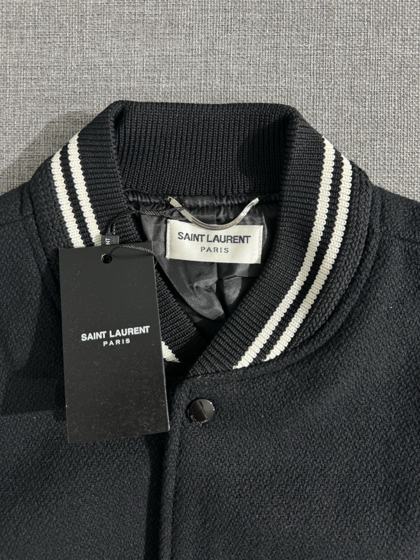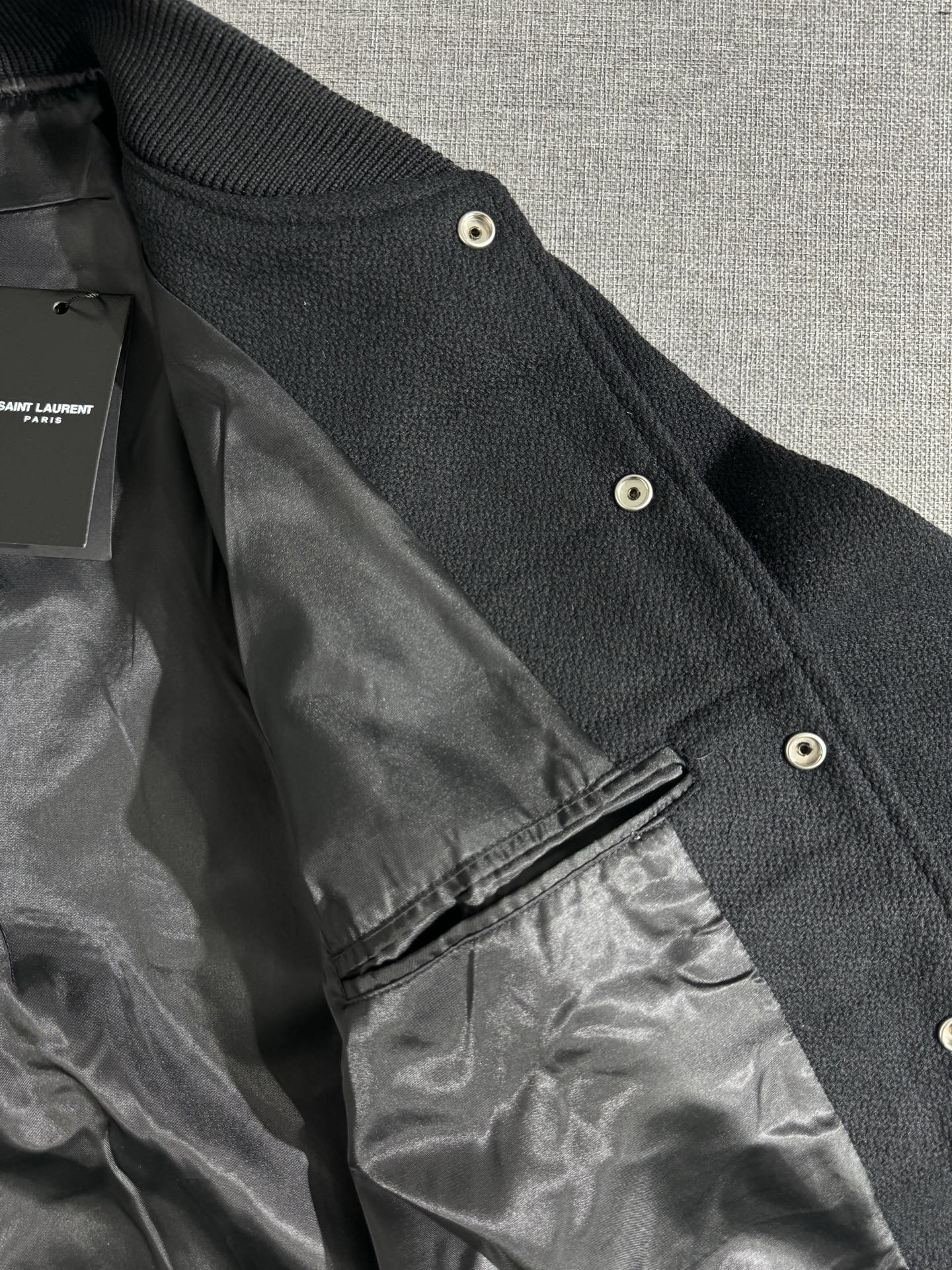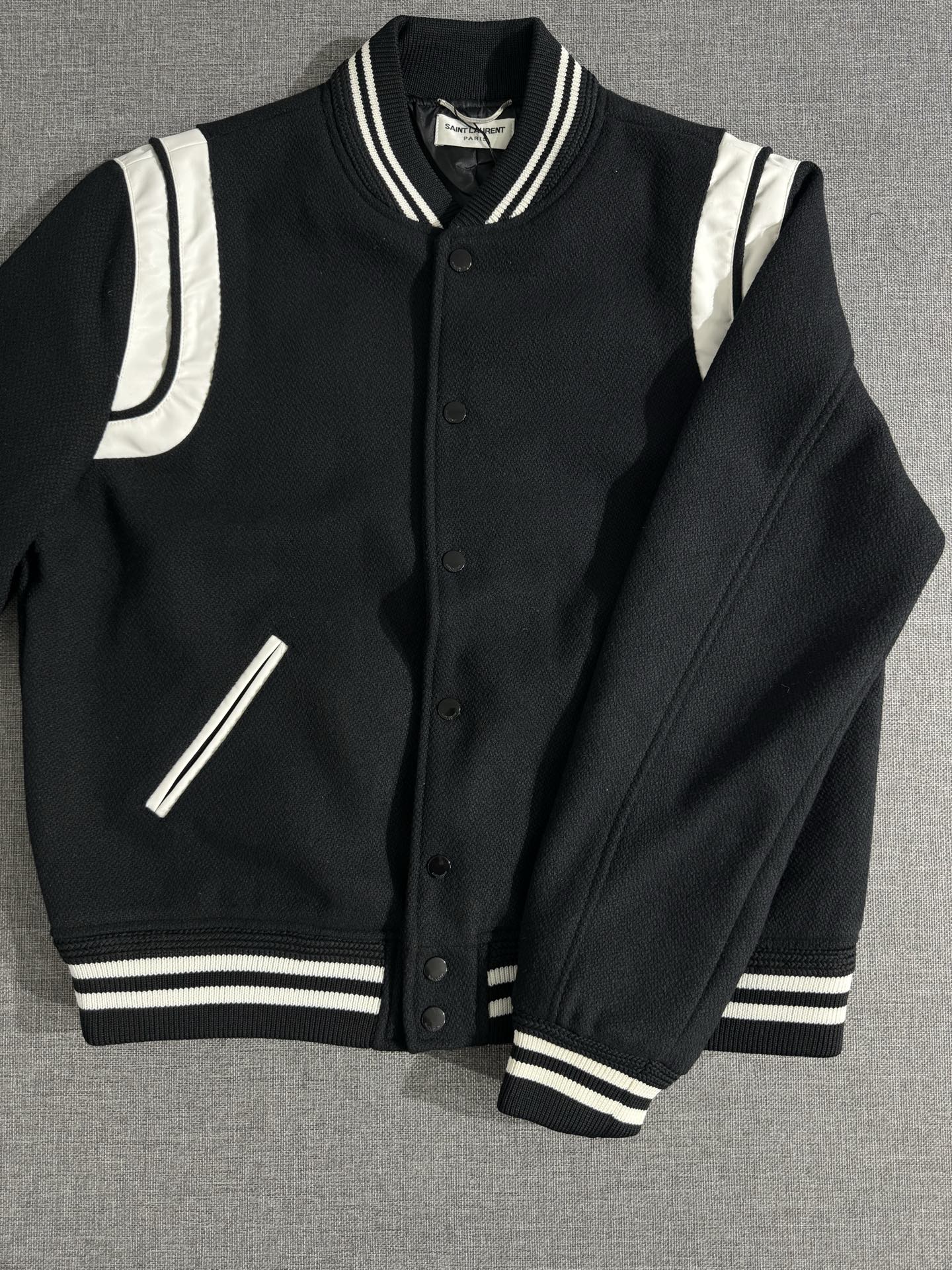 Tags: Designer Varsity Jacket, Leather Sleeve Jacket, Mens Fashion Outerwear, Saint Laurent Jacket, Wool Baseball Jacket